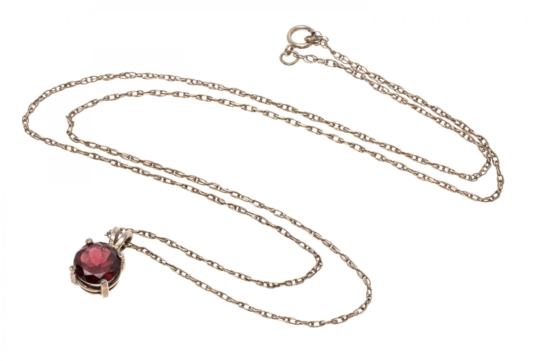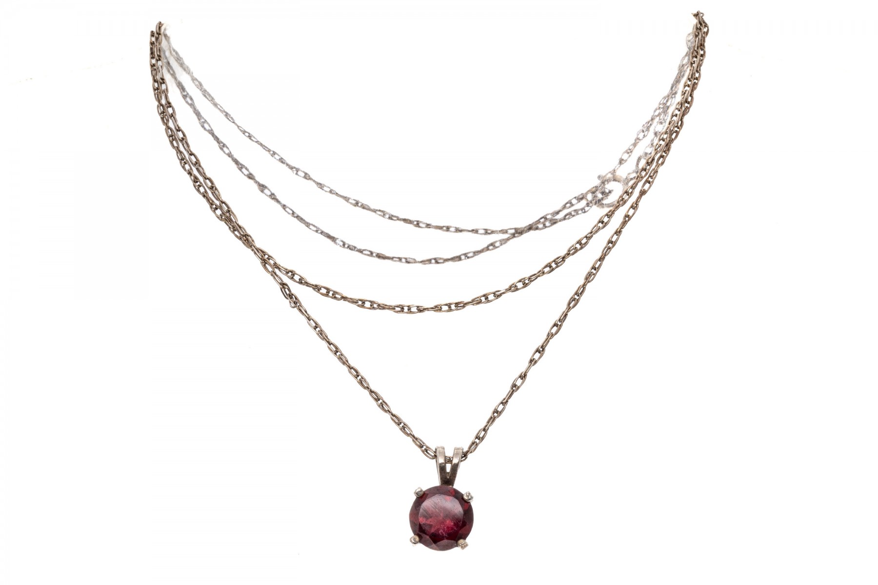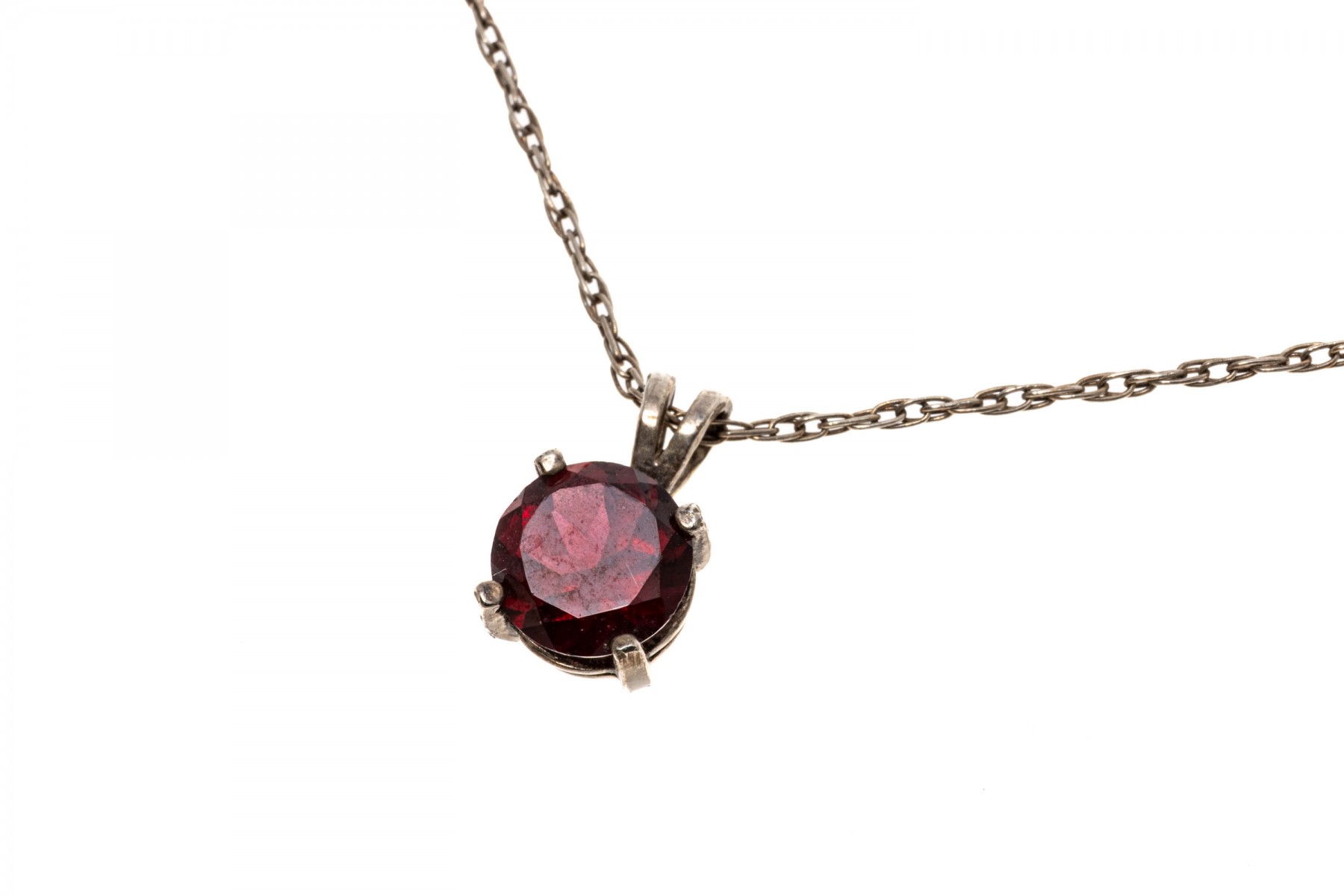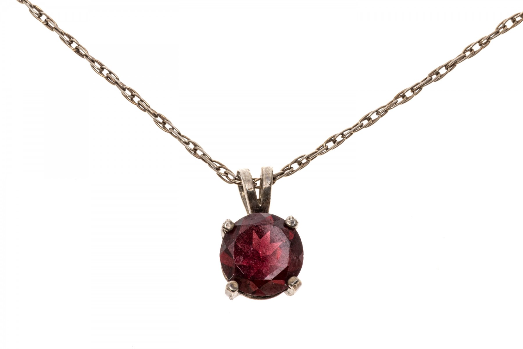A simple sterling silver pendant necklace. The helix style chain displays a pendant set with a single round faceted garnet with a rich red color, approximately 1.6 cts. Spring ring clasp.