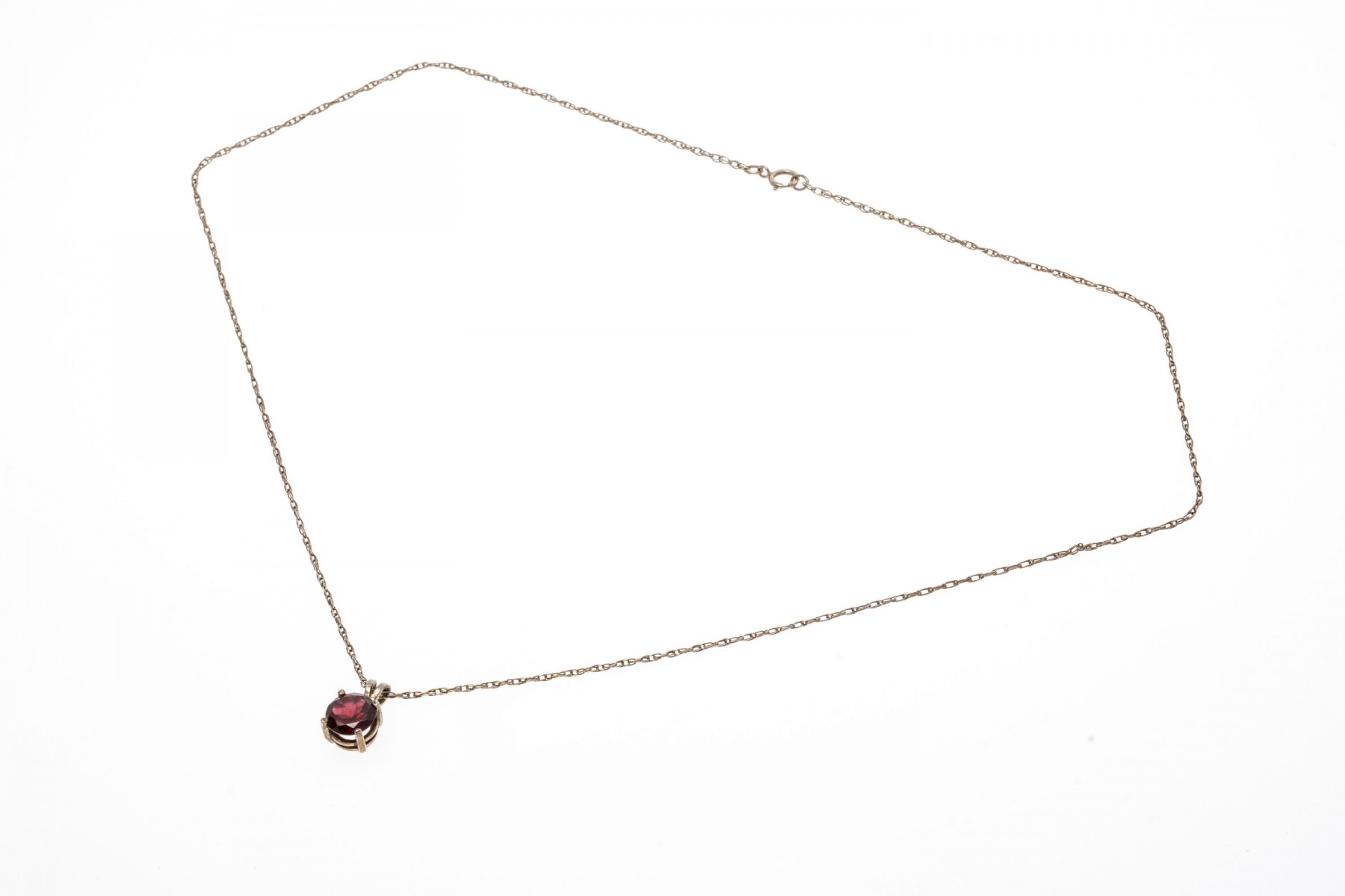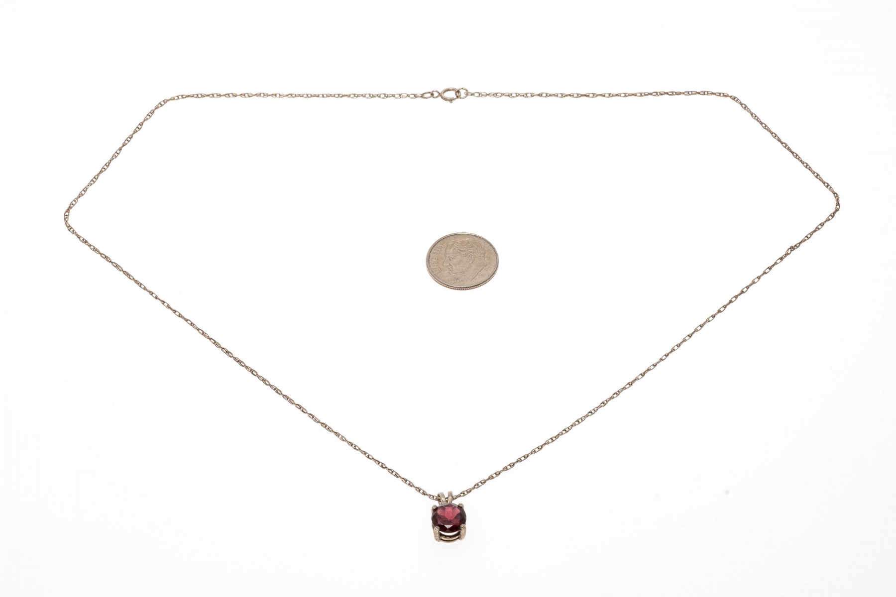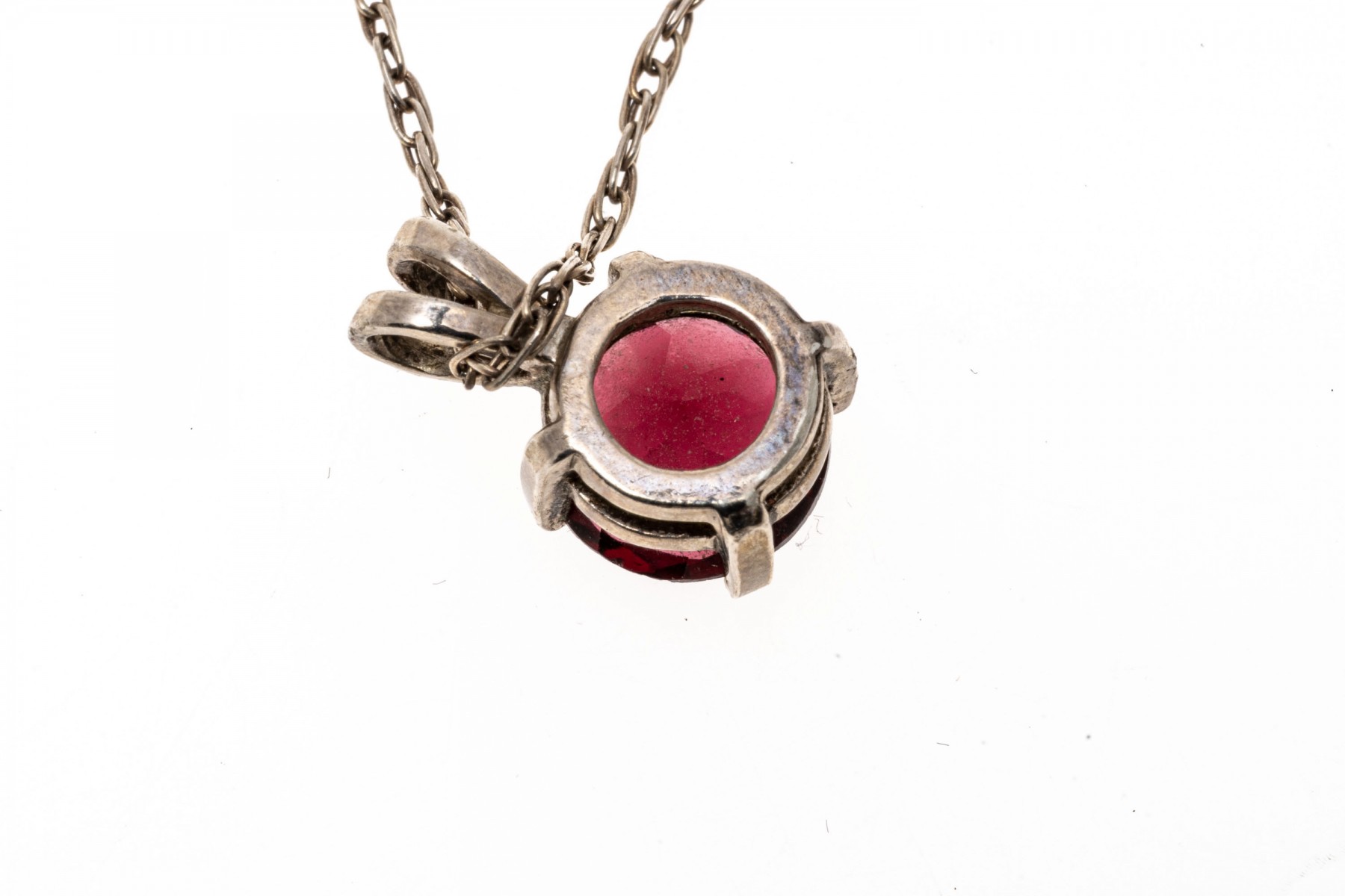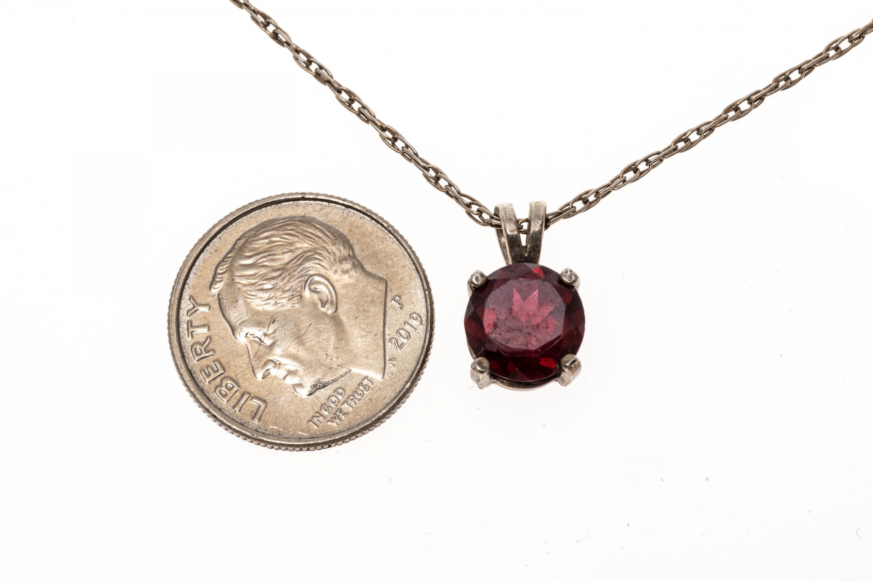A simple sterling silver pendant necklace. The helix style chain displays a pendant set with a single round faceted garnet with a rich red color, approximately 1.6 cts. Spring ring clasp.