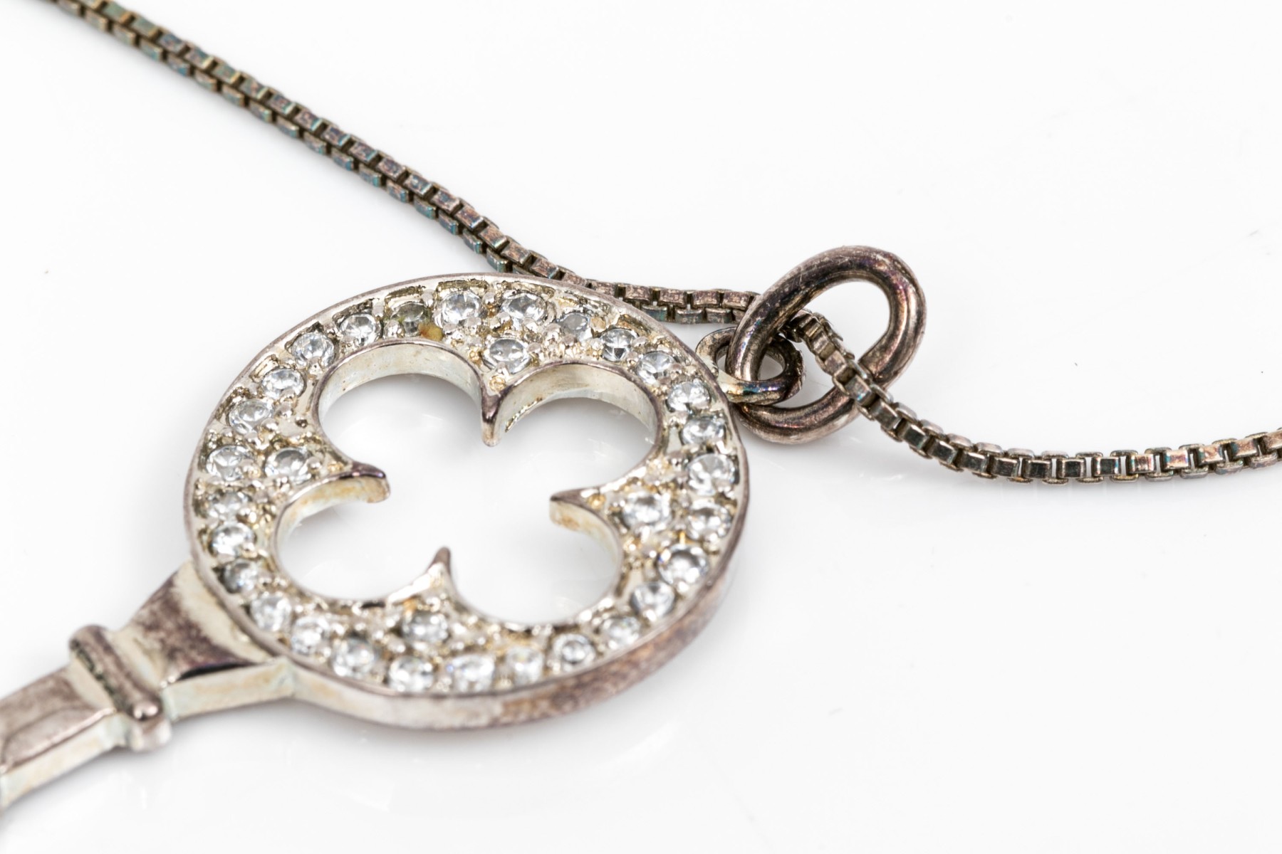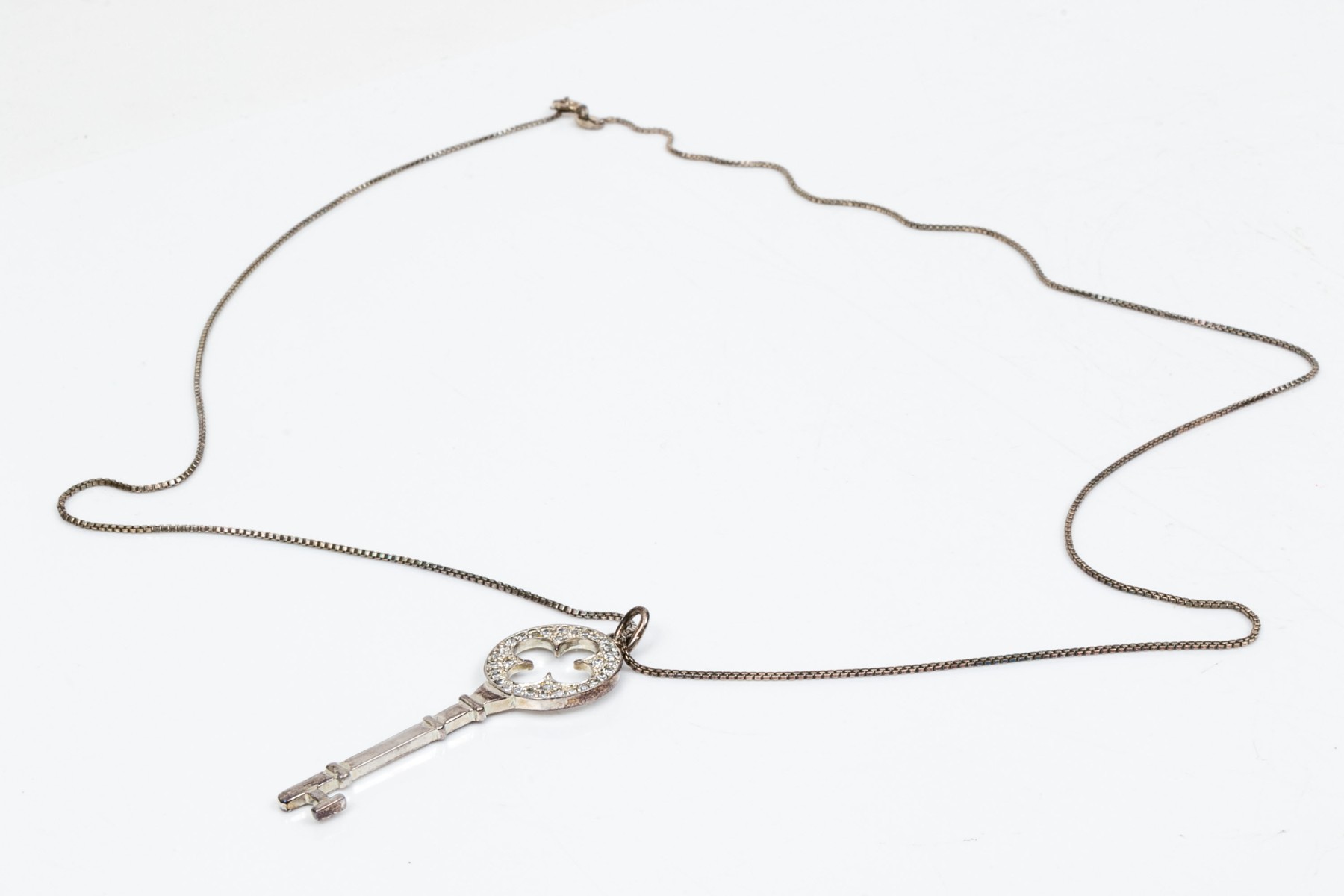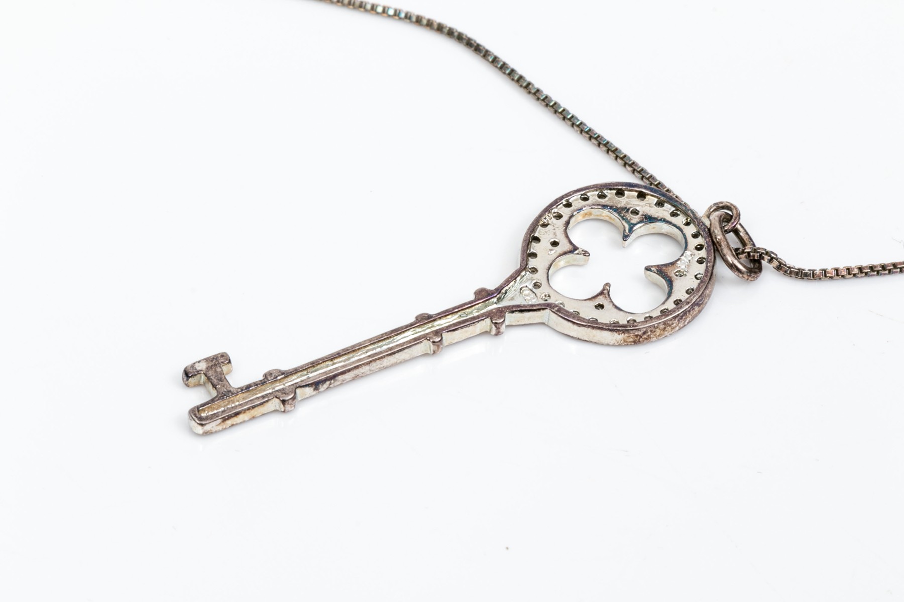 Sterling silver pendant necklace. Long box chain necklace displays a key form pendant. Pave set into the head of the key are round cut white cubic zirconia. Spring ring clasp.