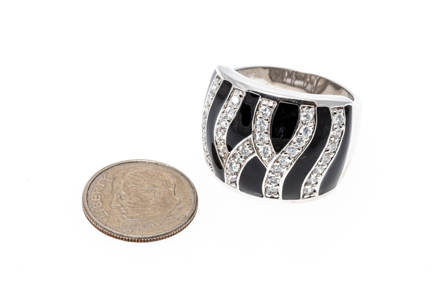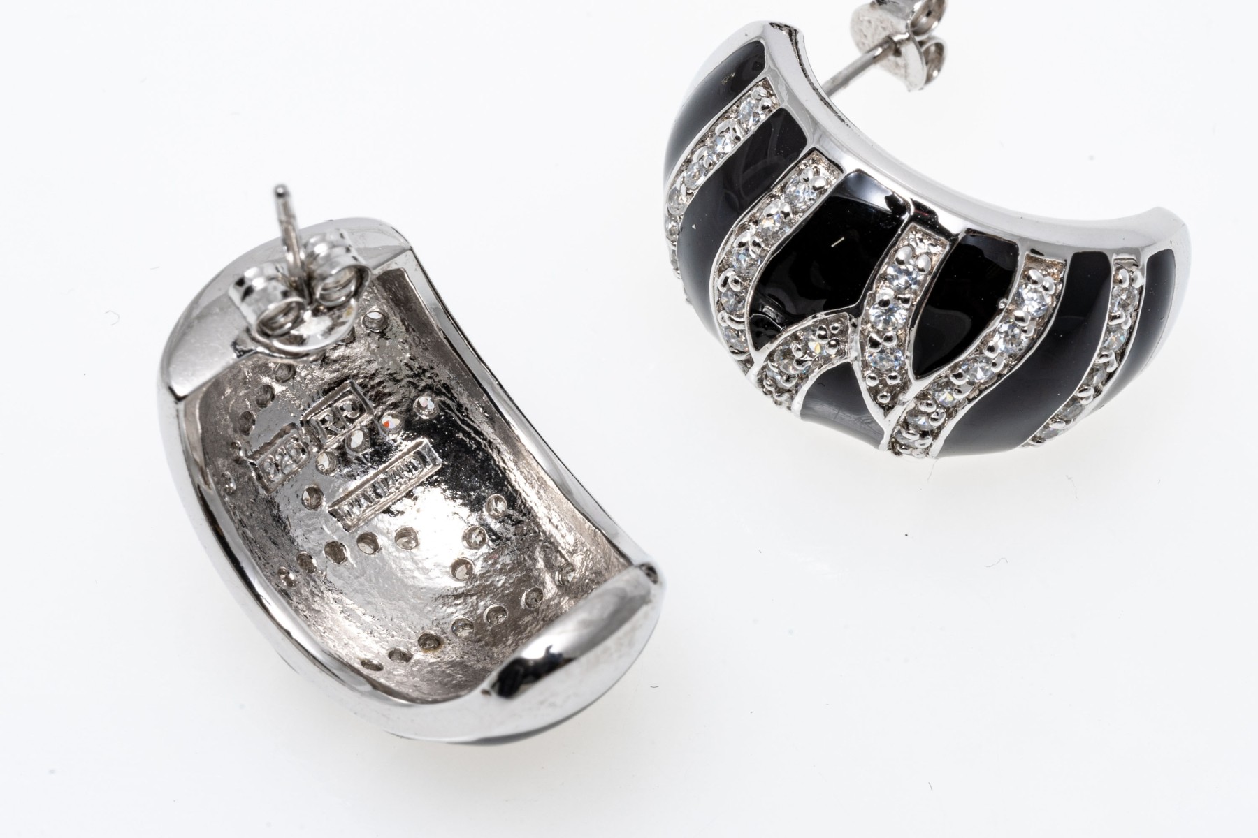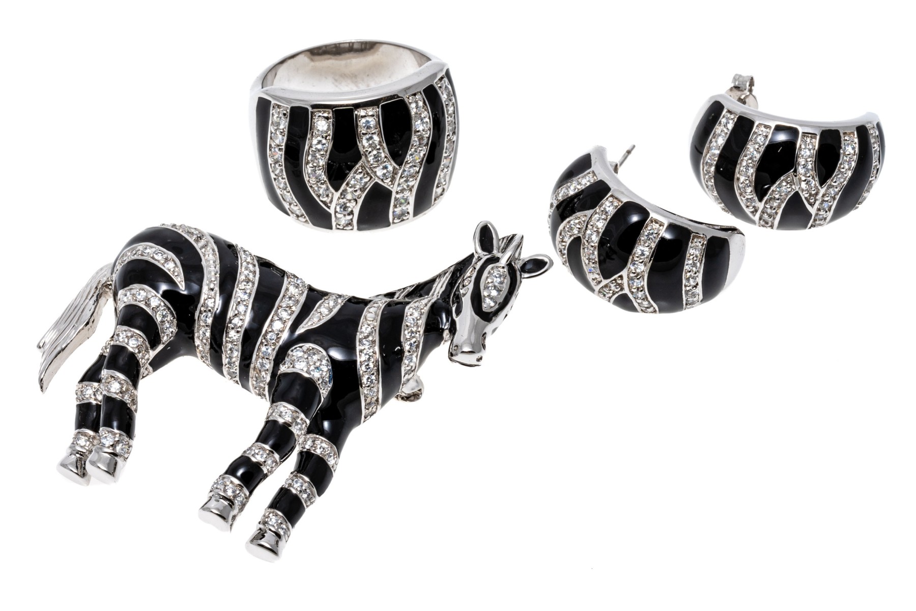 Collection of sterling silver, black enamel and white cubic zirconia jewelry. Zebra form brooch with zebra print J-hoop earrings and dome ring. Ring size 9.75. Earrings have post and clutch backings.