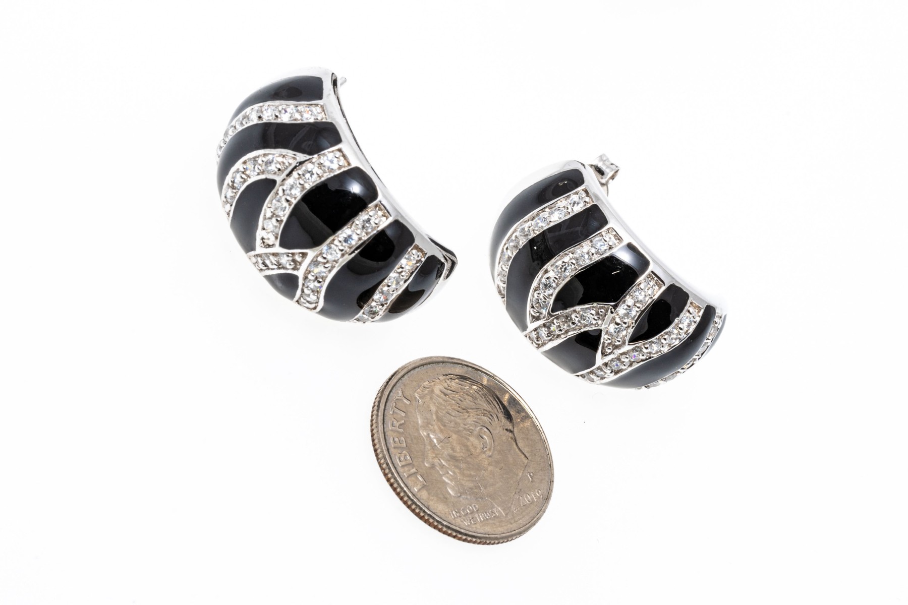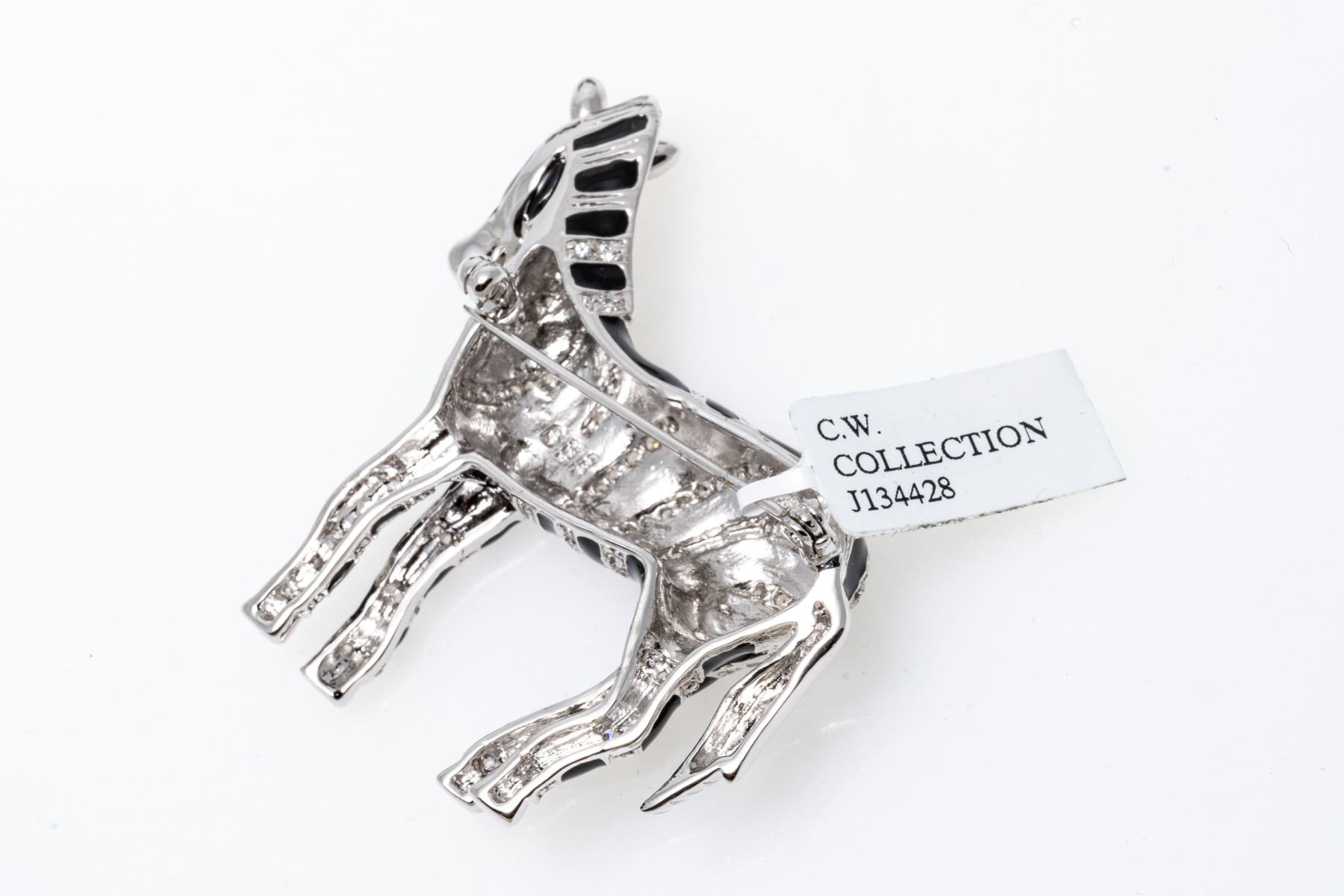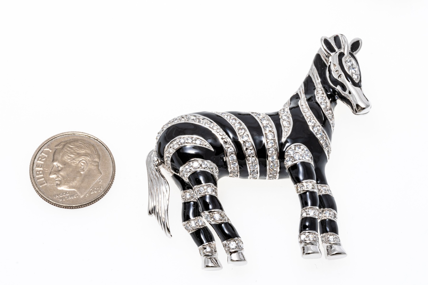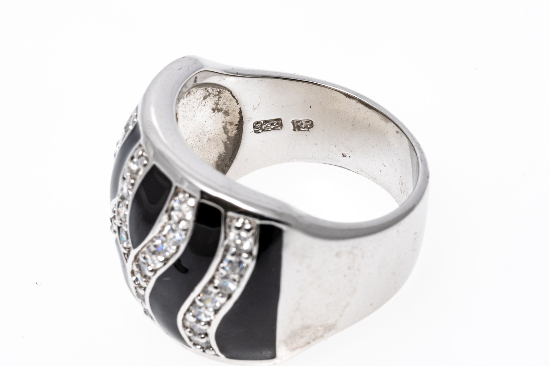 Collection of sterling silver, black enamel and white cubic zirconia jewelry. Zebra form brooch with zebra print J-hoop earrings and dome ring. Ring size 9.75. Earrings have post and clutch backings.
