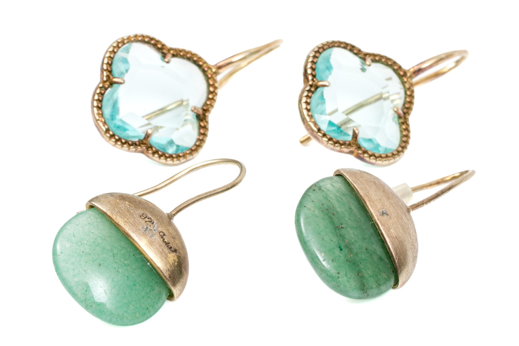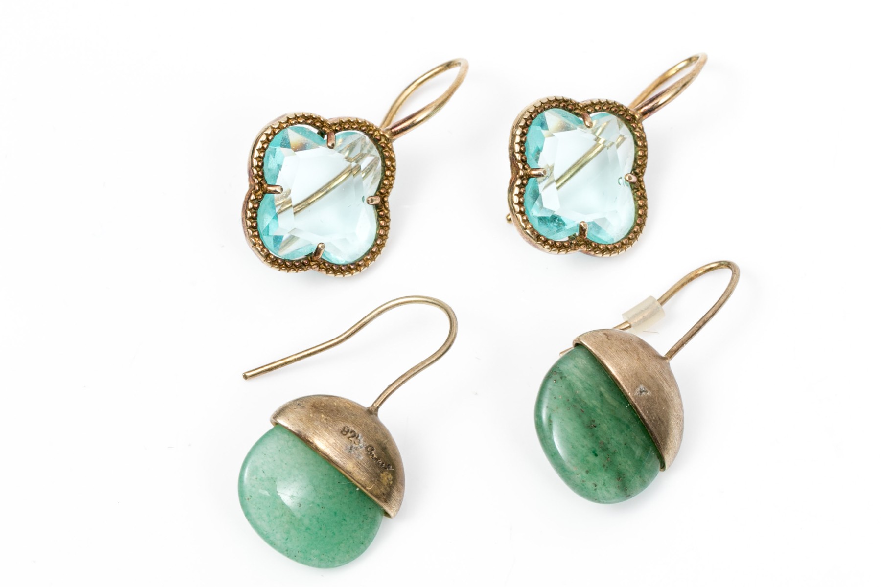 Two pairs of sterling silver earrings. The first pair is by Carolee and has sterling tops and display aventurine stones. The second pair has a quatrefoil form set with light blue cubic zirconia. Hook backings.