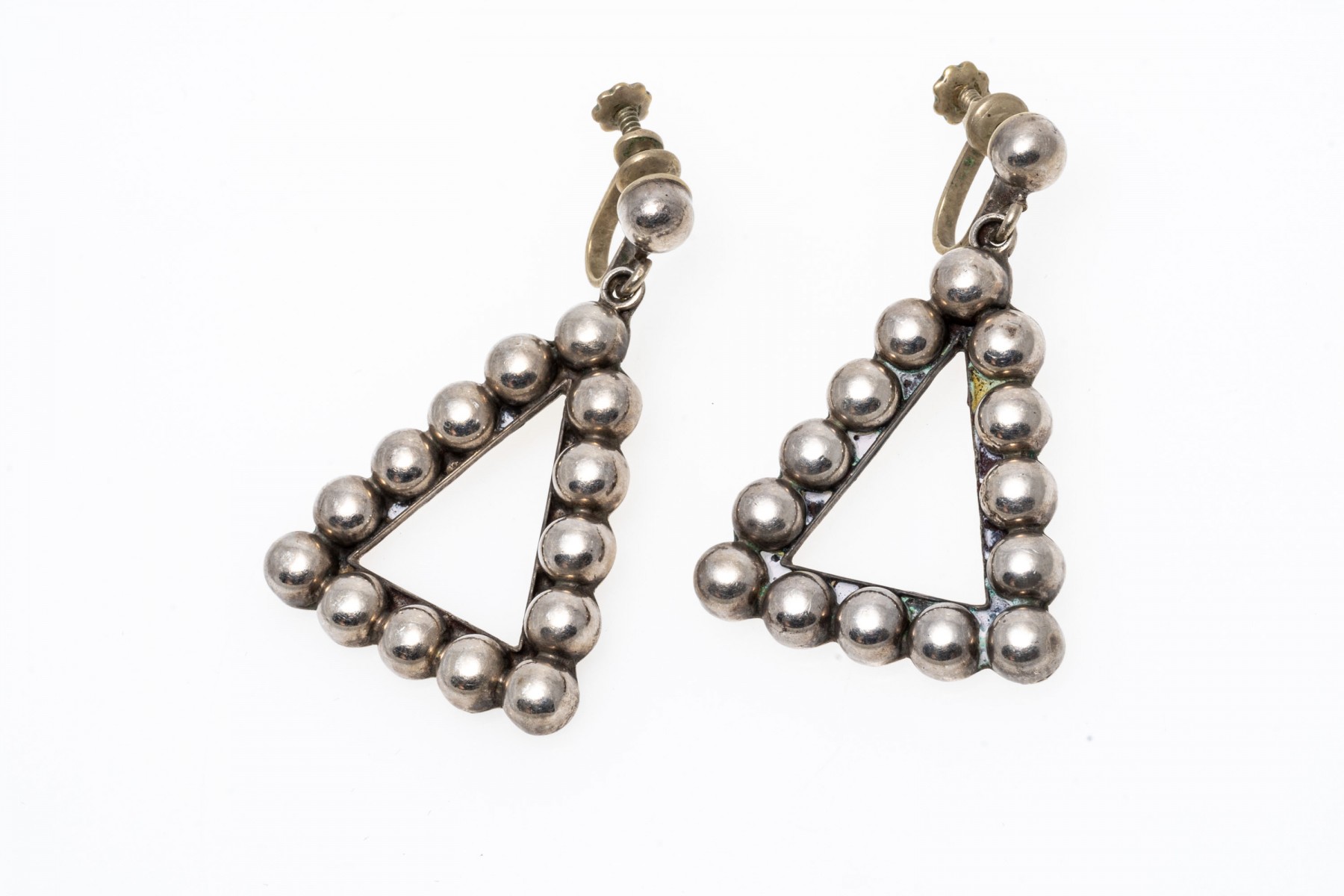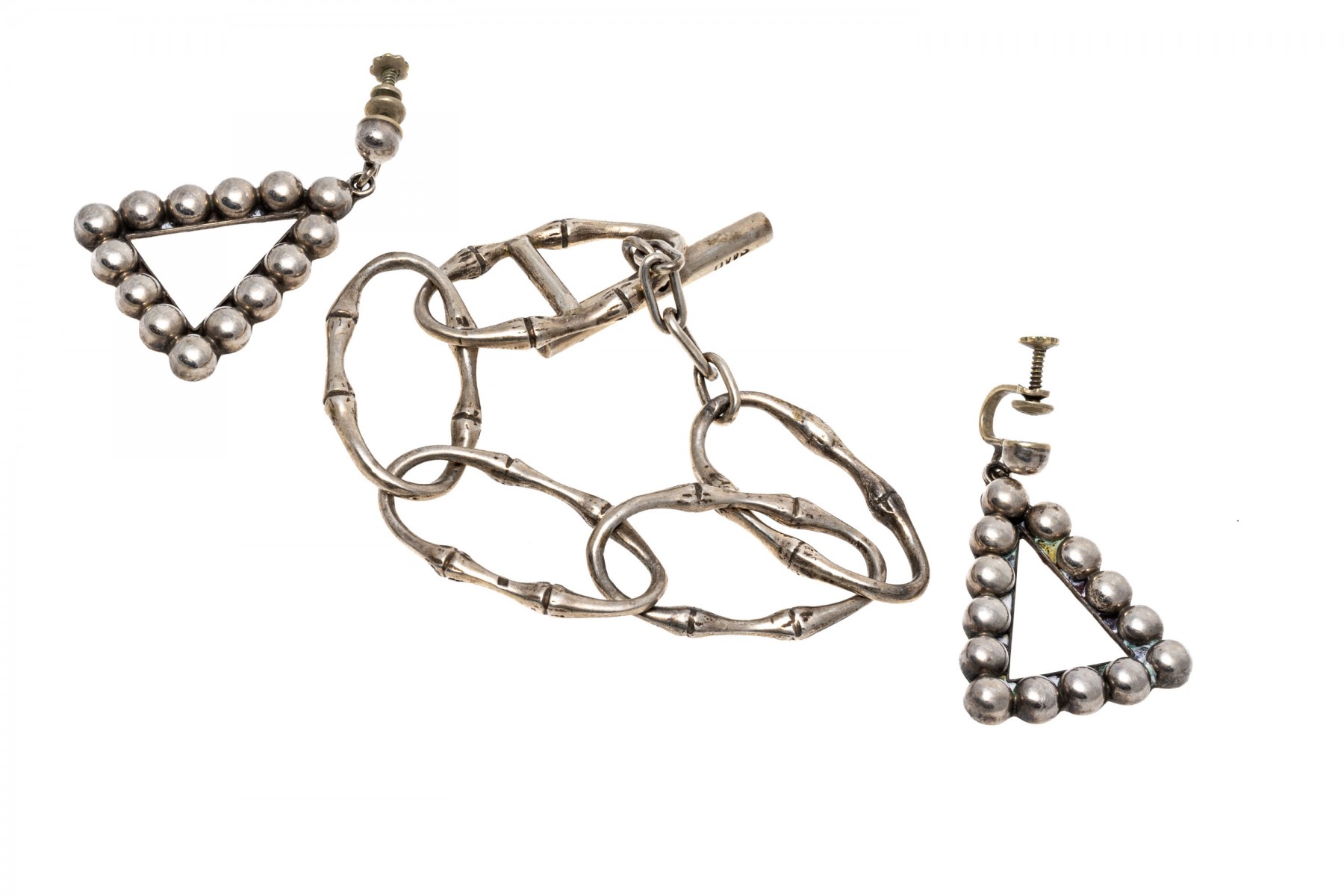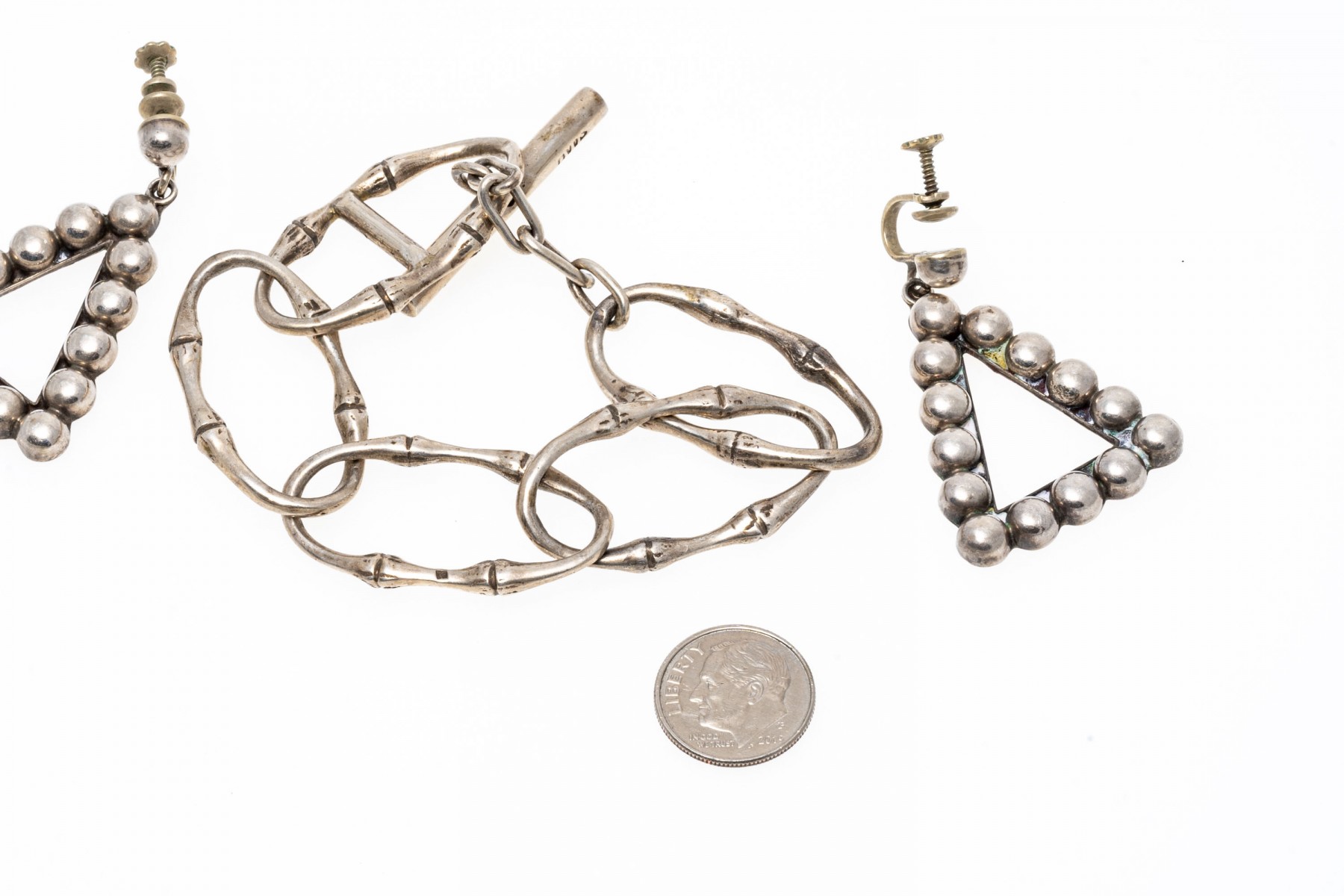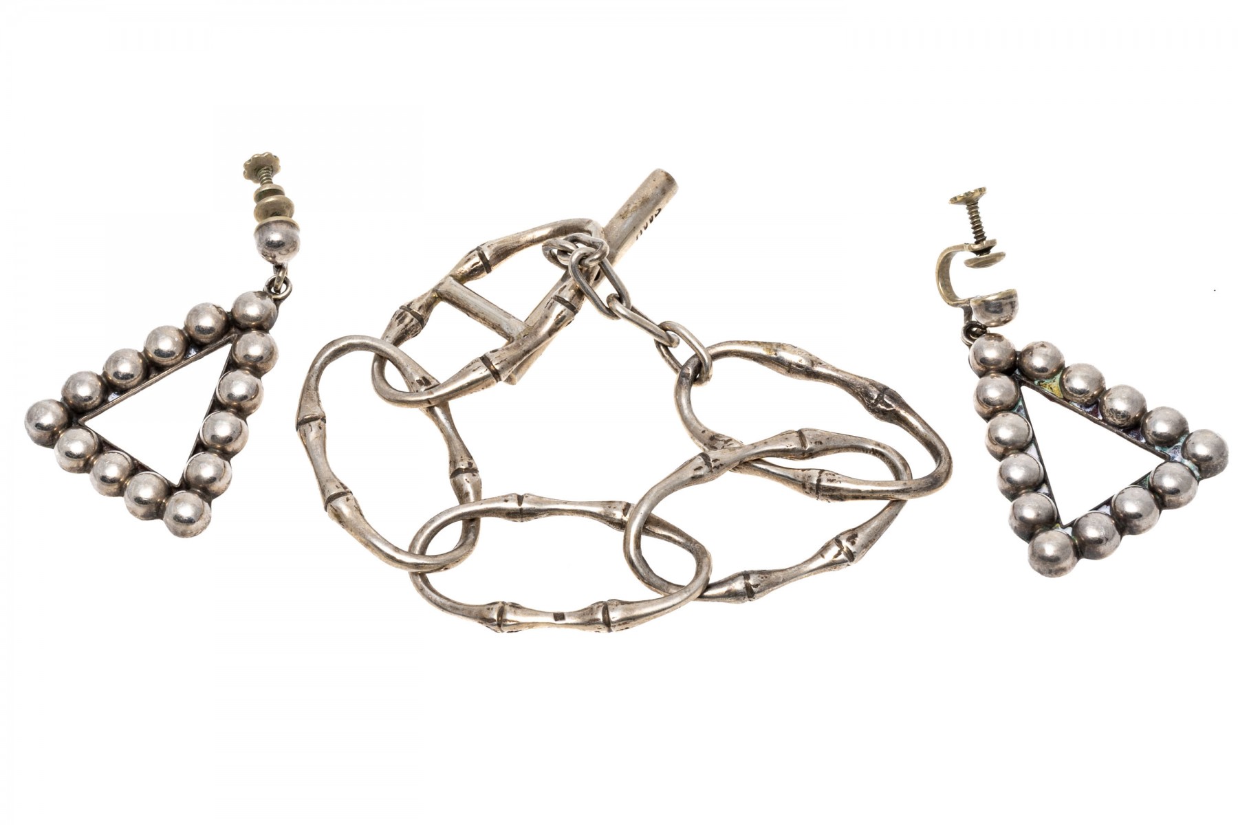 Chic sterling silver bamboo link bracelet with polished links and a toggle style clasp. With the bracelet is a pair of sterling triangular pendant earrings with a beadwork design, screw clip style backings.