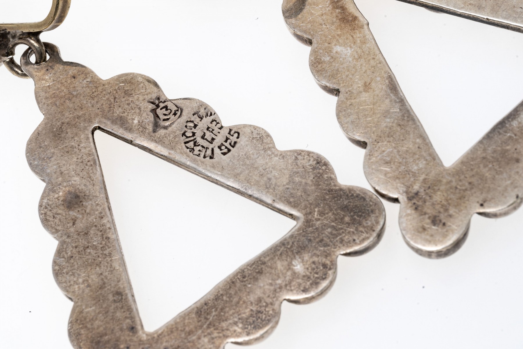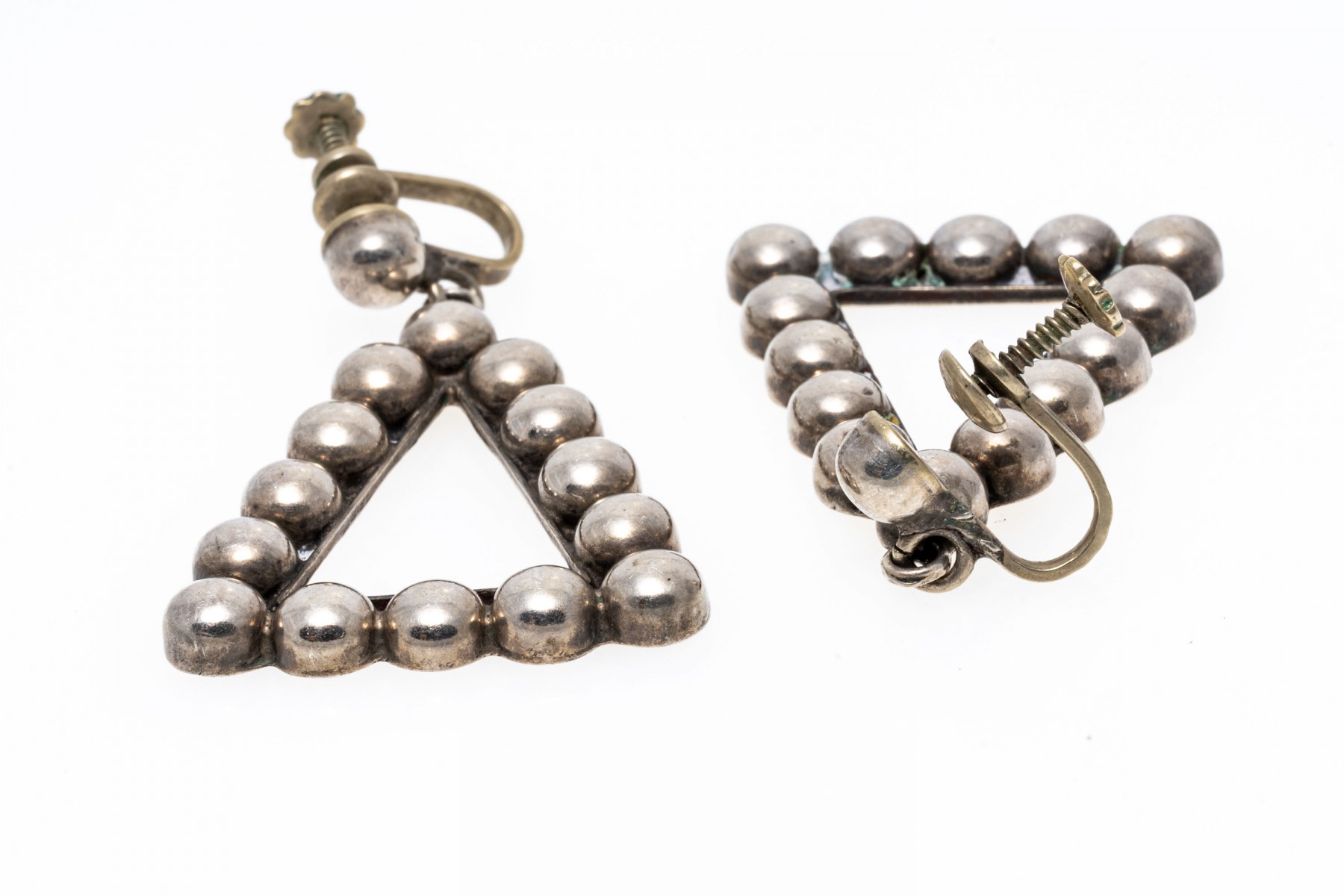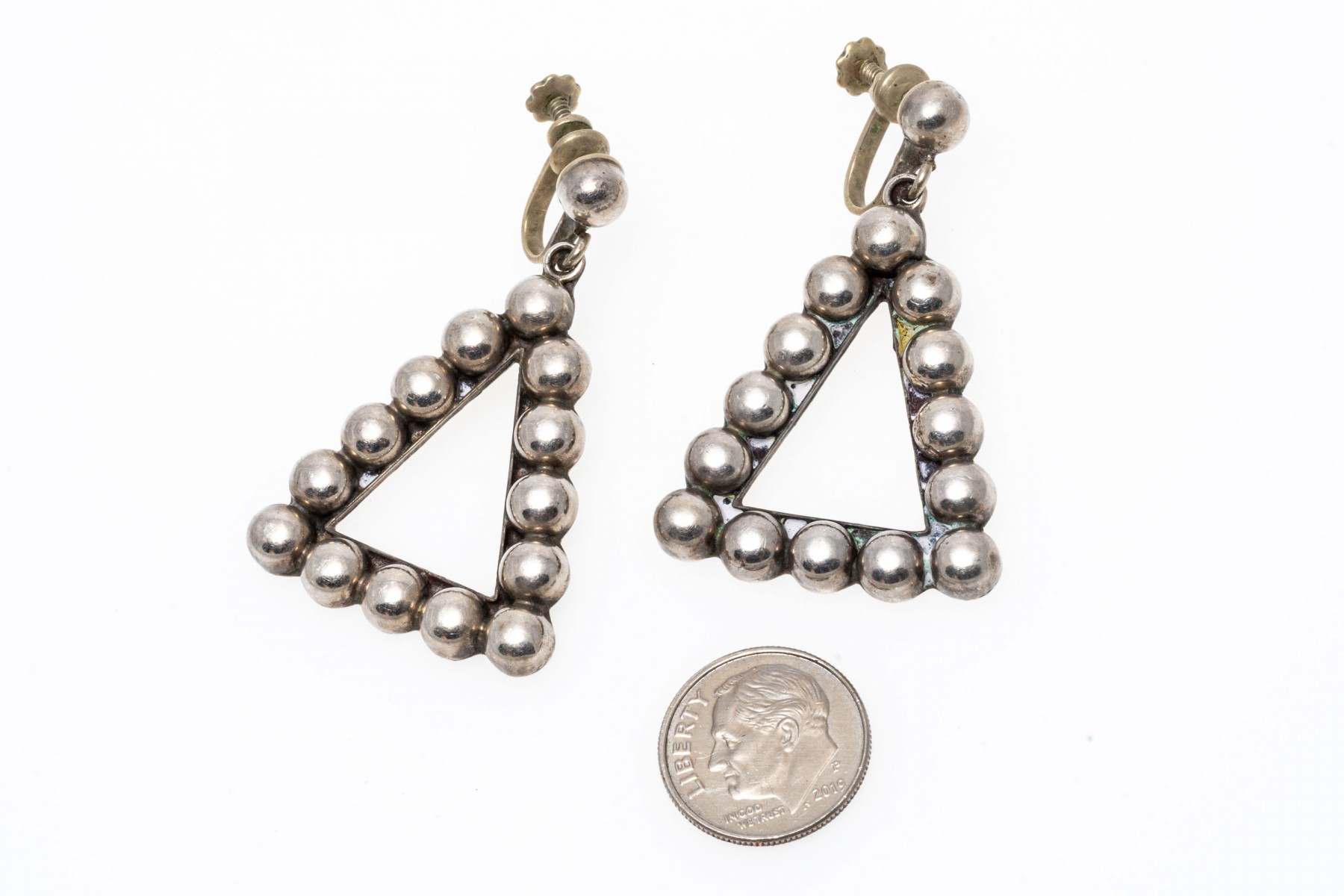 Chic sterling silver bamboo link bracelet with polished links and a toggle style clasp. With the bracelet is a pair of sterling triangular pendant earrings with a beadwork design, screw clip style backings.