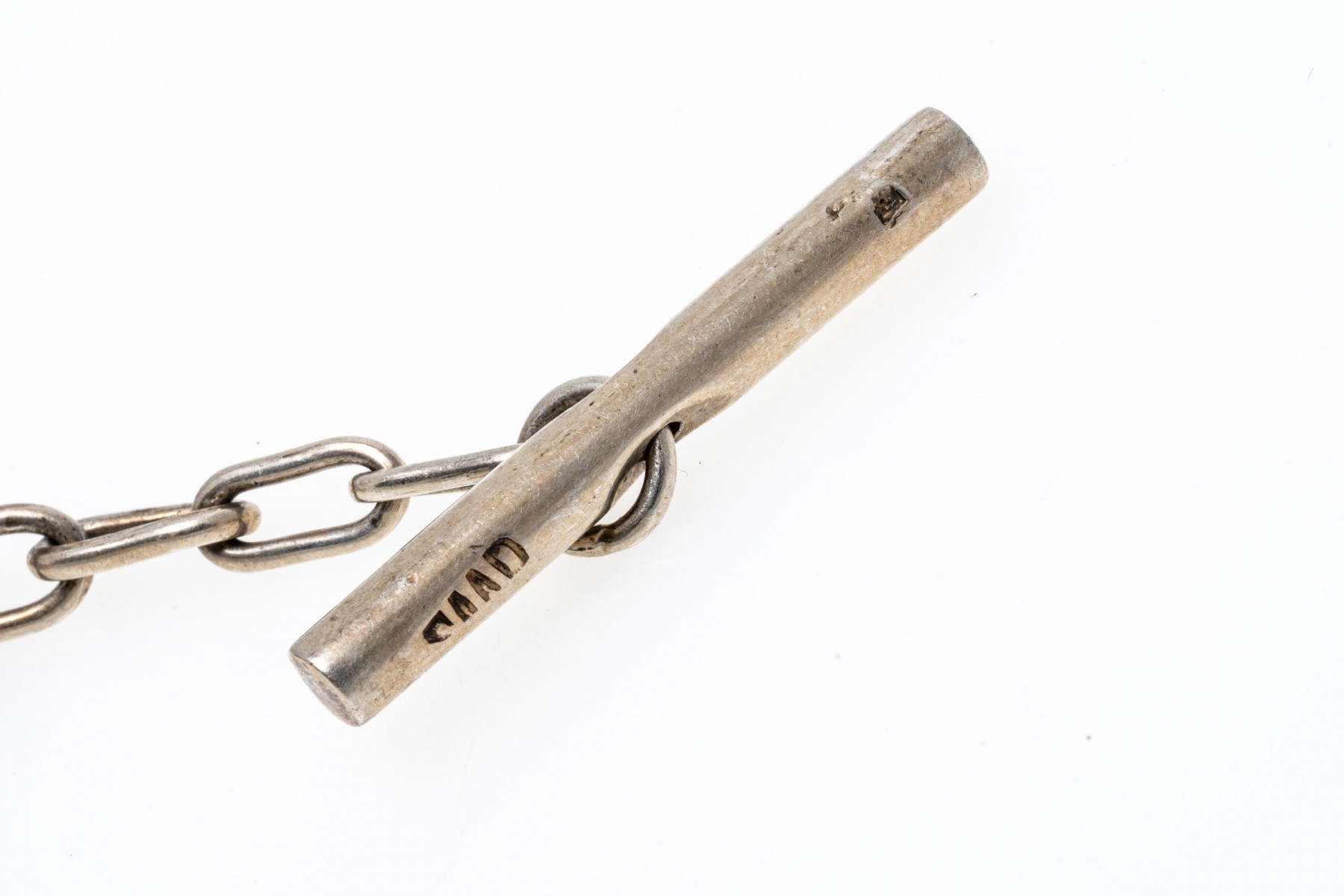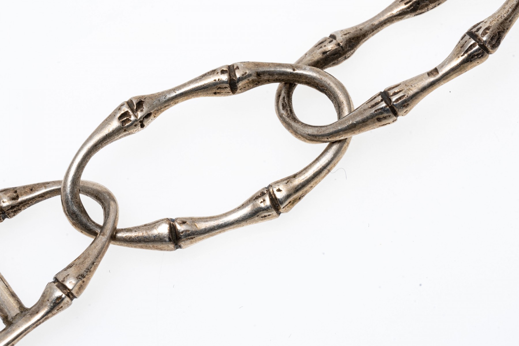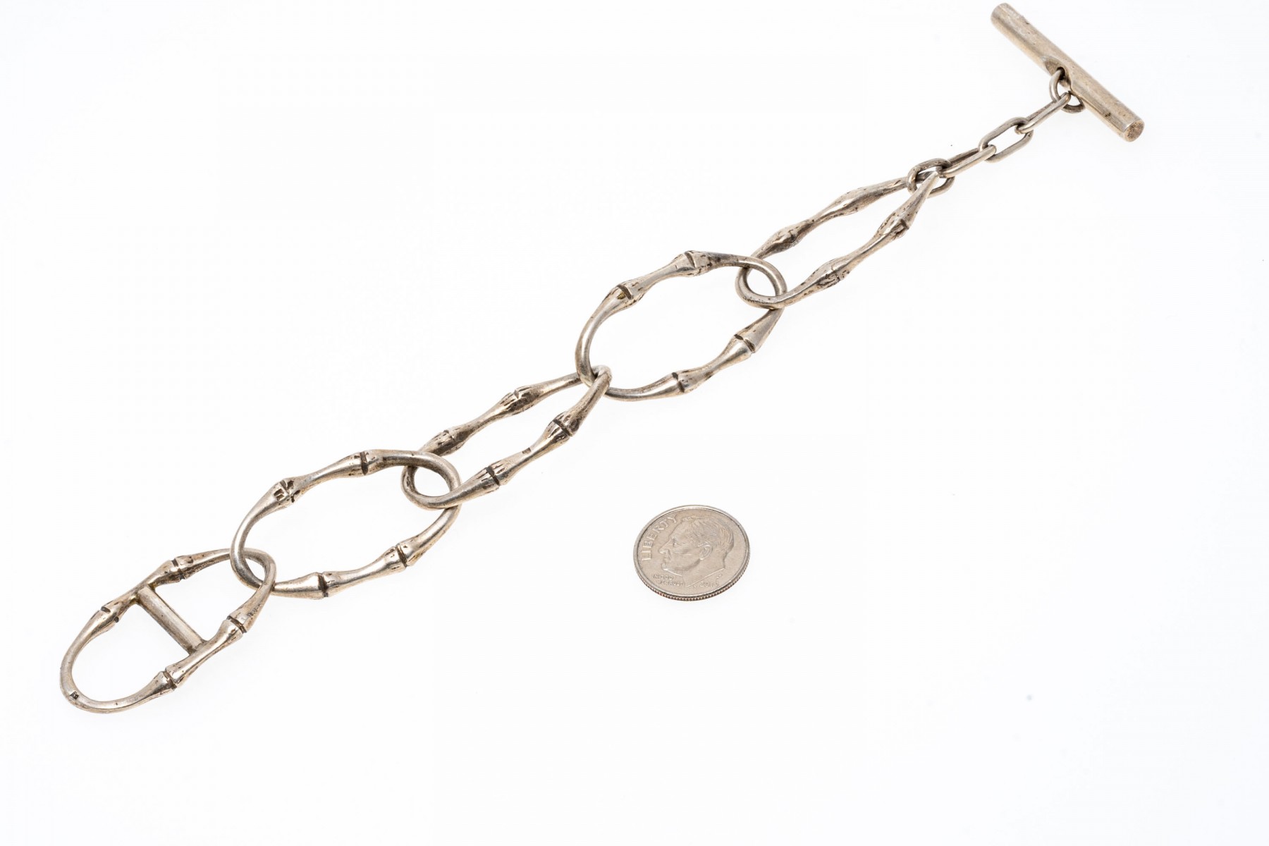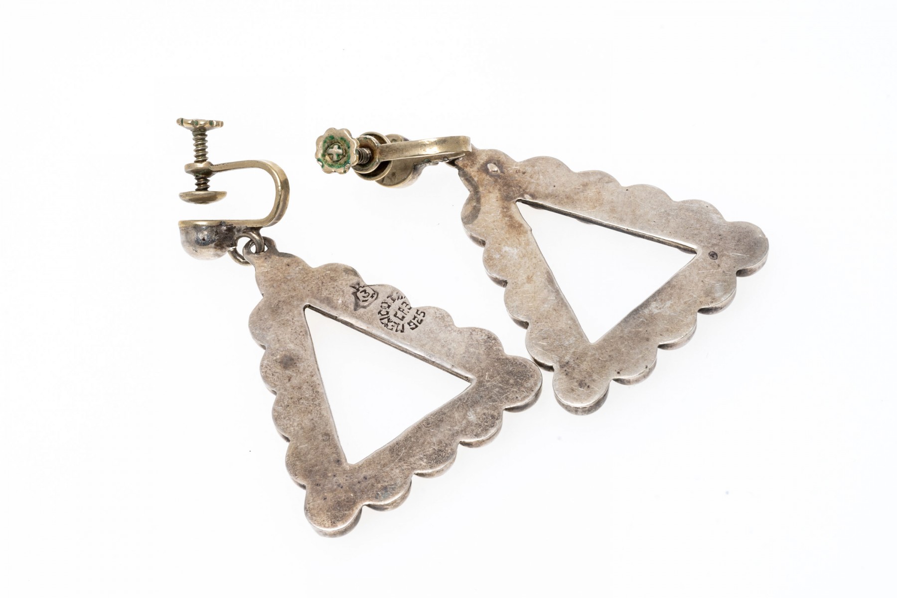 Chic sterling silver bamboo link bracelet with polished links and a toggle style clasp. With the bracelet is a pair of sterling triangular pendant earrings with a beadwork design, screw clip style backings.