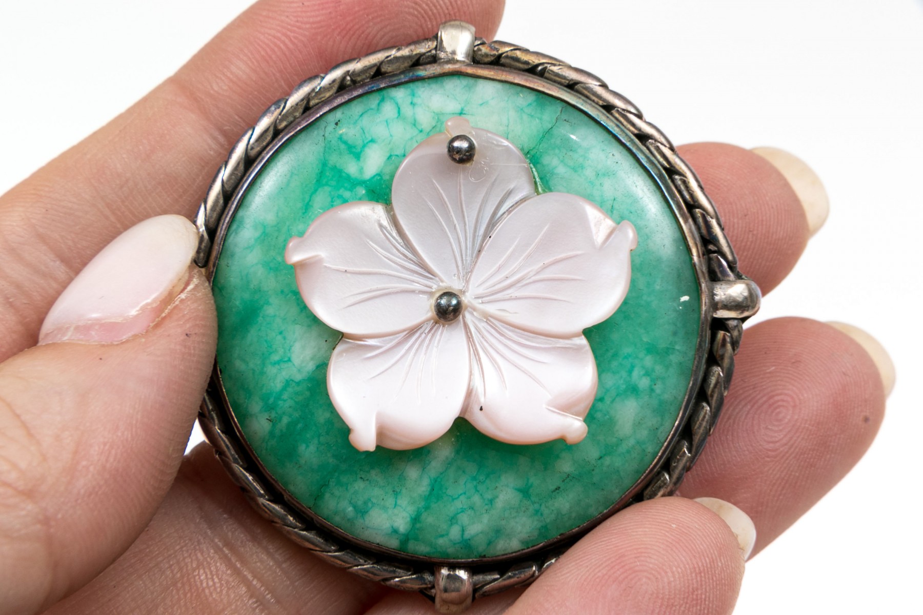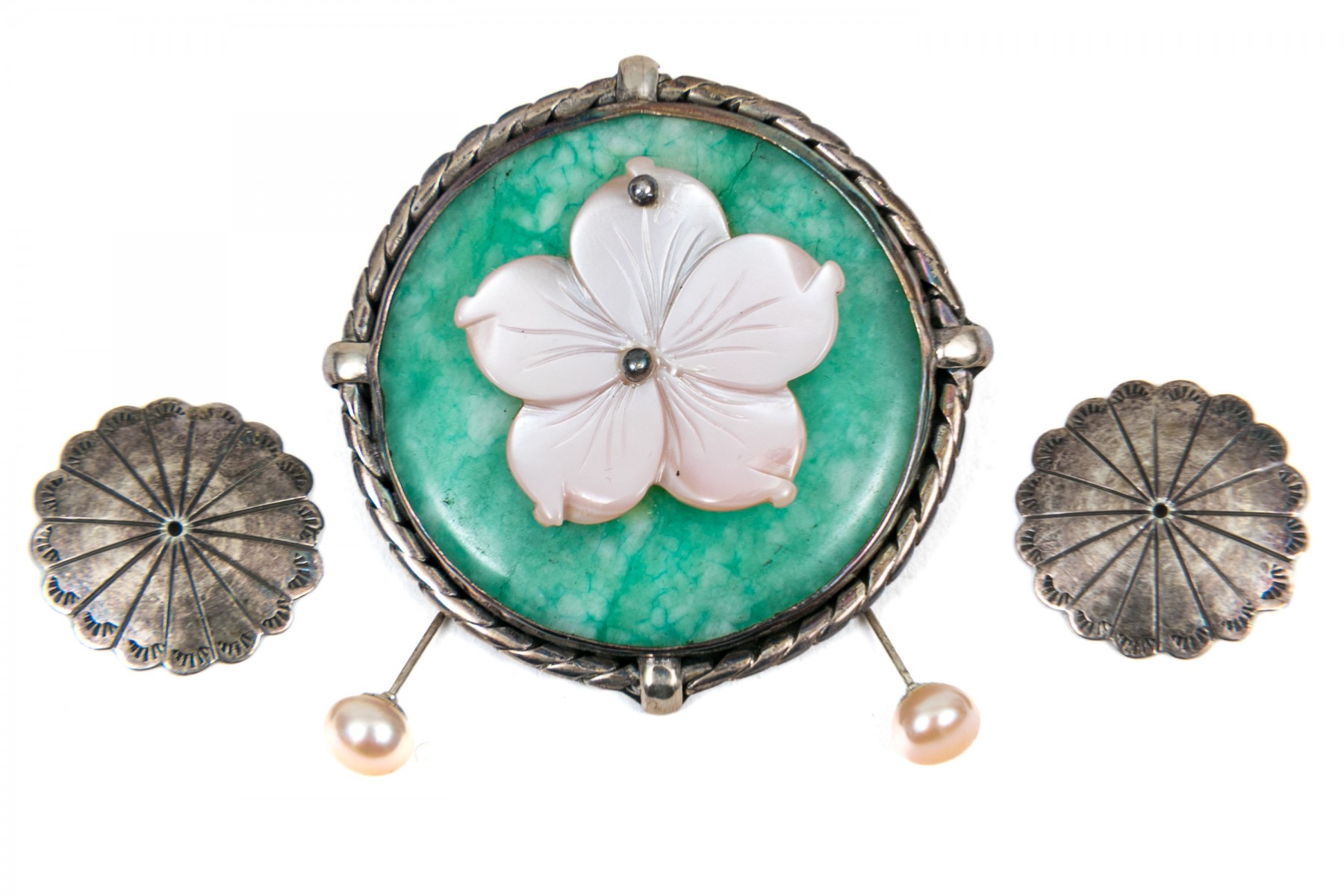 Sterling jewelry. A handsome brooch has been set with a green amazonite stone with carved mother of pearl flower. Stud style earrings with cultured freshwater pearls and etched earring jackets. Earrings have post backings.