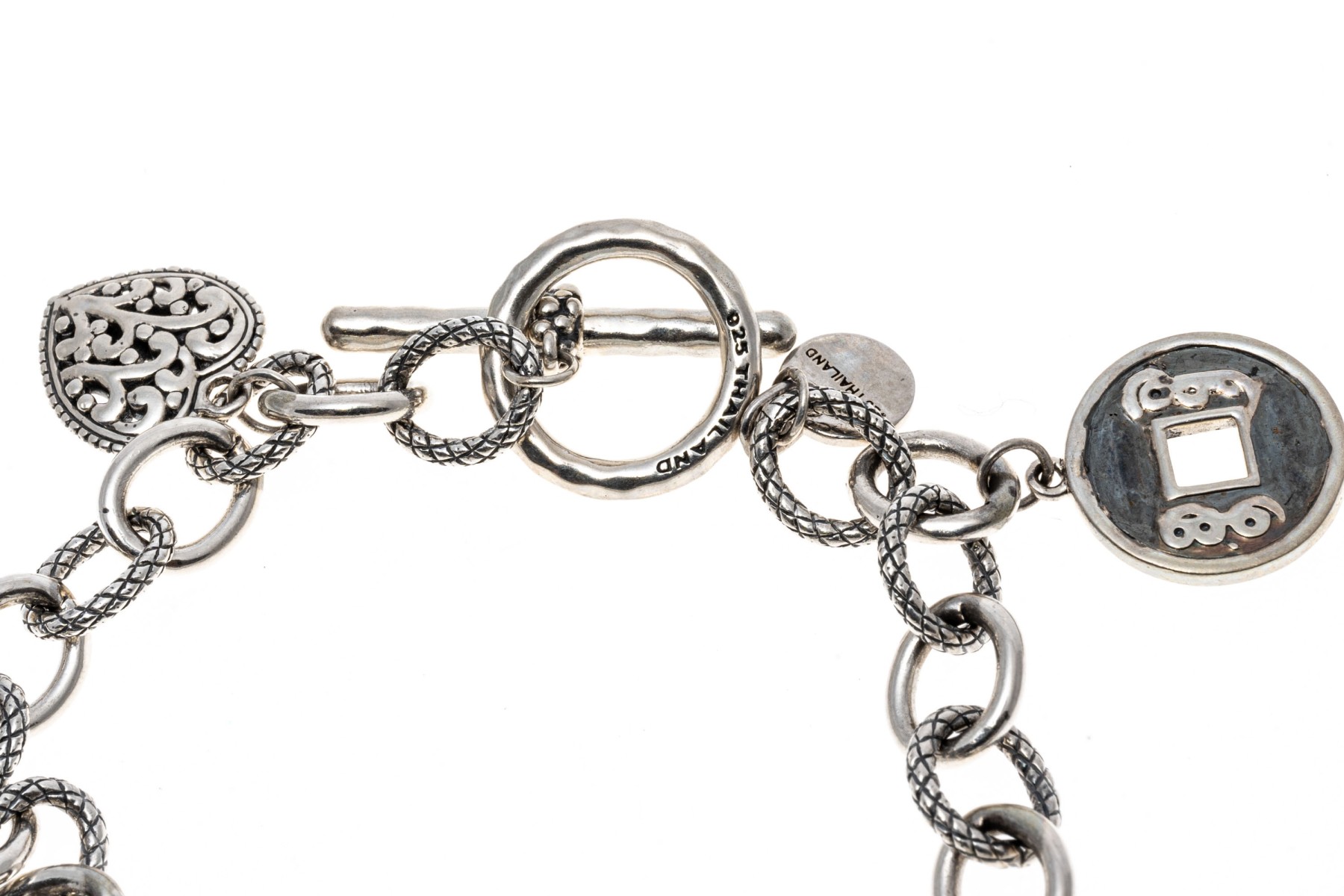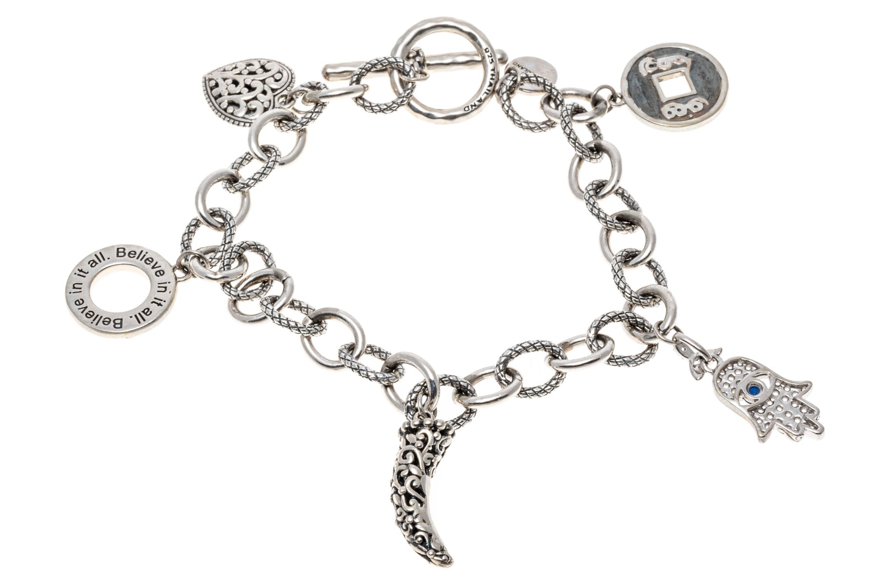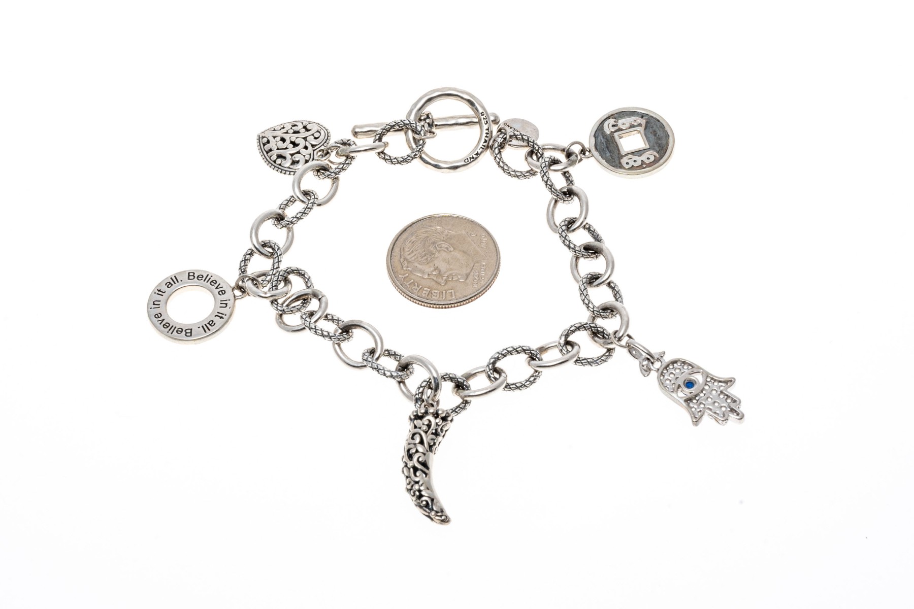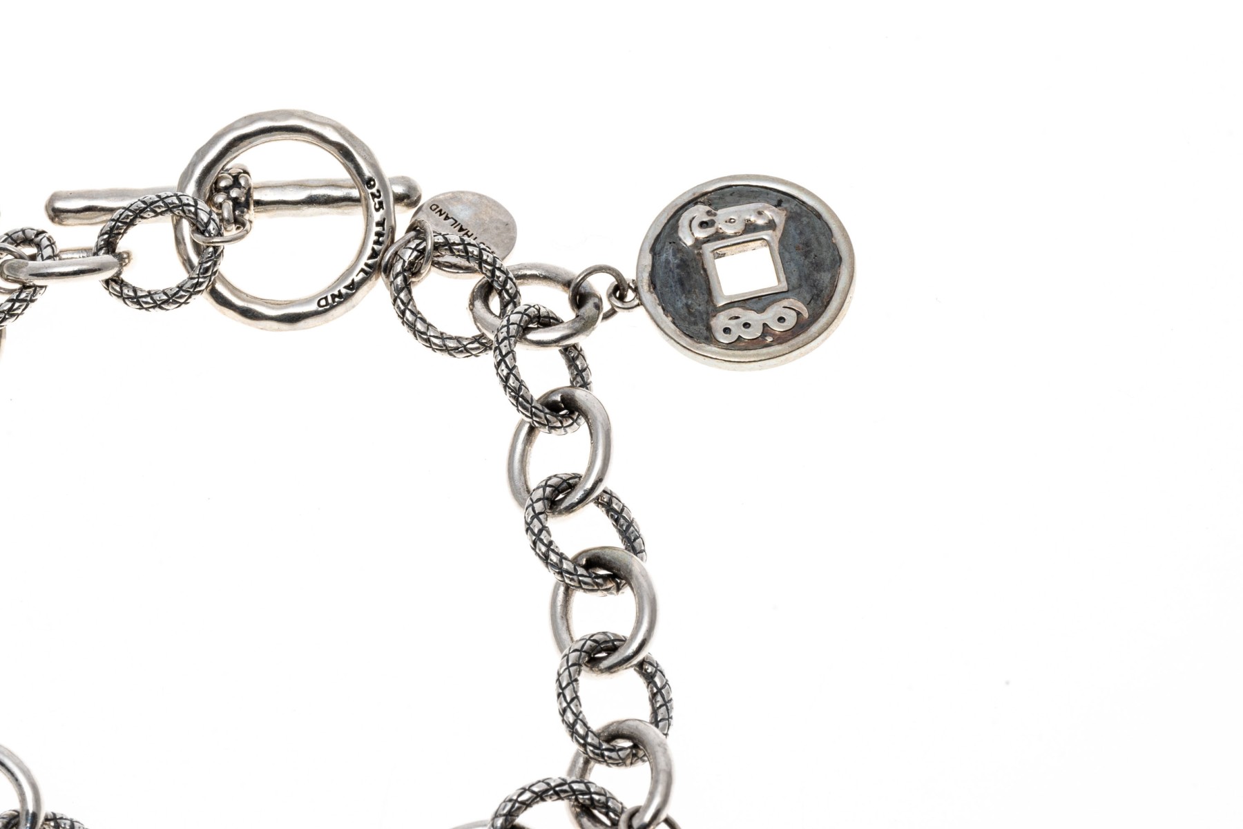 Sterling silver cable link style bracelet. Alternating polished and textured links display various charms. Toggle style clasp.