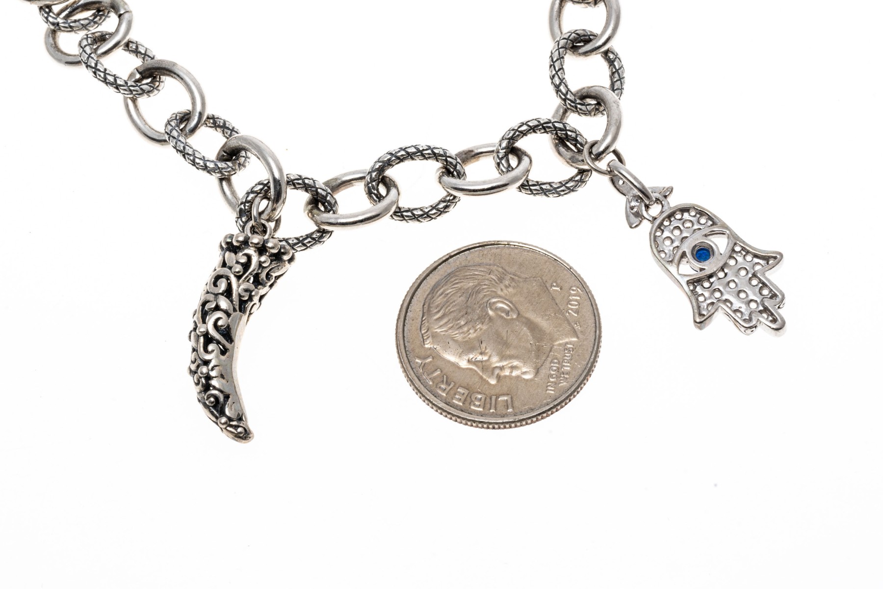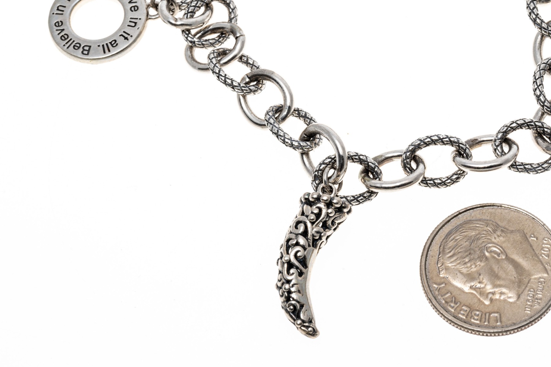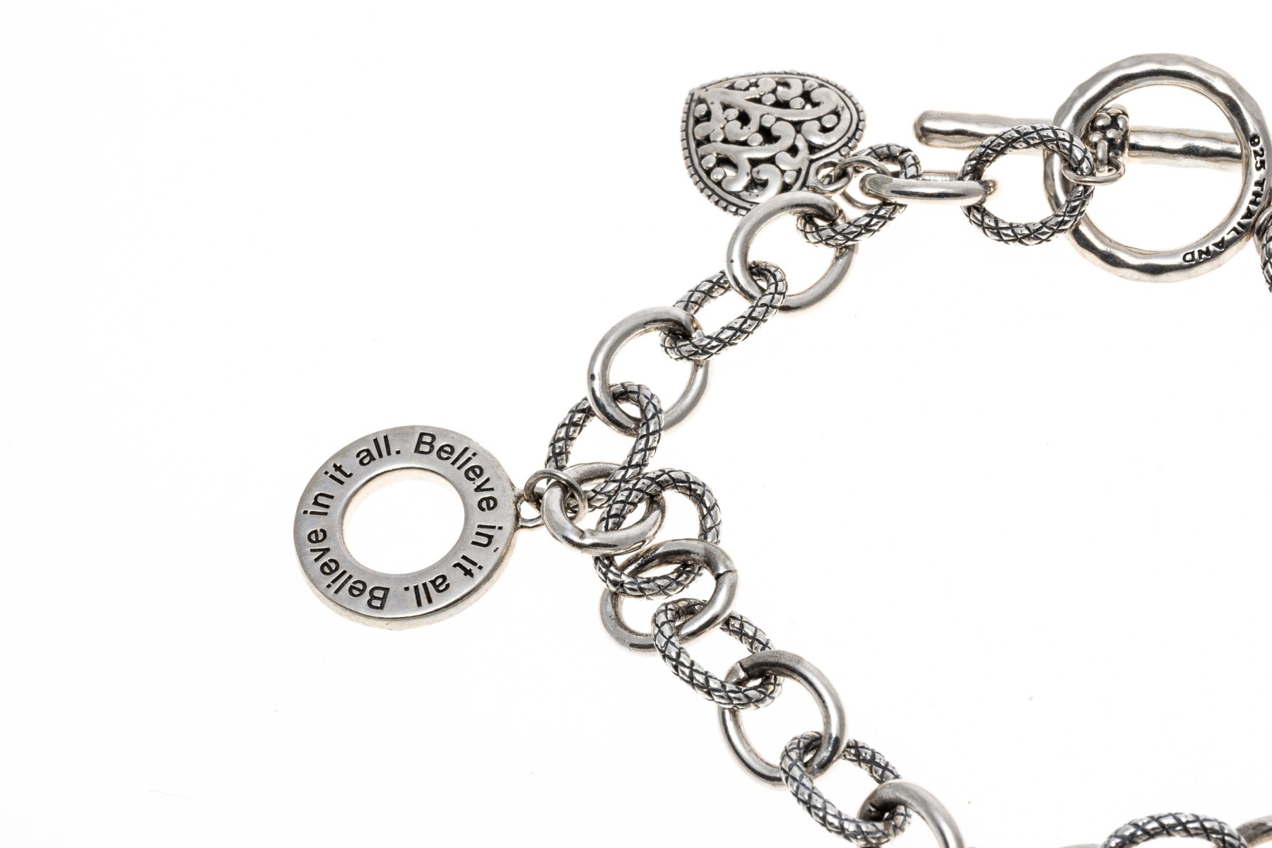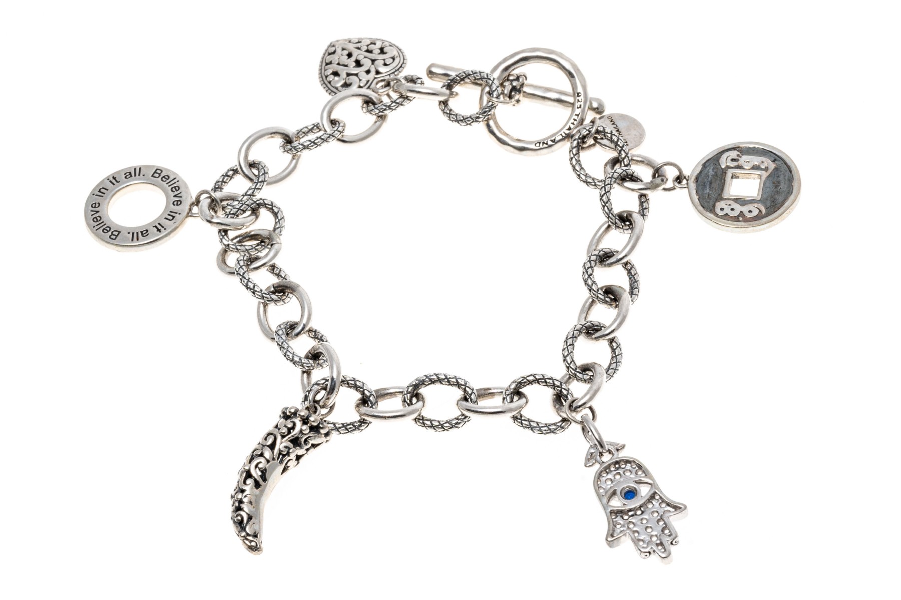 Sterling silver cable link style bracelet. Alternating polished and textured links display various charms. Toggle style clasp.