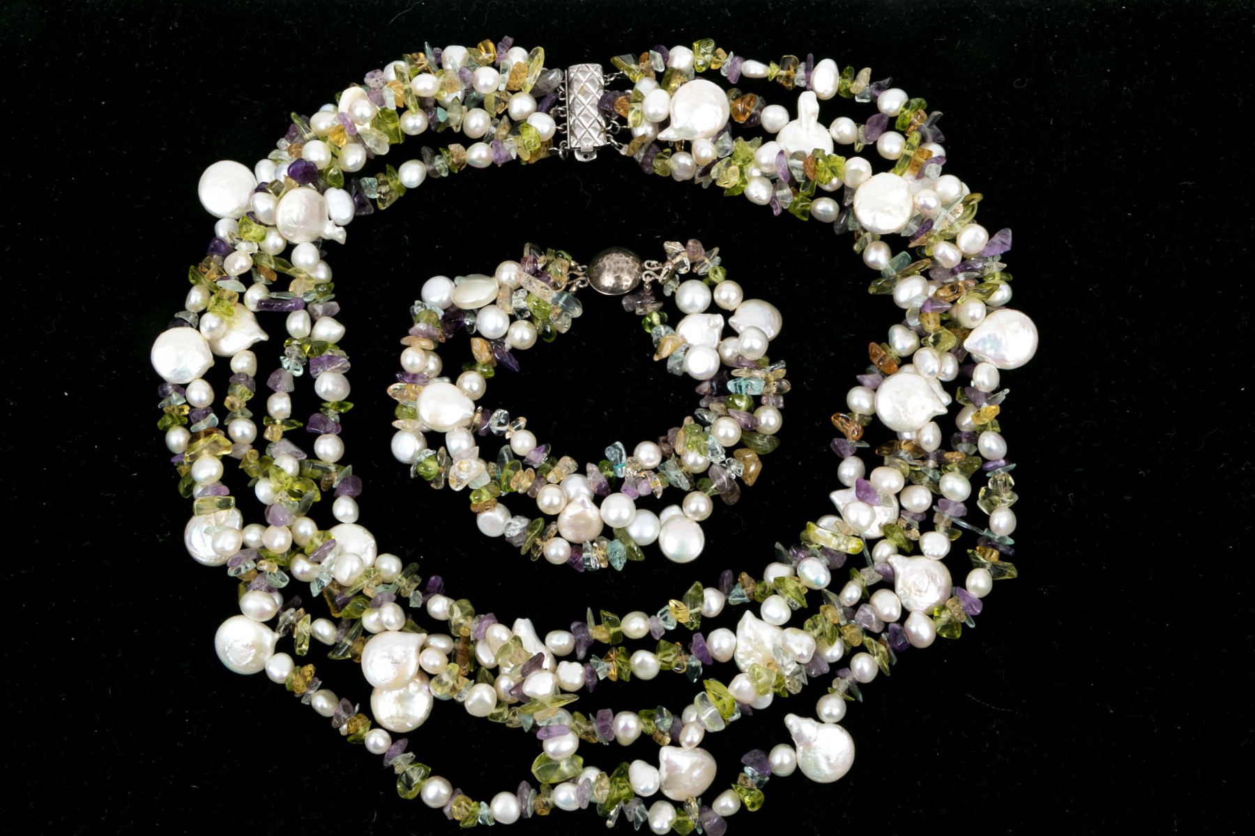 Necklace and bracelet set. The multi-stranded set is strung with cultured freshwater pearls and colorful tumbled stones of amethyst, citrine and peridots. Secure with sterling silver clasps, box clasp on necklace and magnetic clasp on bracelet.