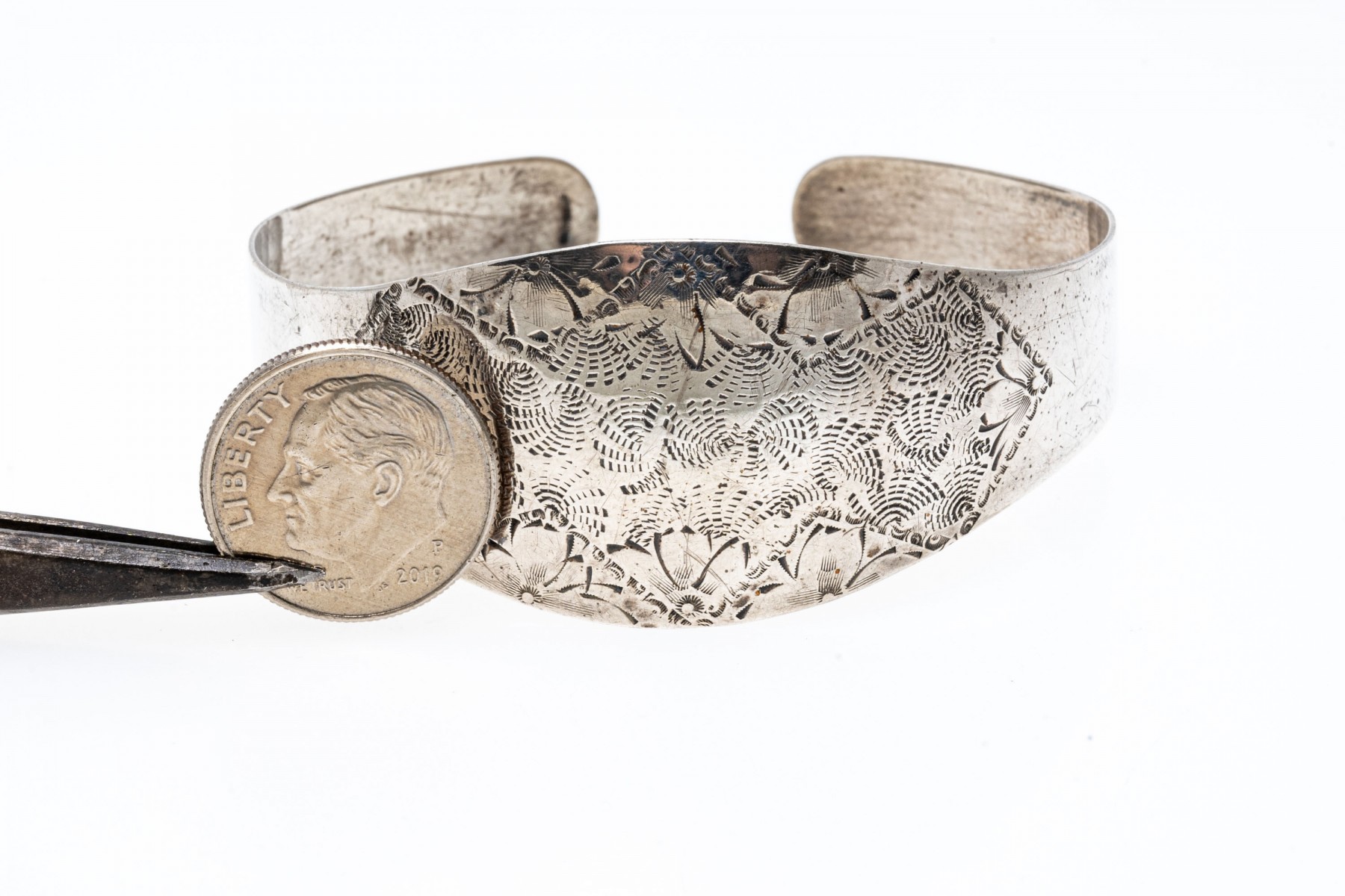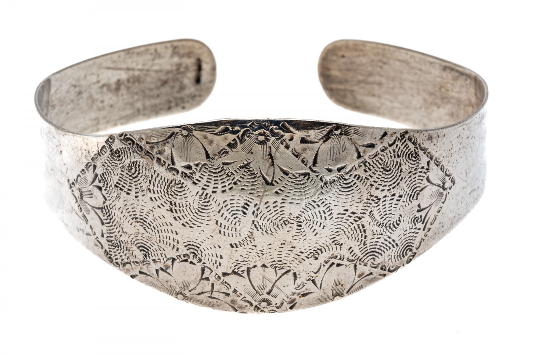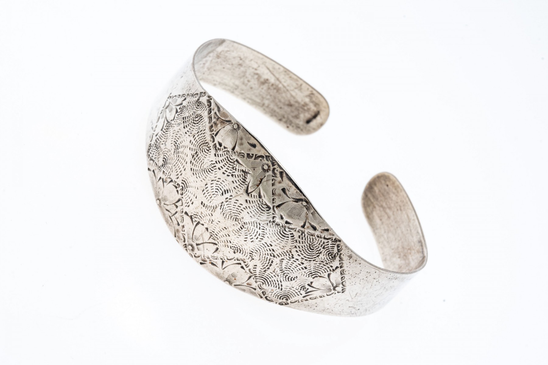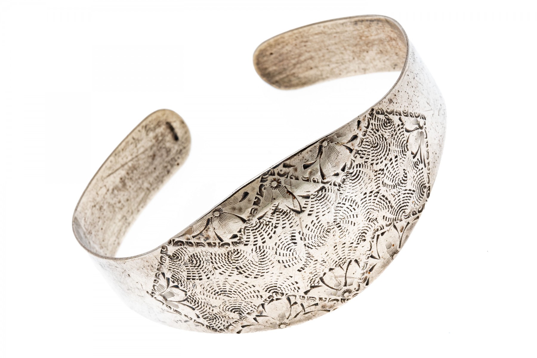 A rustic sterling silver cuff style bangle bracelet. The face of the bracelet is etched with an intricate design.