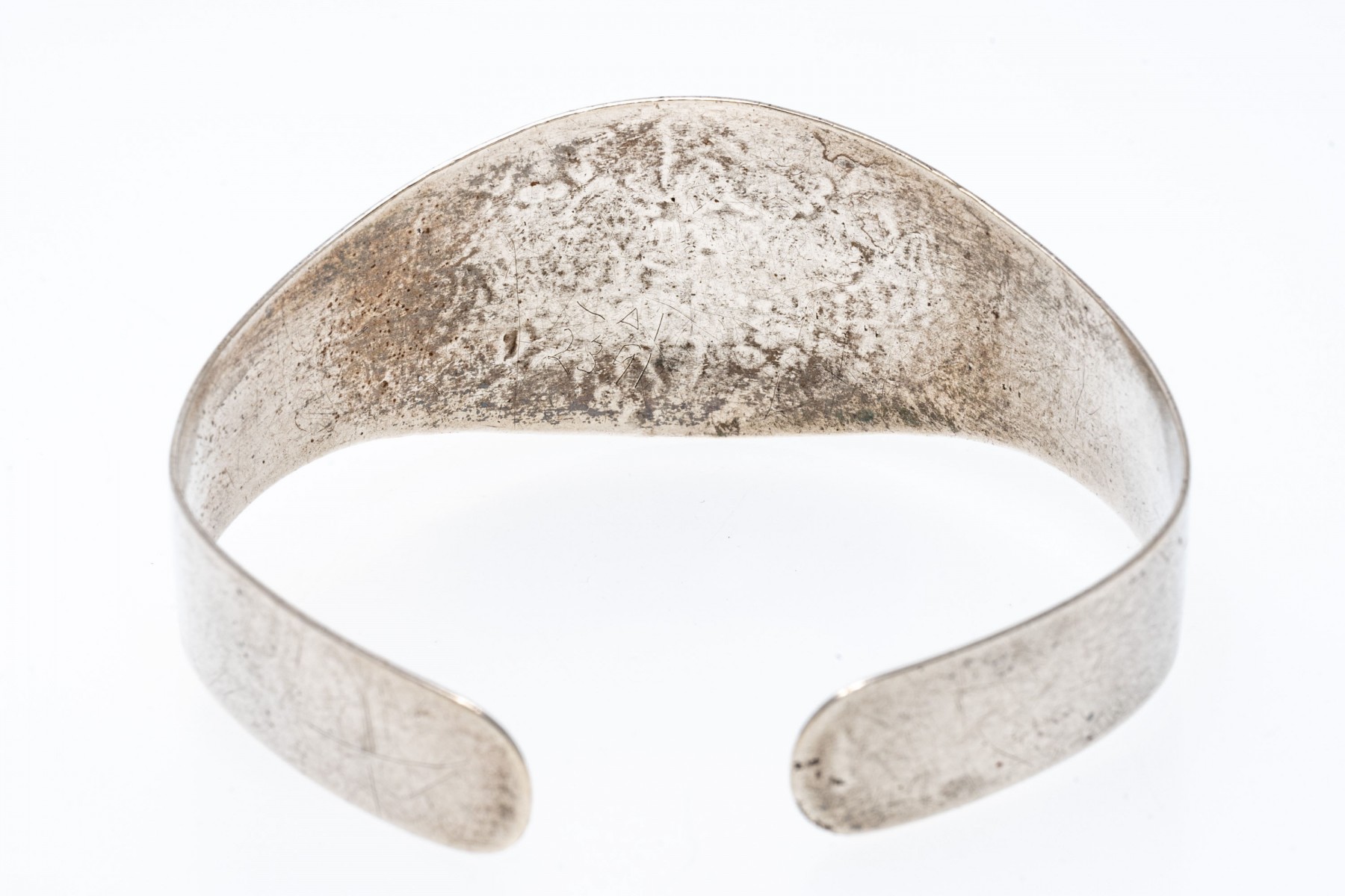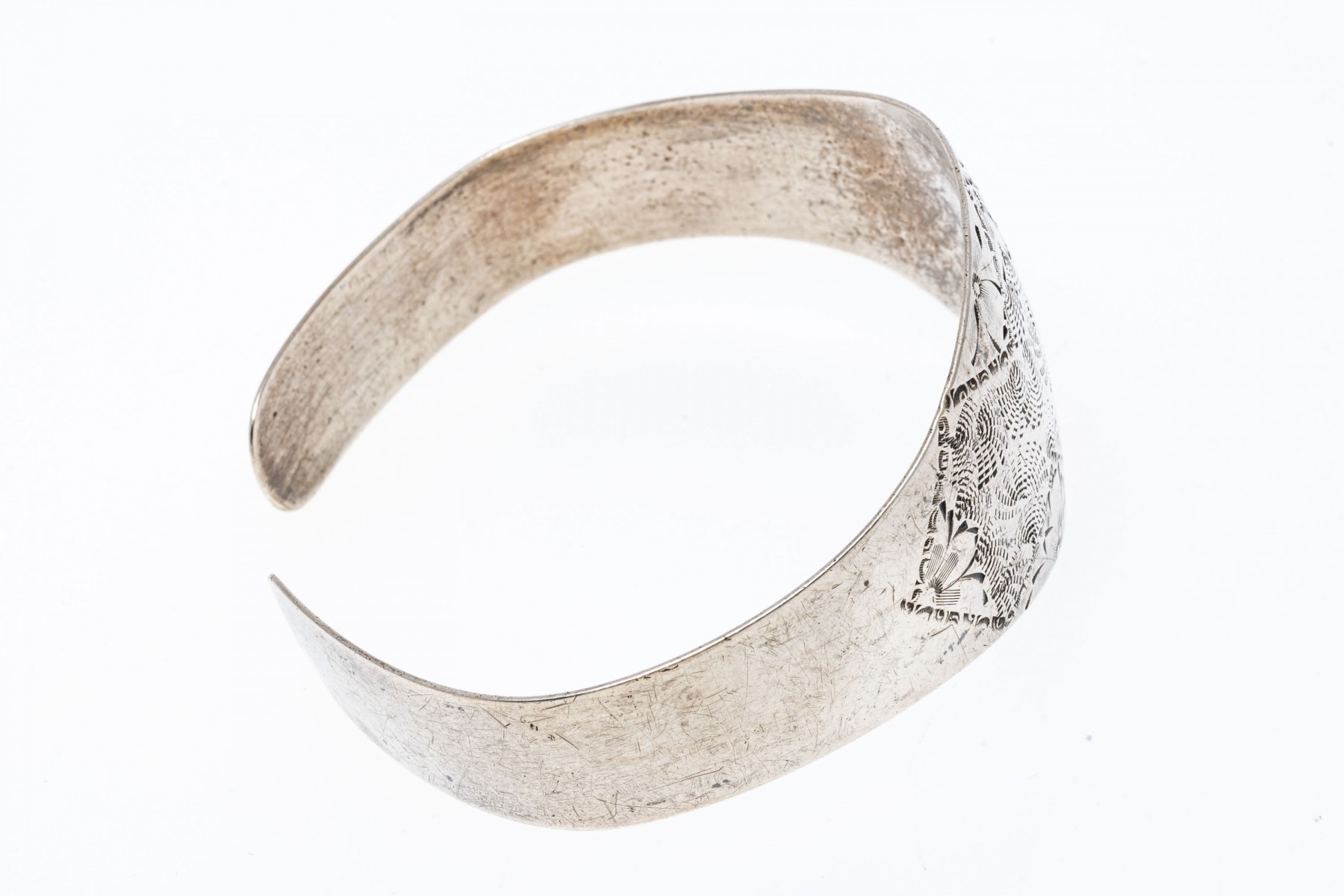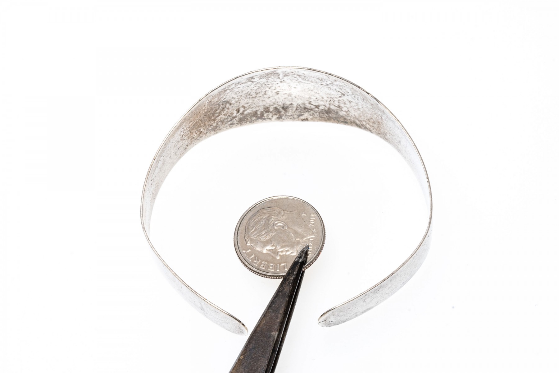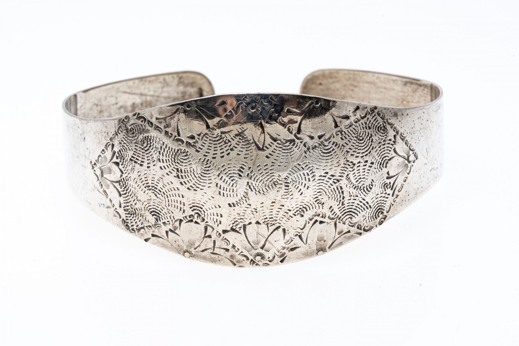 A rustic sterling silver cuff style bangle bracelet. The face of the bracelet is etched with an intricate design.