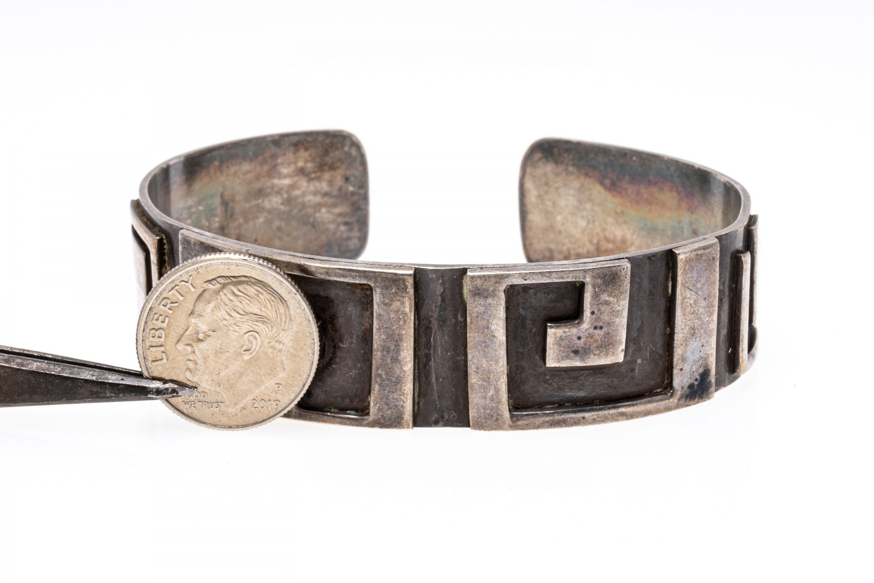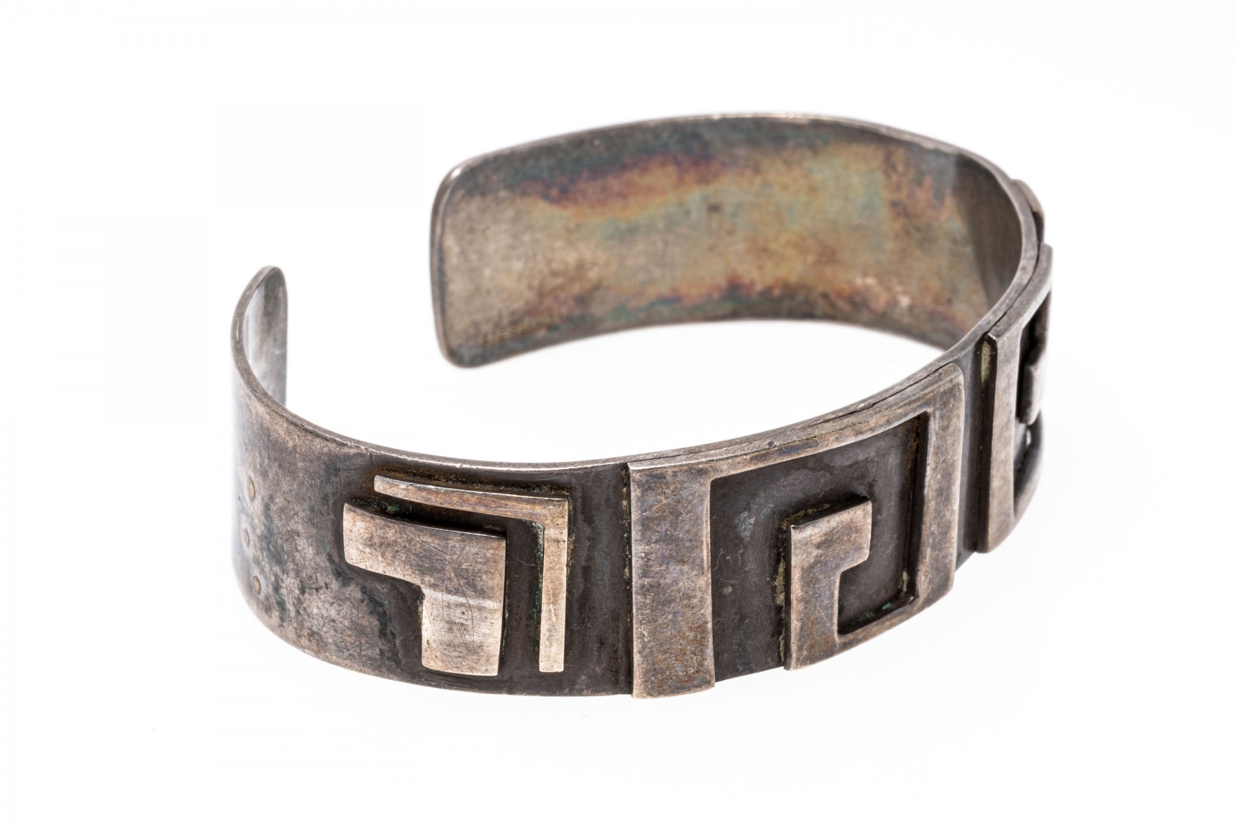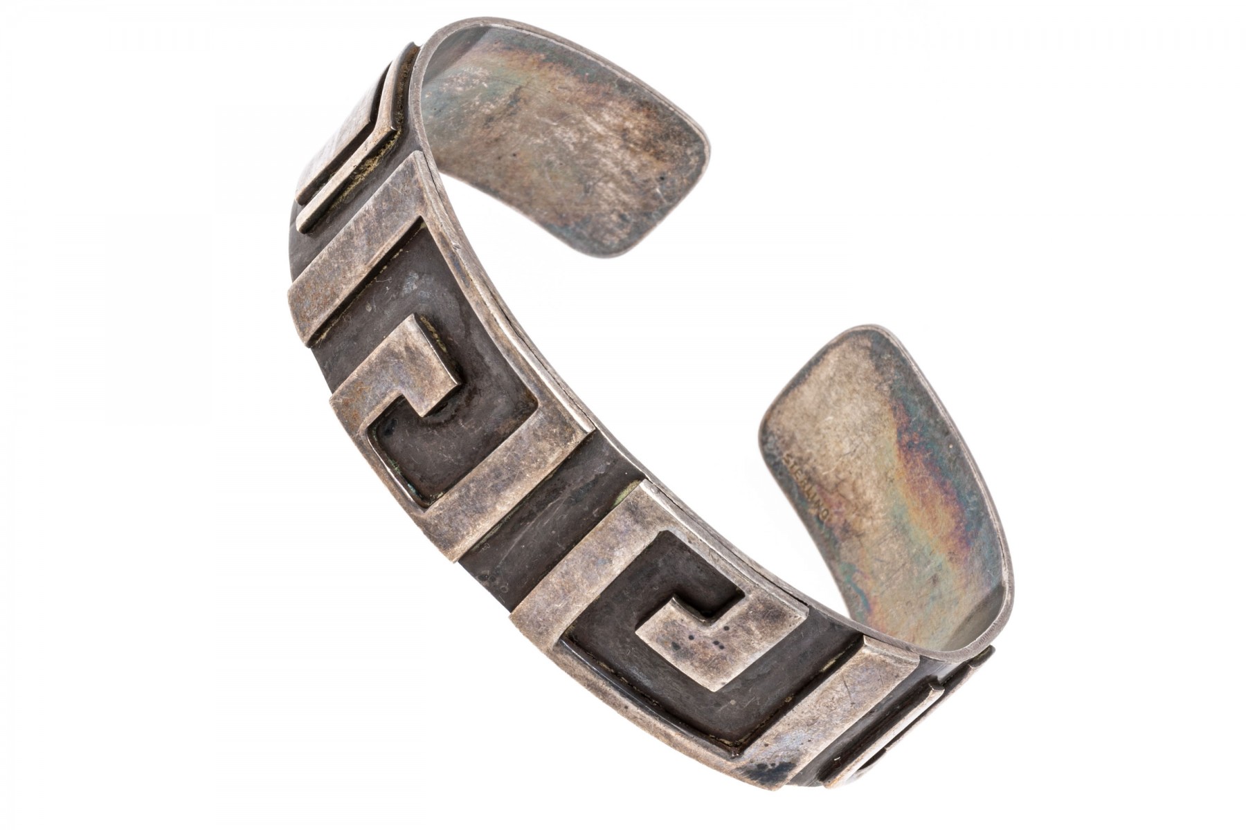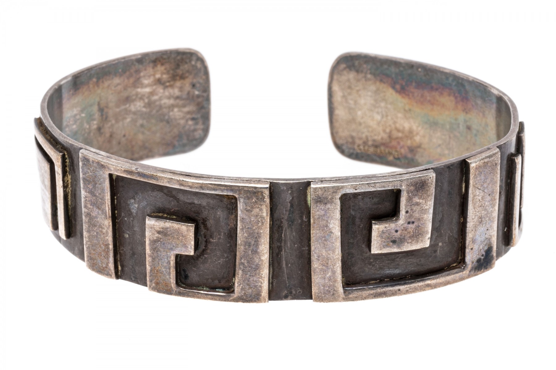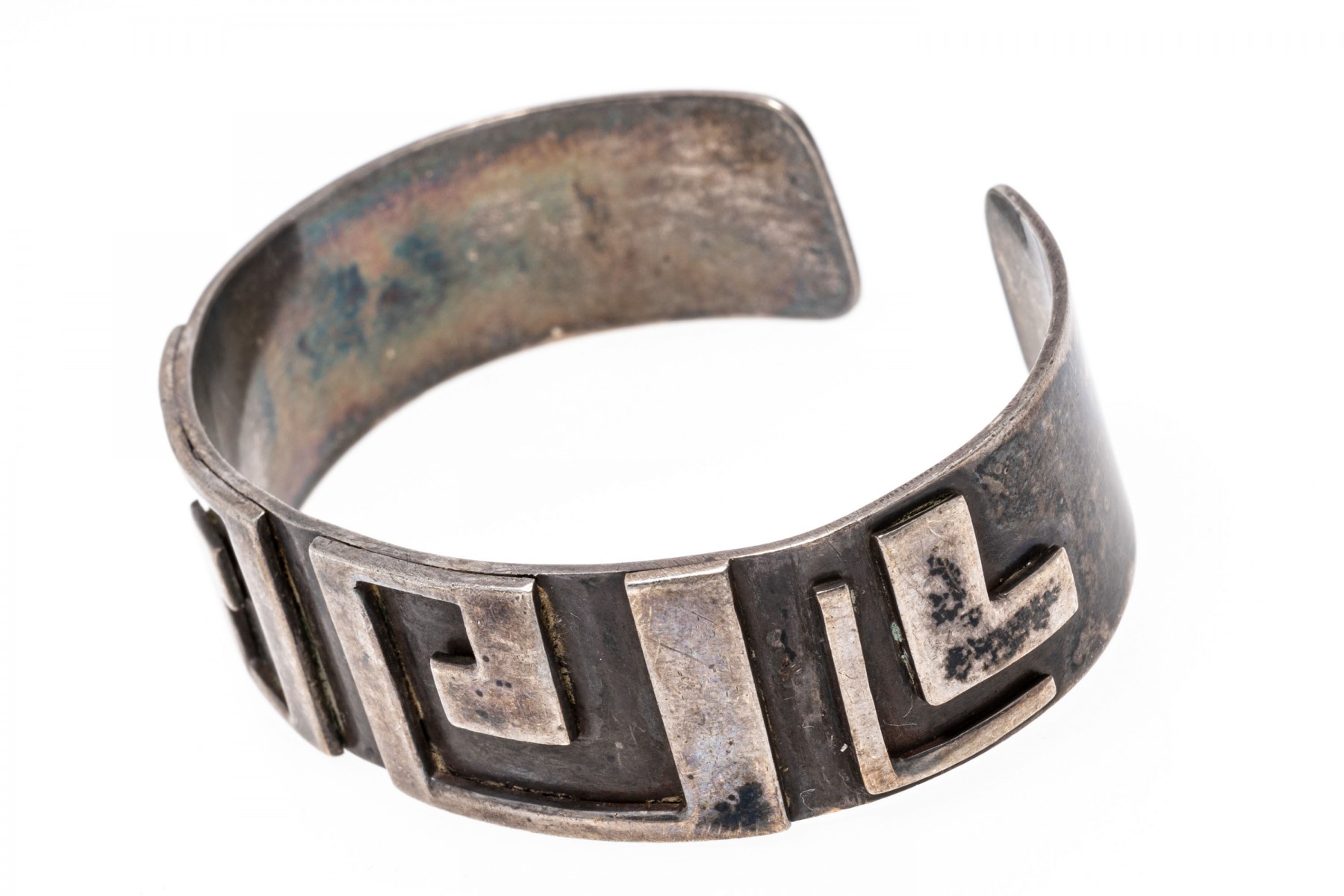 A sterling silver cuff style bracelet. This band of this bracelet is decorated with a Greek Key design.