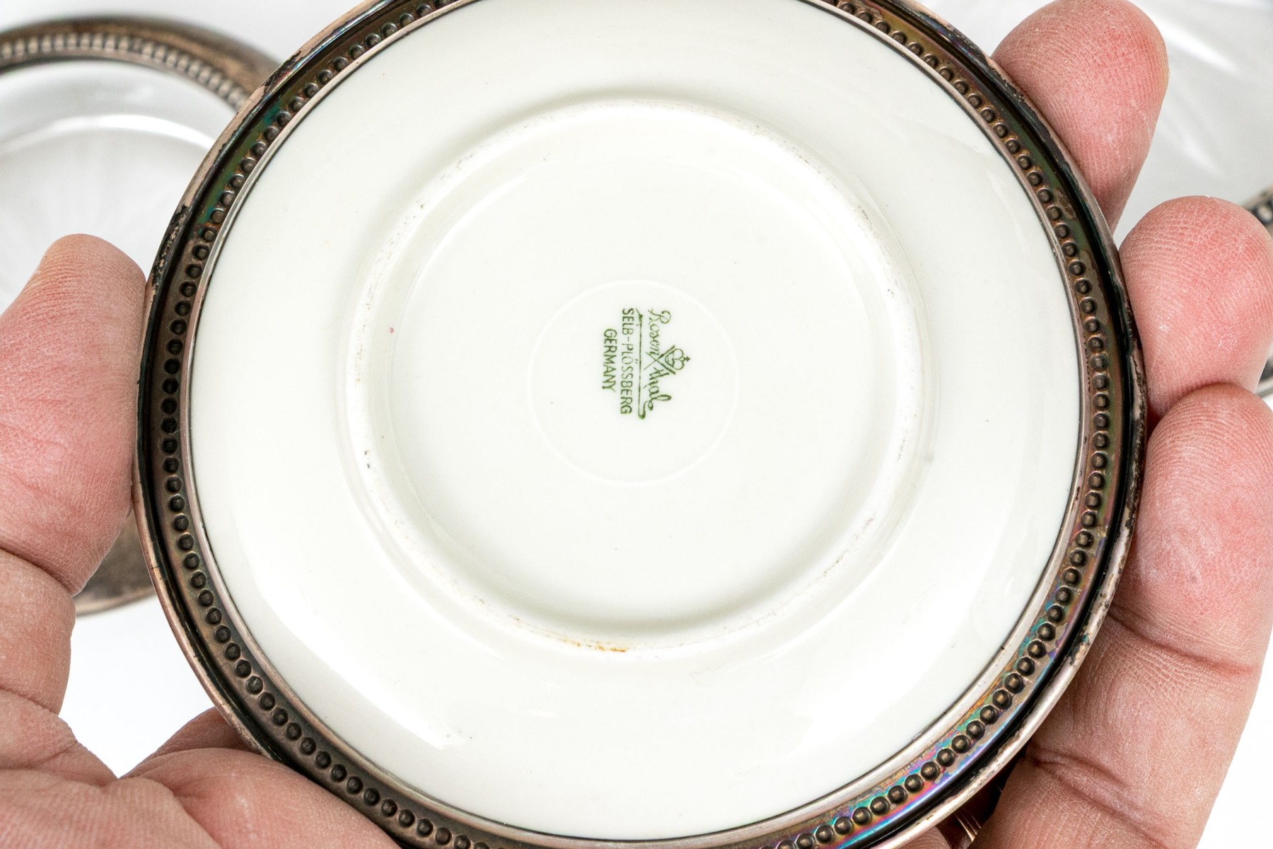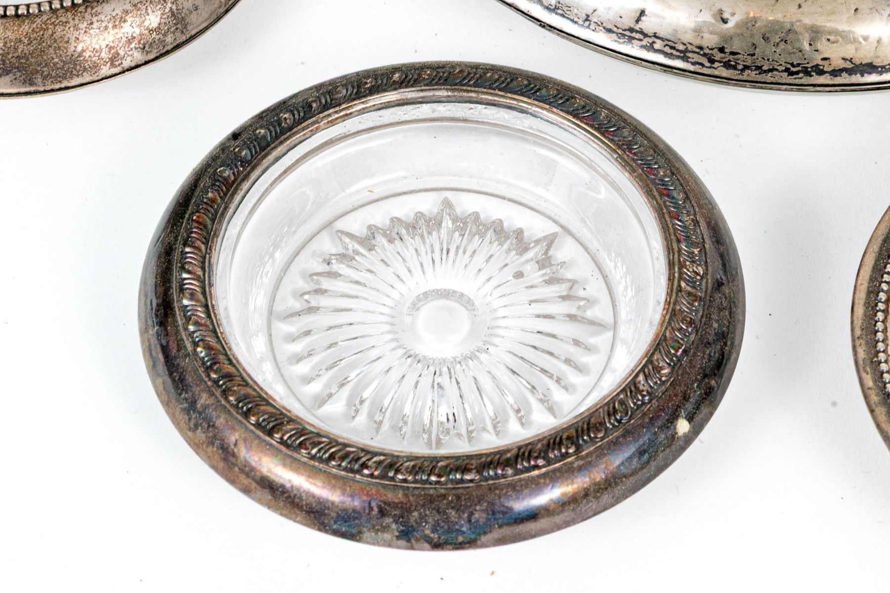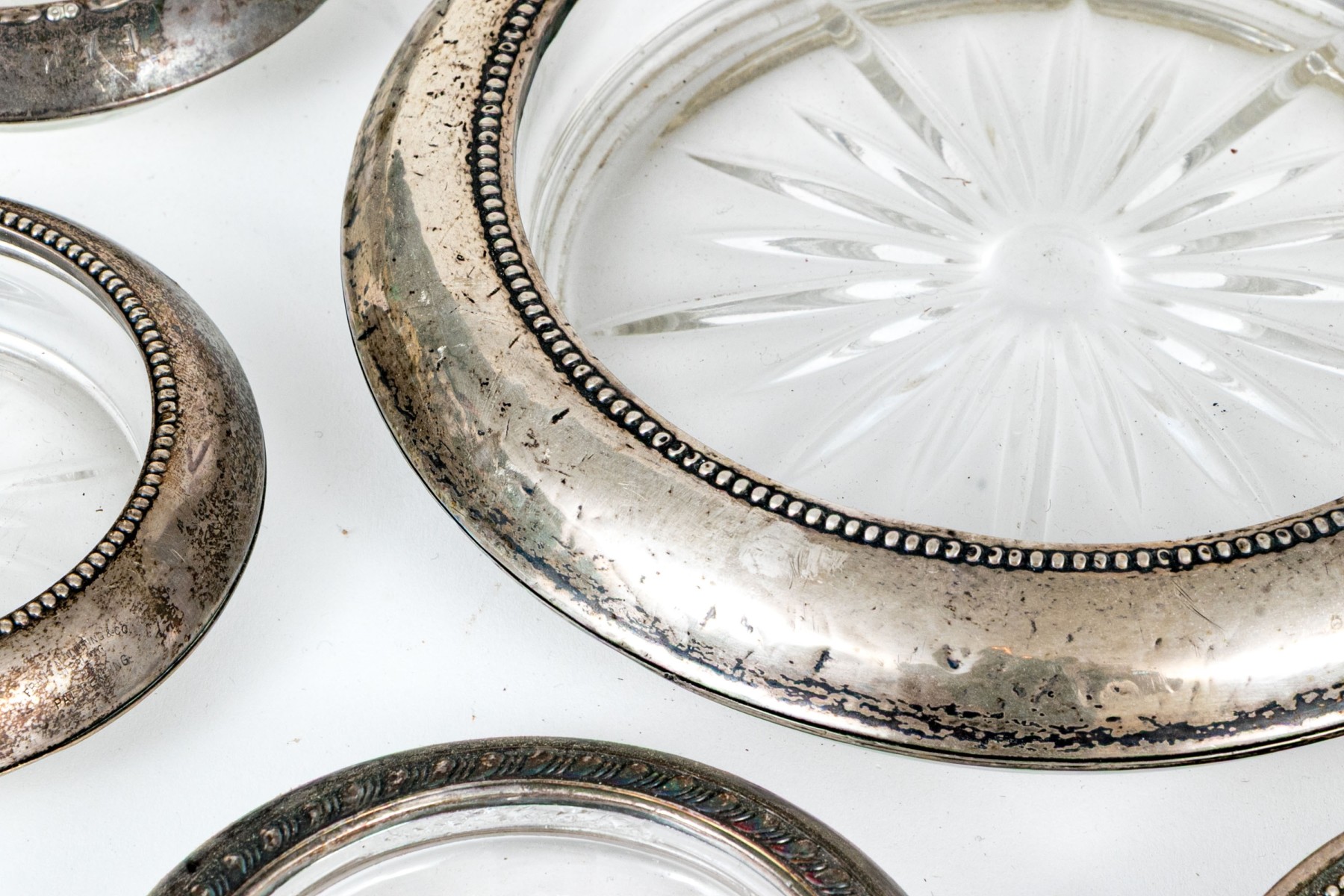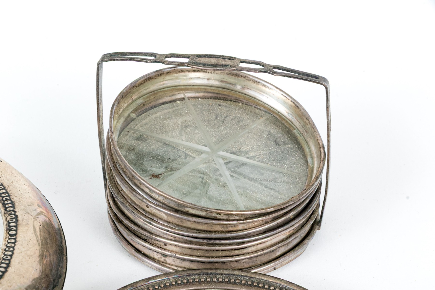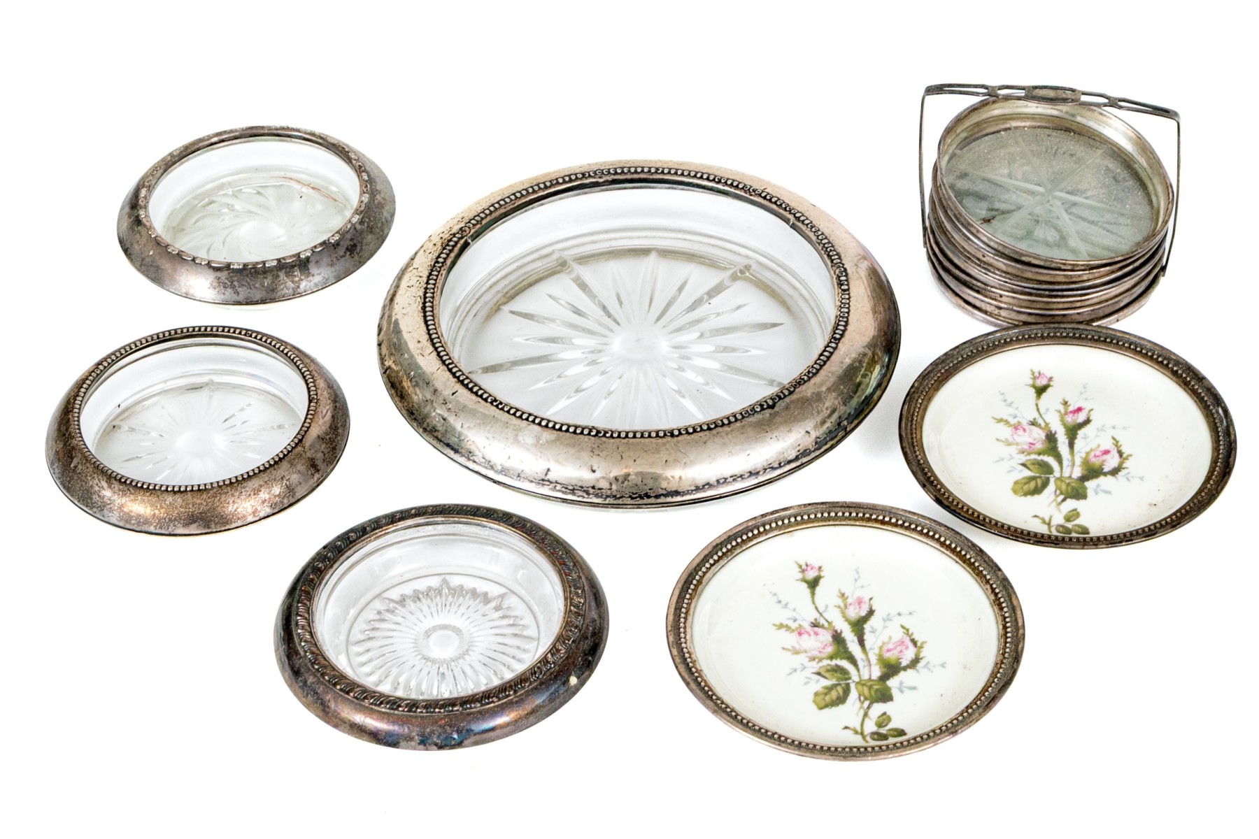 A wonderful variety of coasters mounted in sterling silver, including a bottle coaster, a set of small coasters in a caddy, three medium coasters in similar form with various designs, and two Rosenthal coasters with ceramic bases painted with floral sprays.