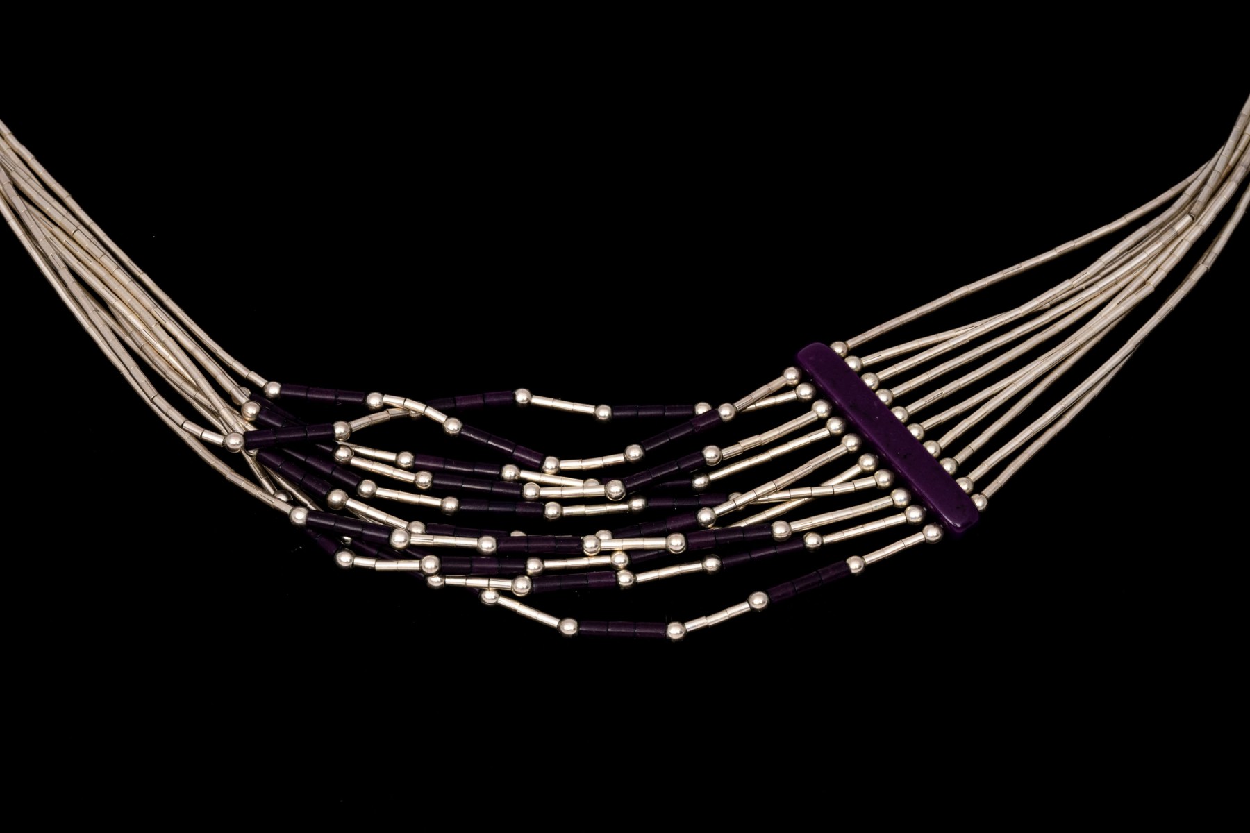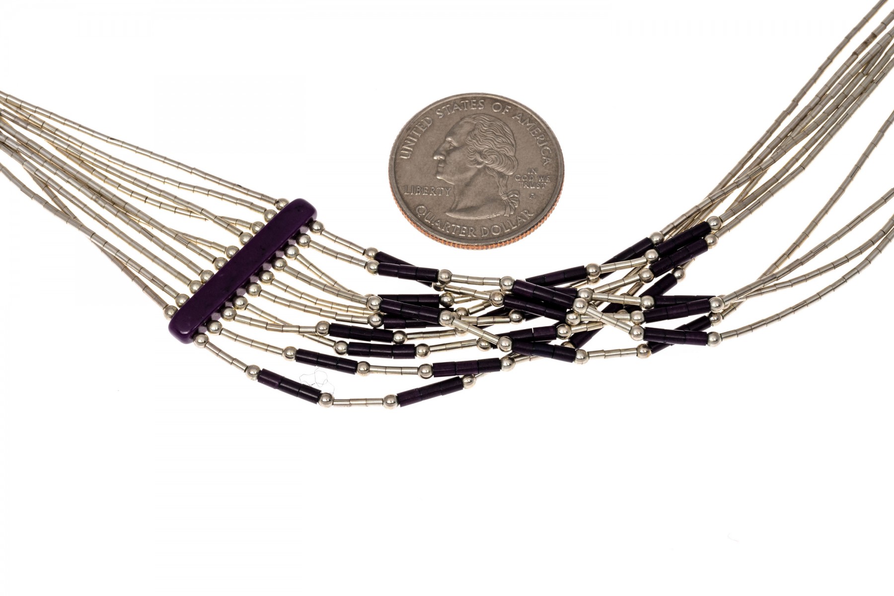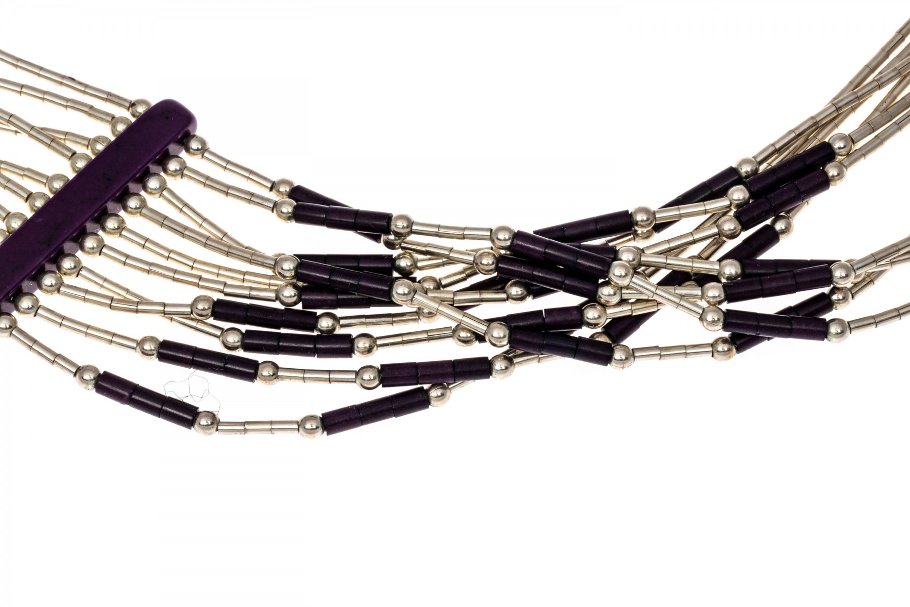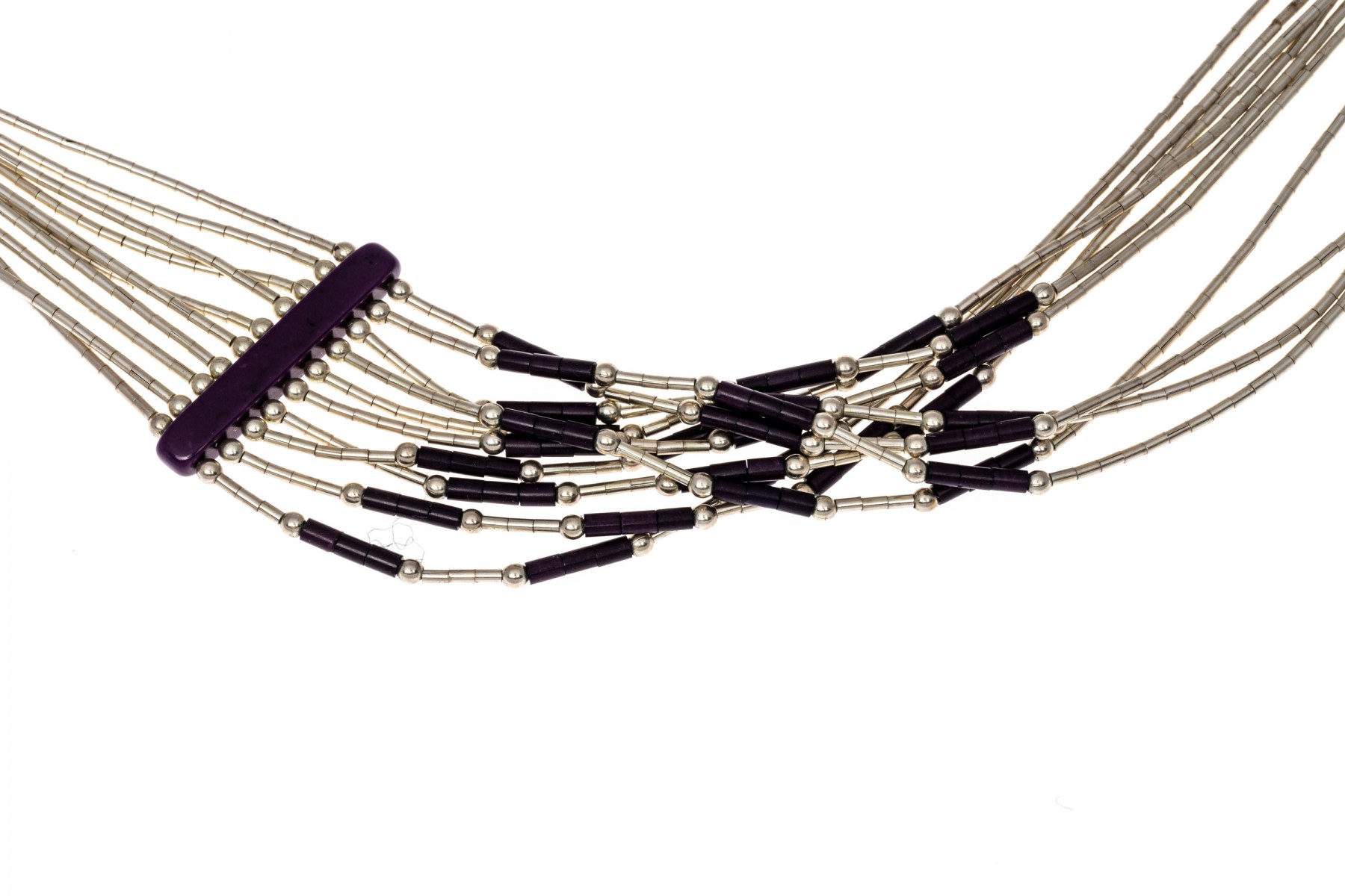 Sterling silver beaded necklace. This unique necklace displays ten beaded strands set with an asymmetrical accent of purple beads for an eye-catching pop of color. Hook style clasp.