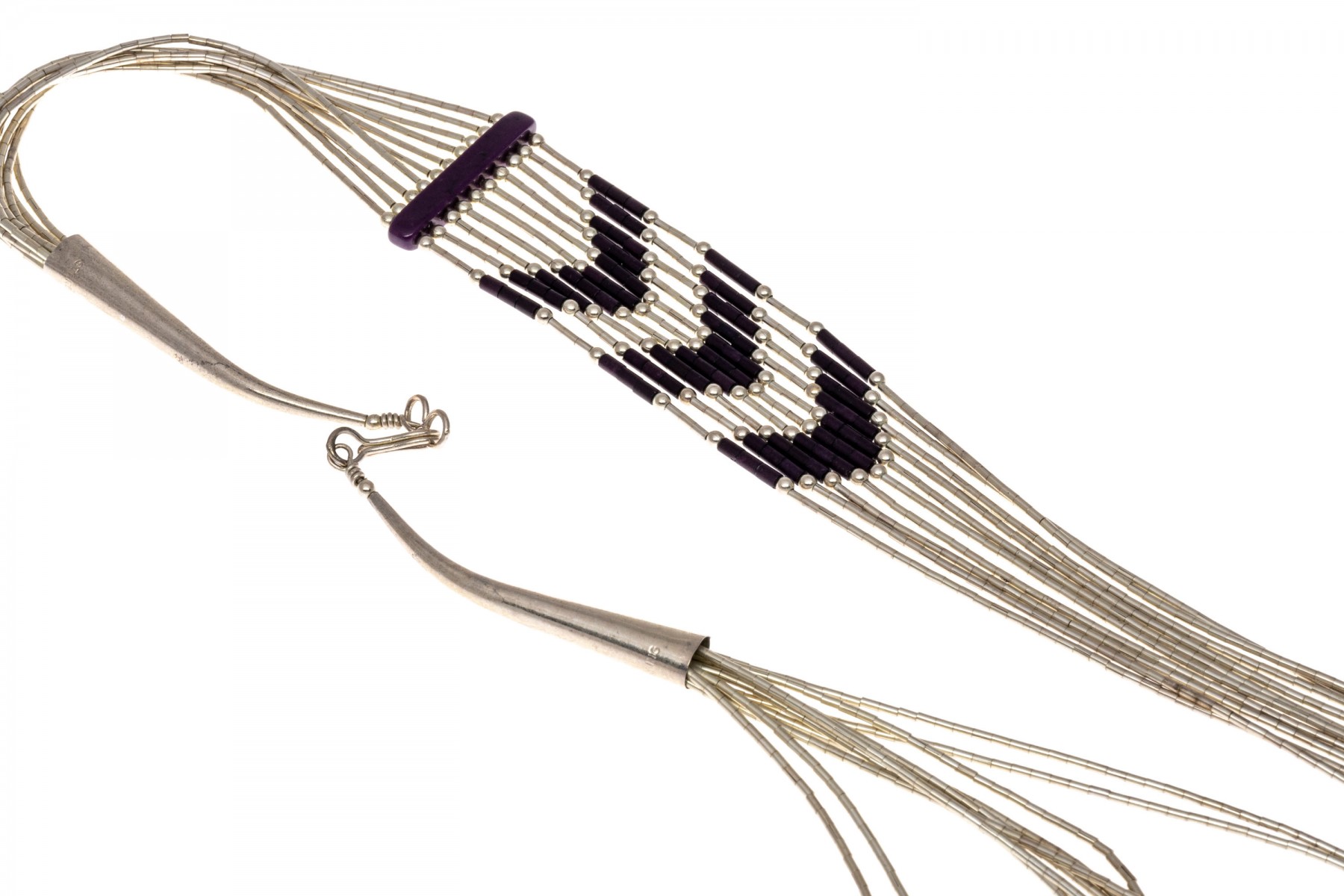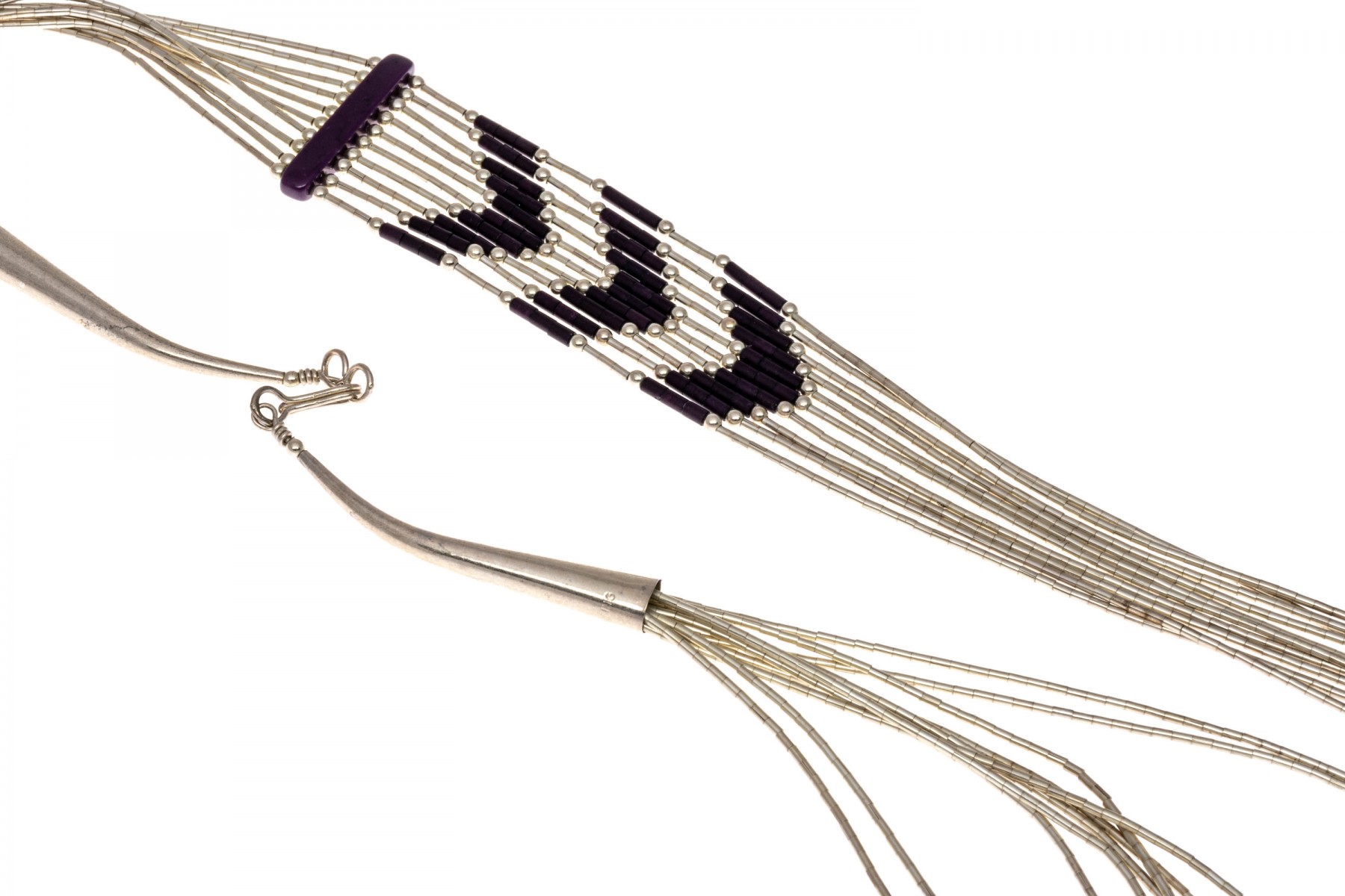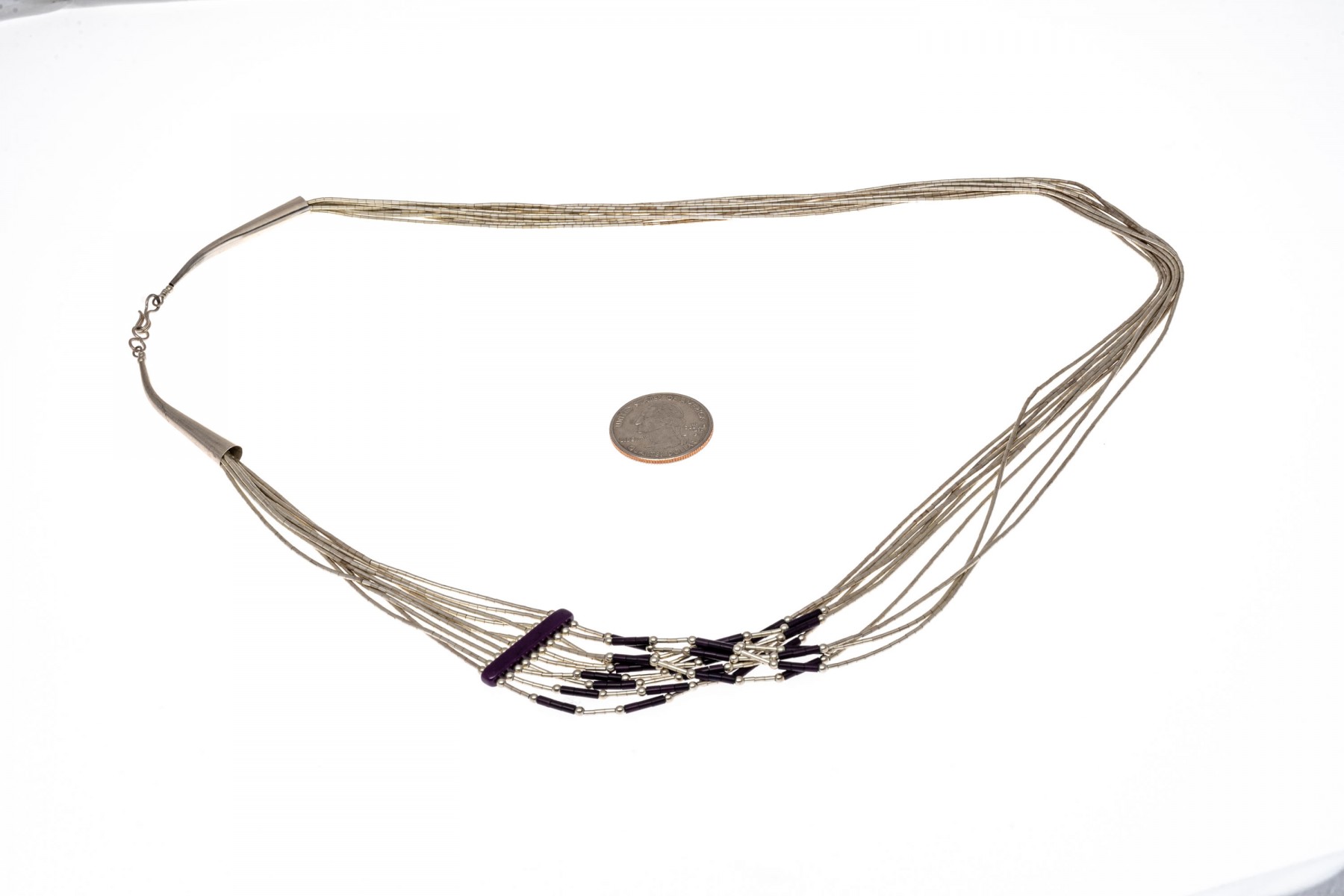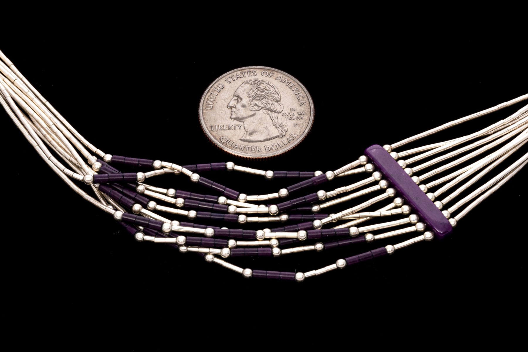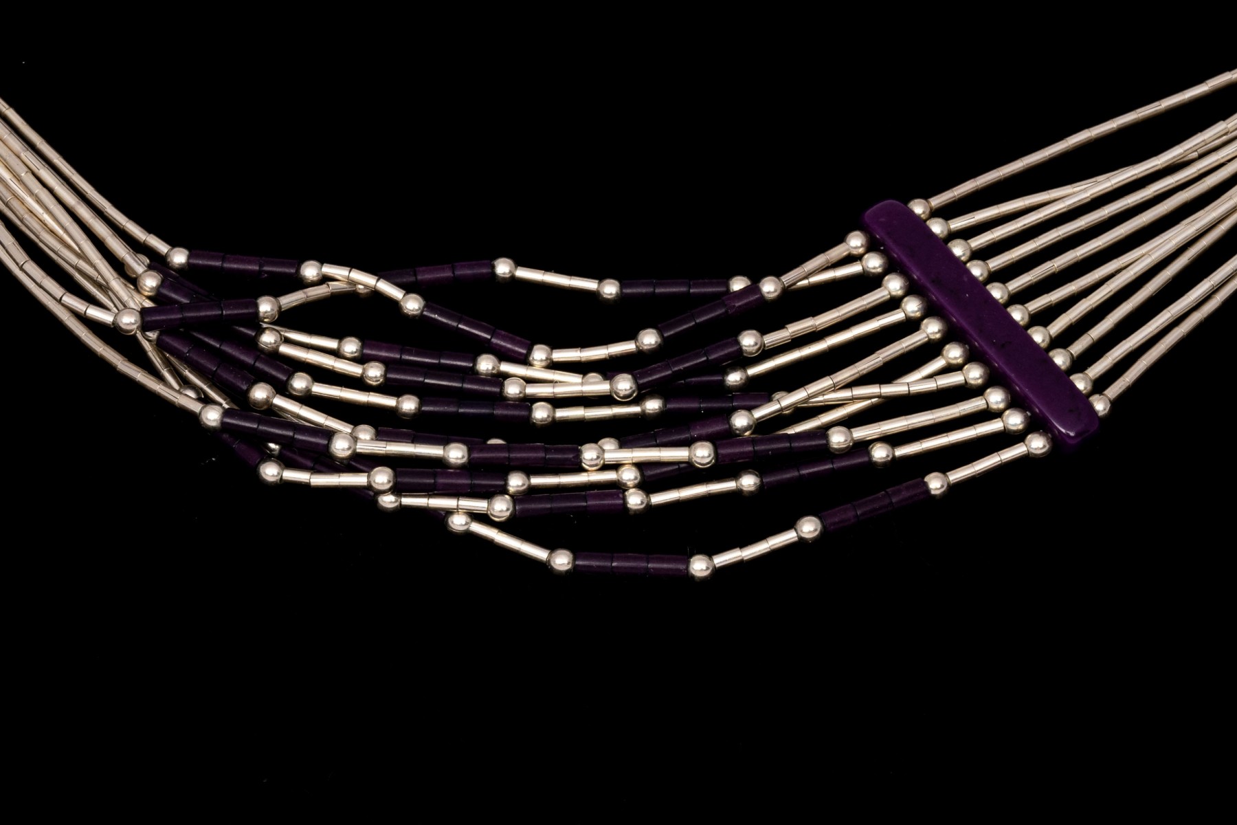 Sterling silver beaded necklace. This unique necklace displays ten beaded strands set with an asymmetrical accent of purple beads for an eye-catching pop of color. Hook style clasp.