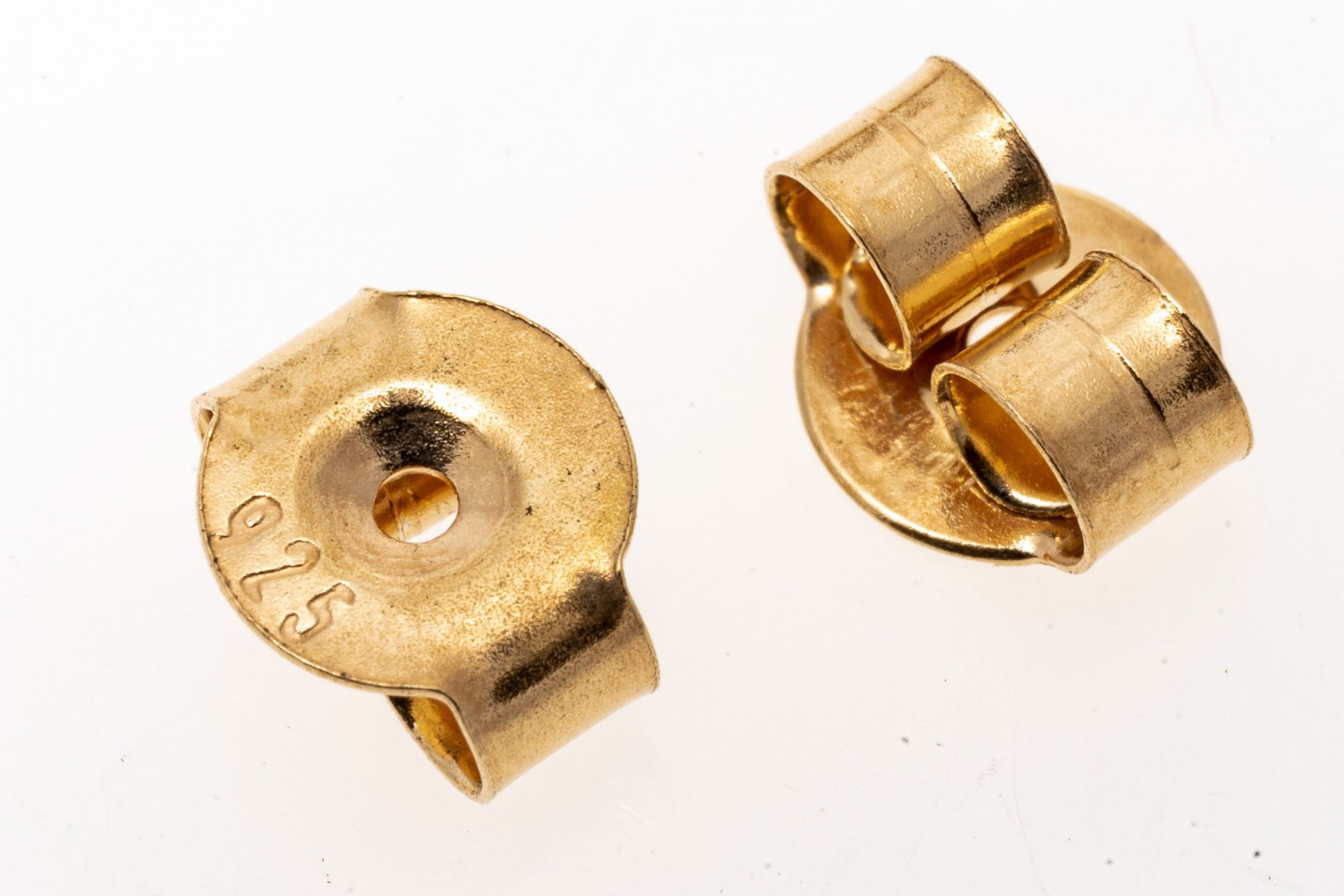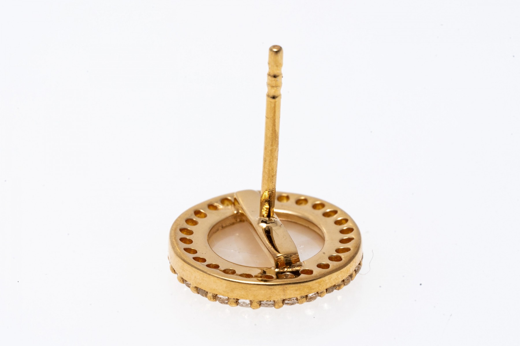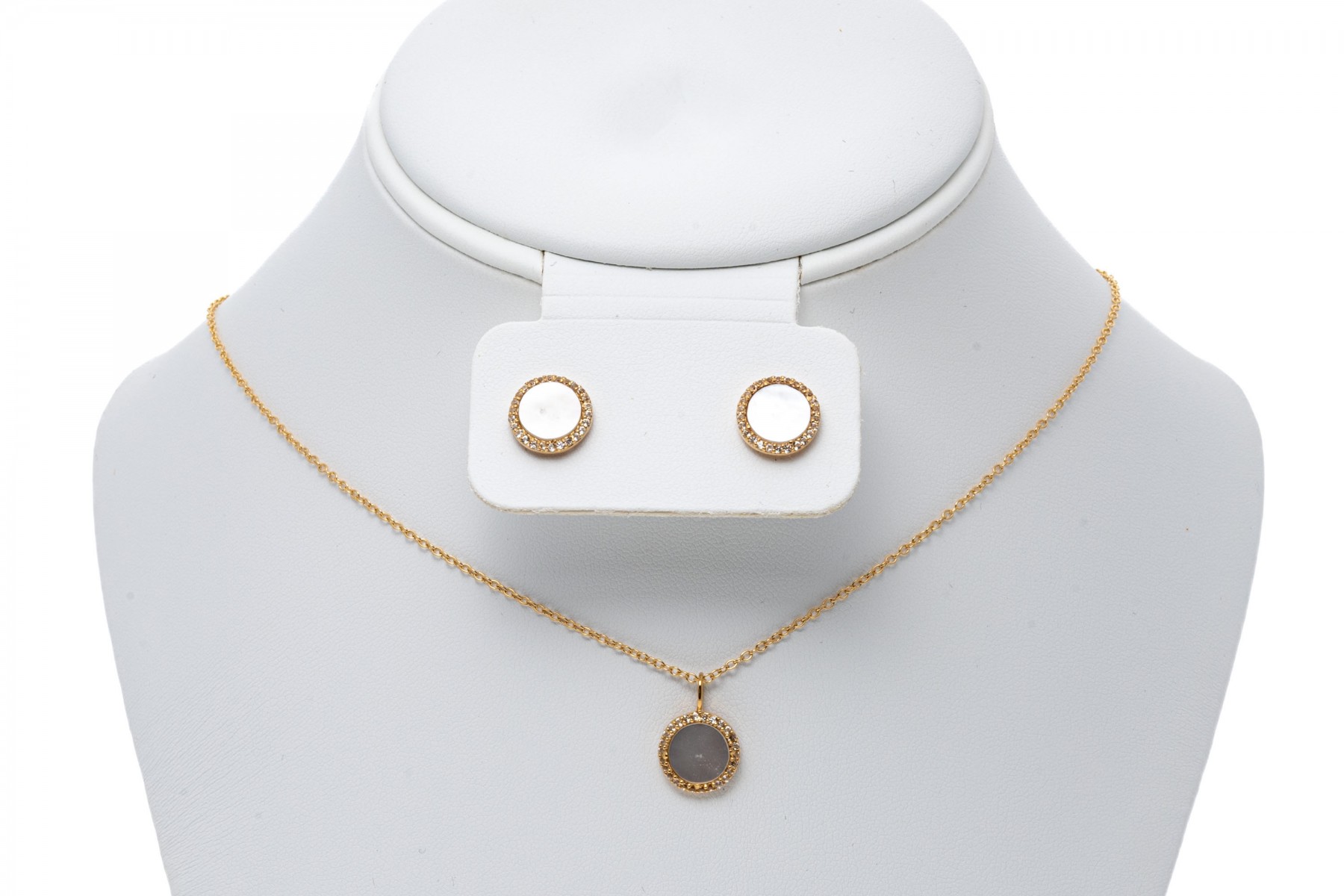 Sterling silver vermeil pendant necklace and earrings set. The necklace displays a pendant disk with mother of pearl surrounded in white topaz, spring ring clasp. The matching earrings also display mother of pearl with in