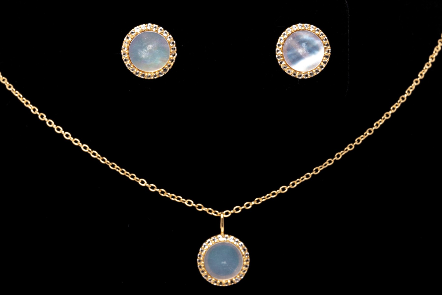 Sterling silver vermeil pendant necklace and earrings set. The necklace displays a pendant disk with mother of pearl surrounded in white topaz, spring ring clasp. The matching earrings also display mother of pearl with in