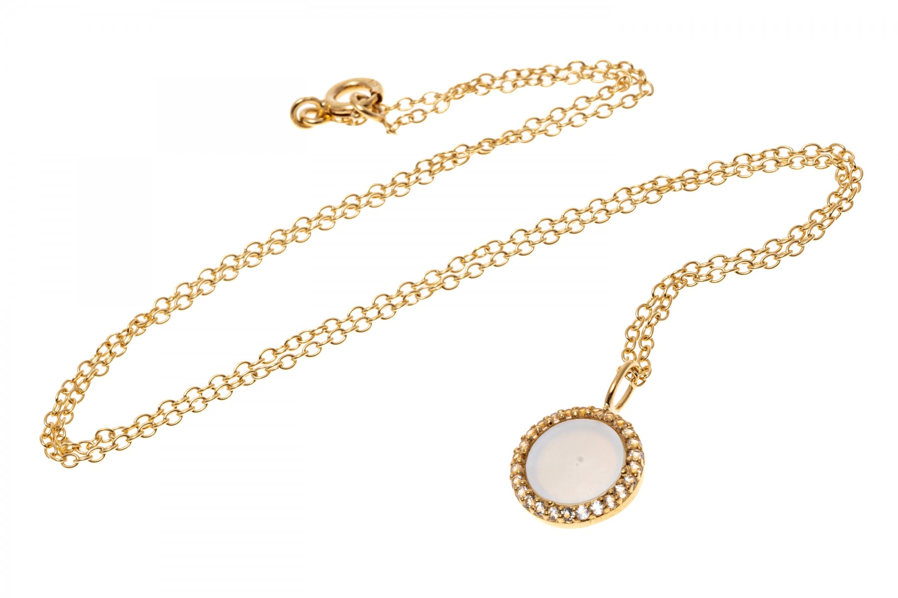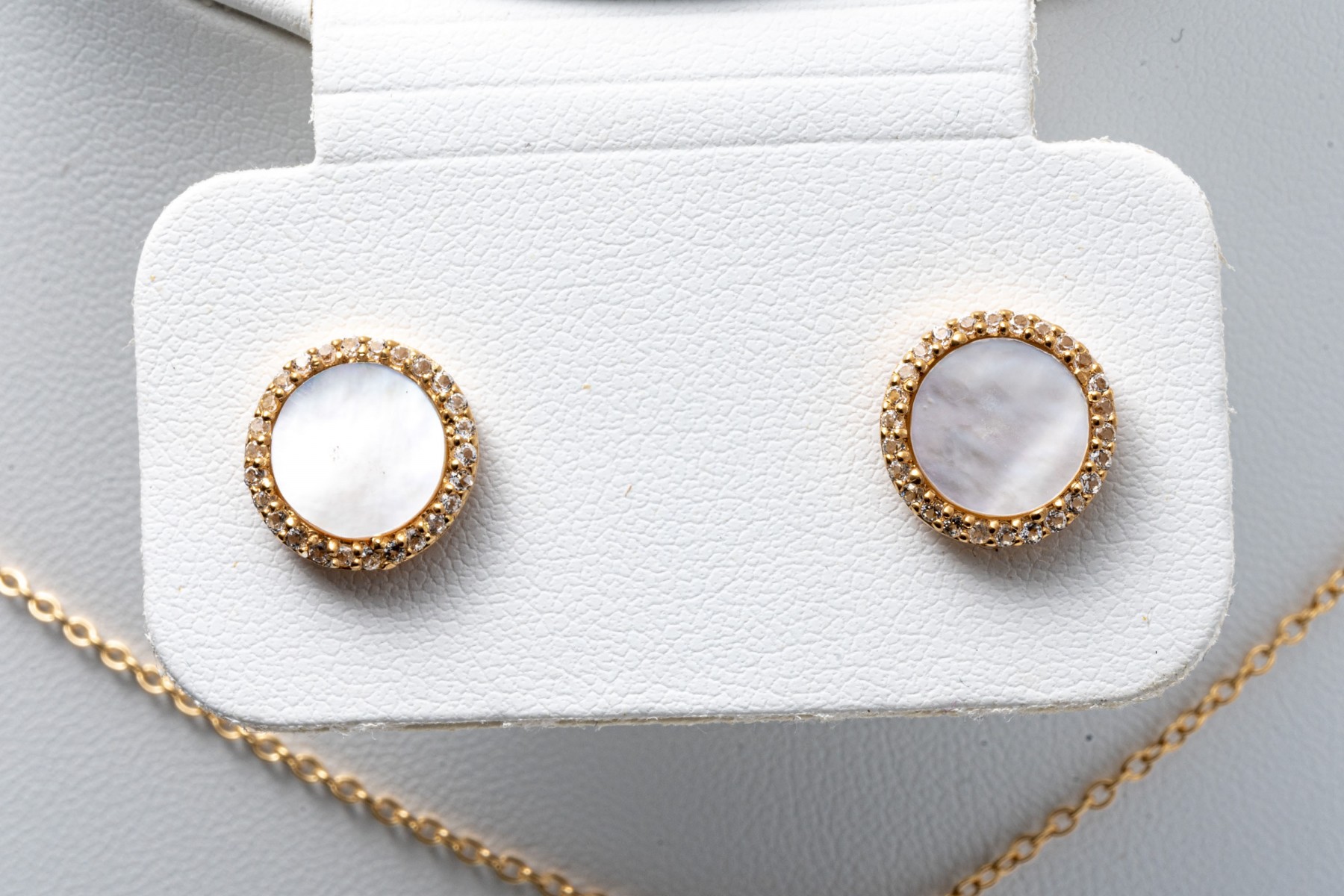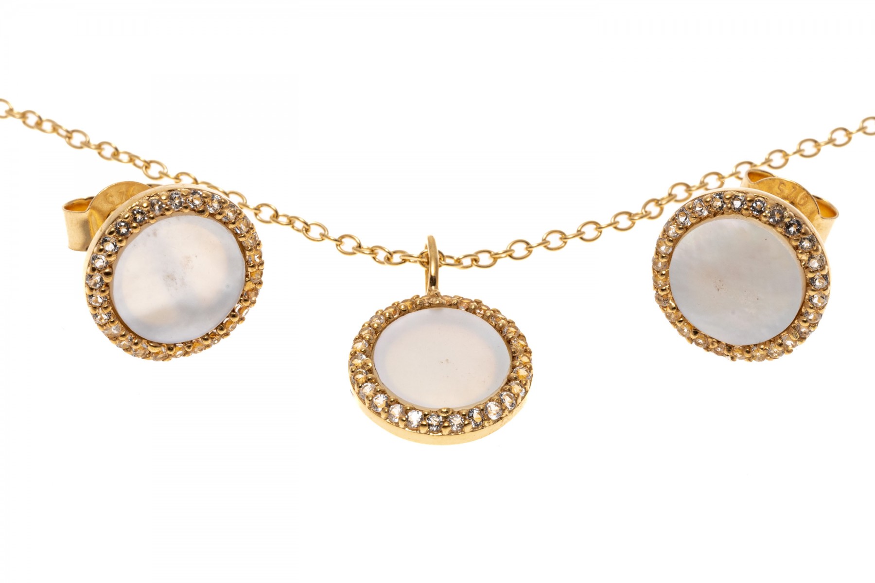 Sterling silver vermeil pendant necklace and earrings set. The necklace displays a pendant disk with mother of pearl surrounded in white topaz, spring ring clasp. The matching earrings also display mother of pearl with in