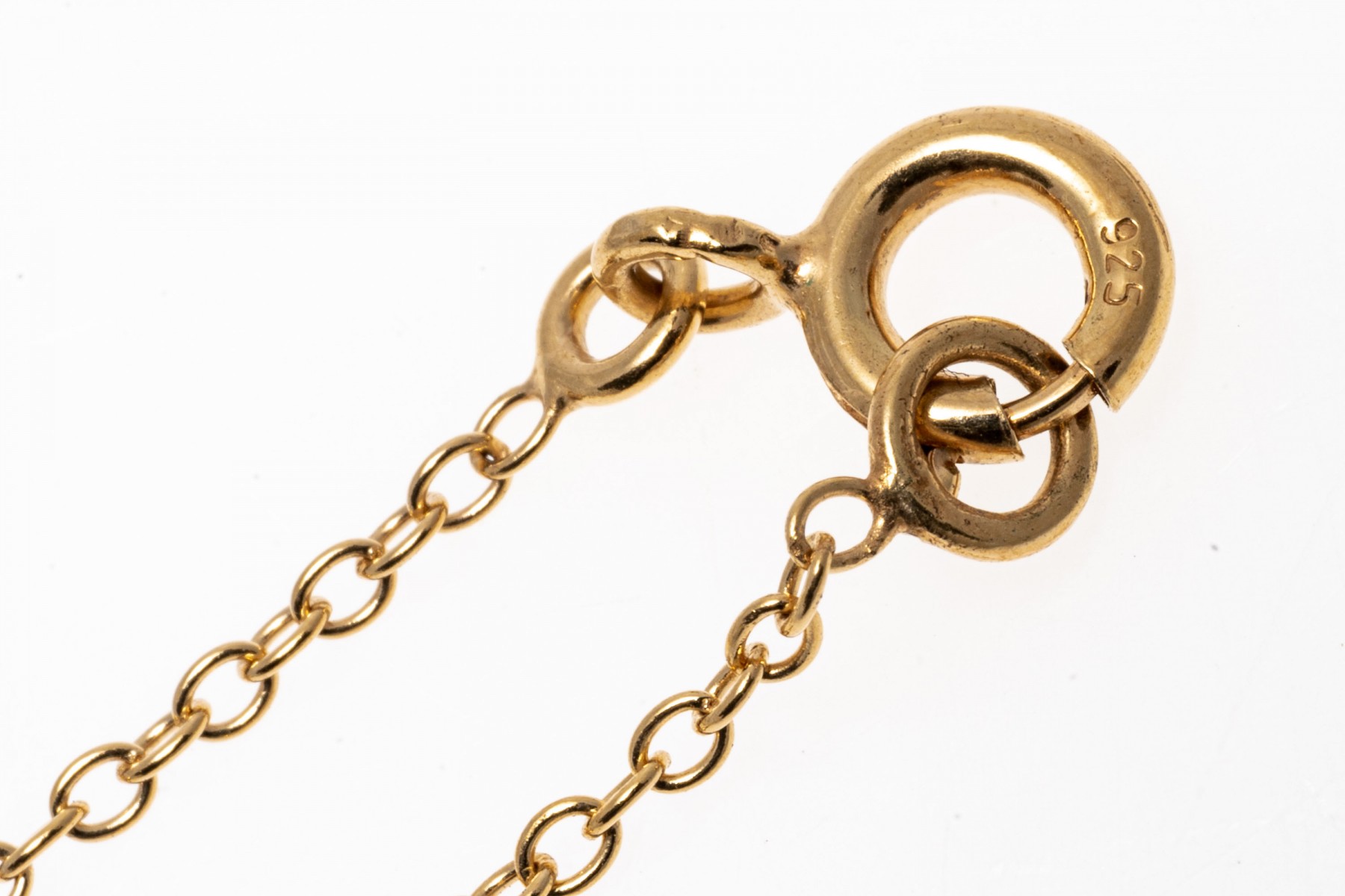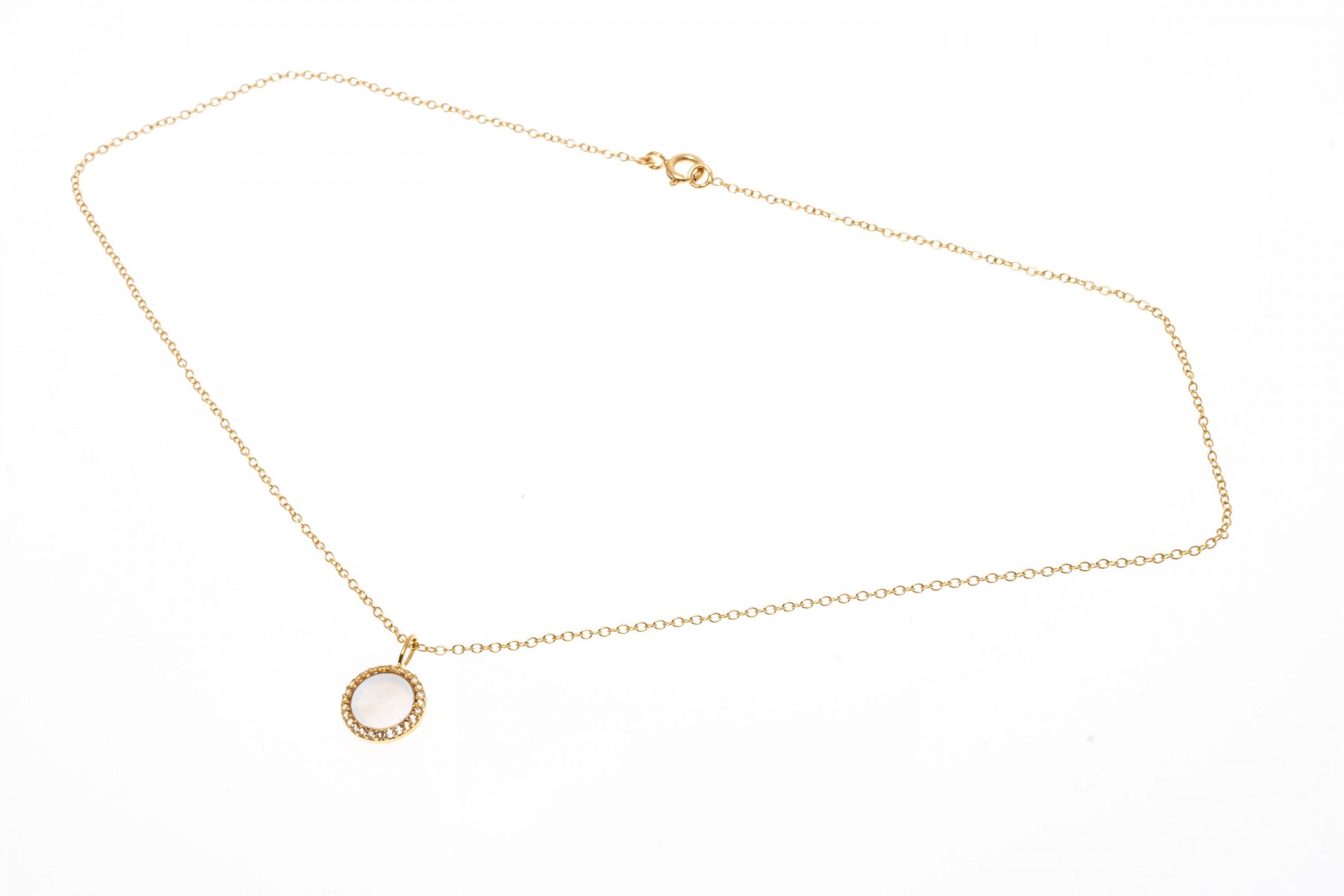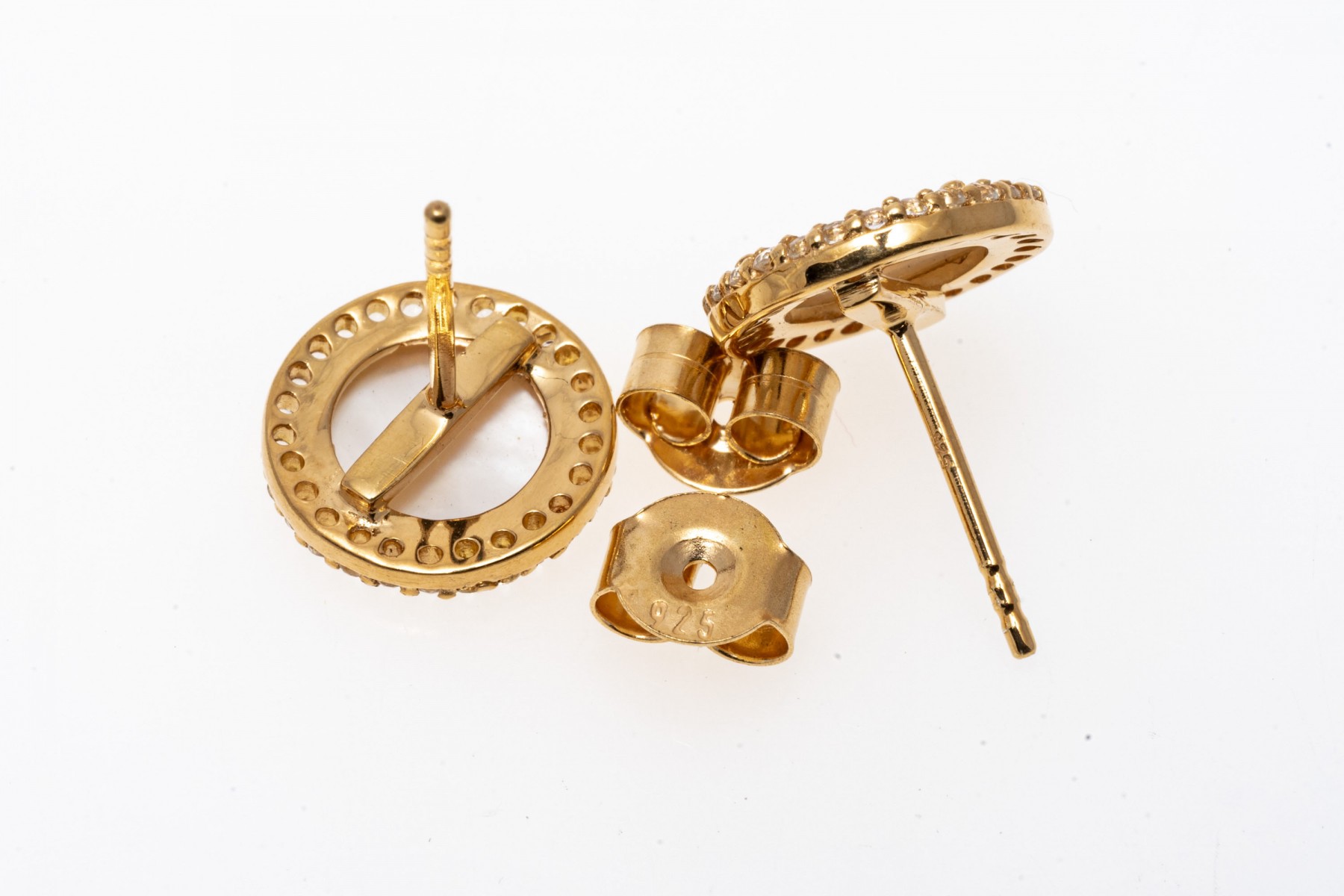 Sterling silver vermeil pendant necklace and earrings set. The necklace displays a pendant disk with mother of pearl surrounded in white topaz, spring ring clasp. The matching earrings also display mother of pearl with in