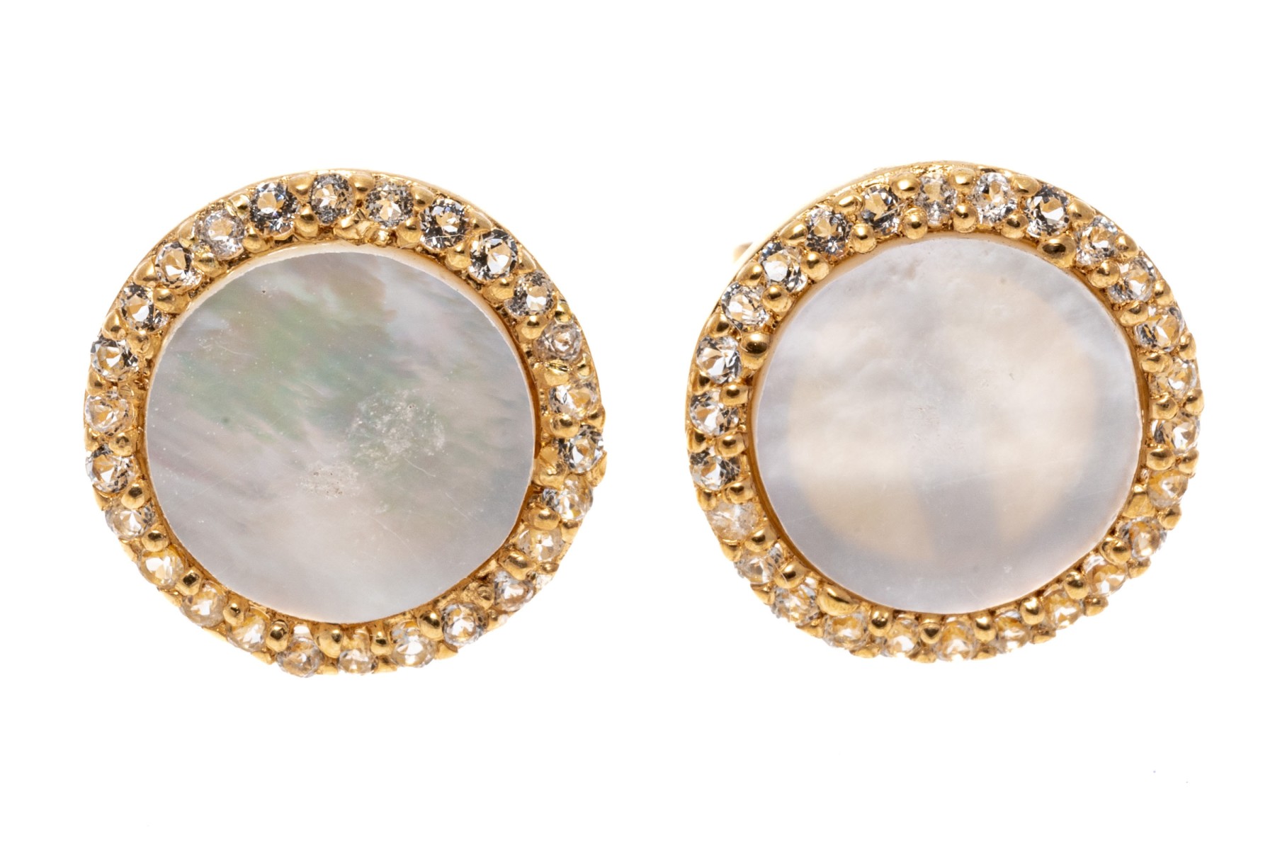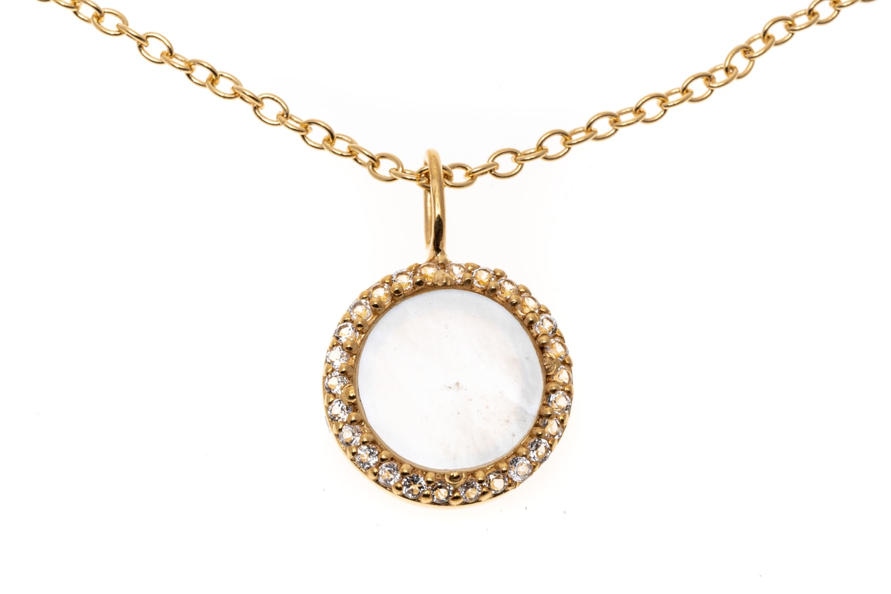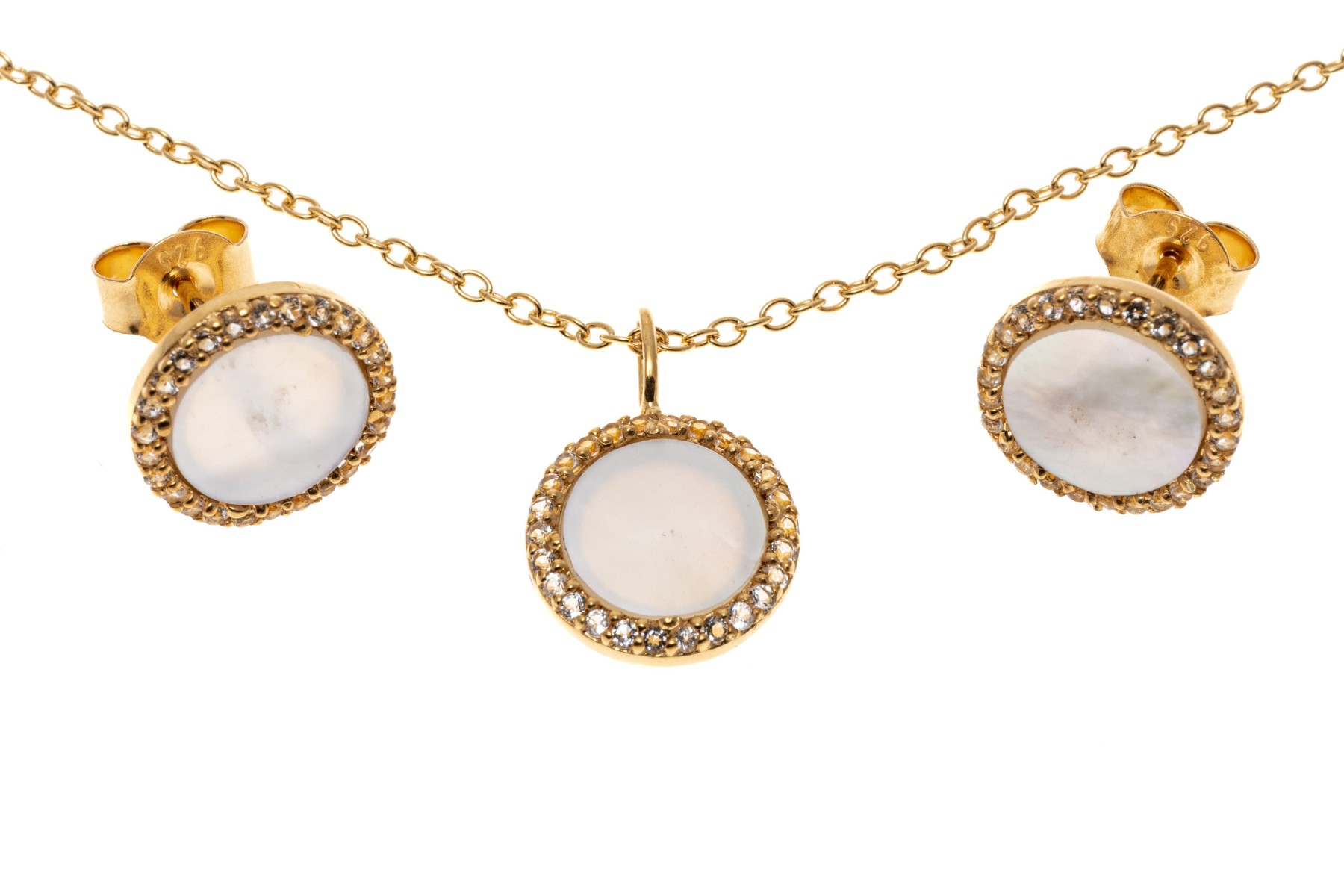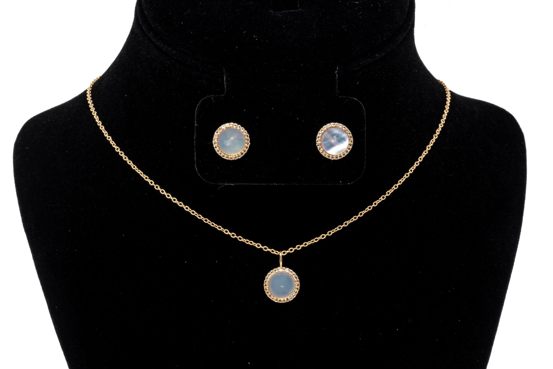 Sterling silver vermeil pendant necklace and earrings set. The necklace displays a pendant disk with mother of pearl surrounded in white topaz, spring ring clasp. The matching earrings also display mother of pearl with in