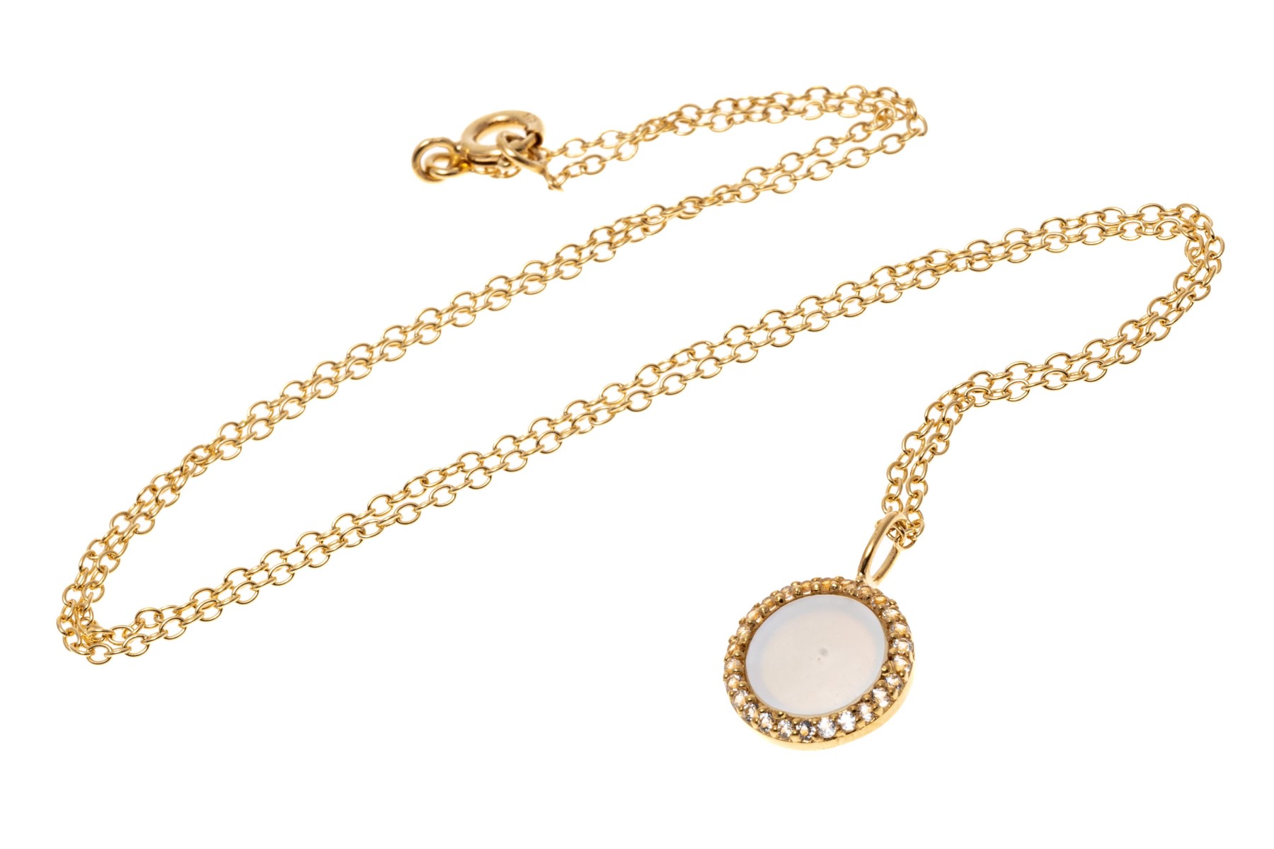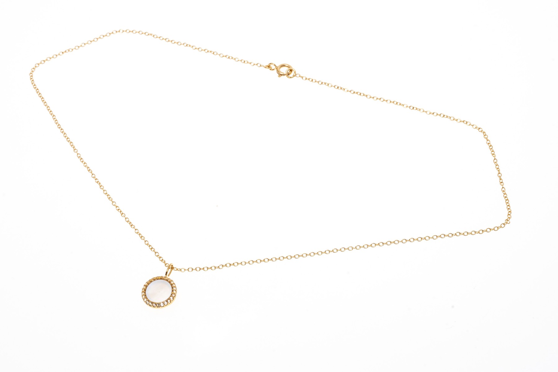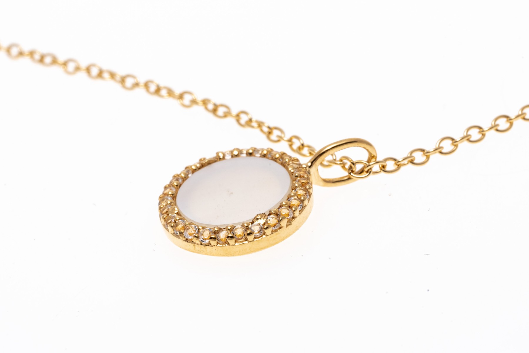 Sterling silver vermeil pendant necklace and earrings set. The necklace displays a pendant disk with mother of pearl surrounded in white topaz, spring ring clasp. The matching earrings also display mother of pearl with in