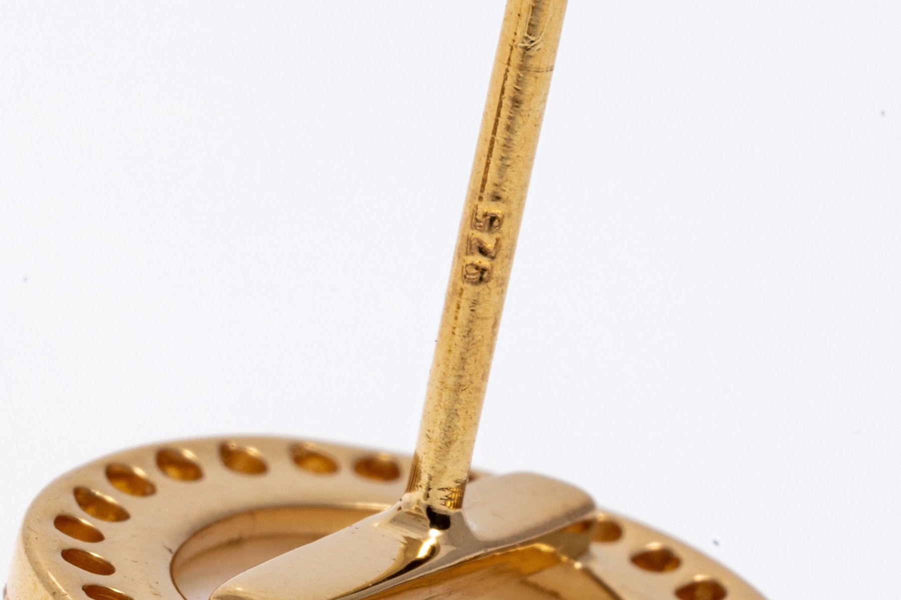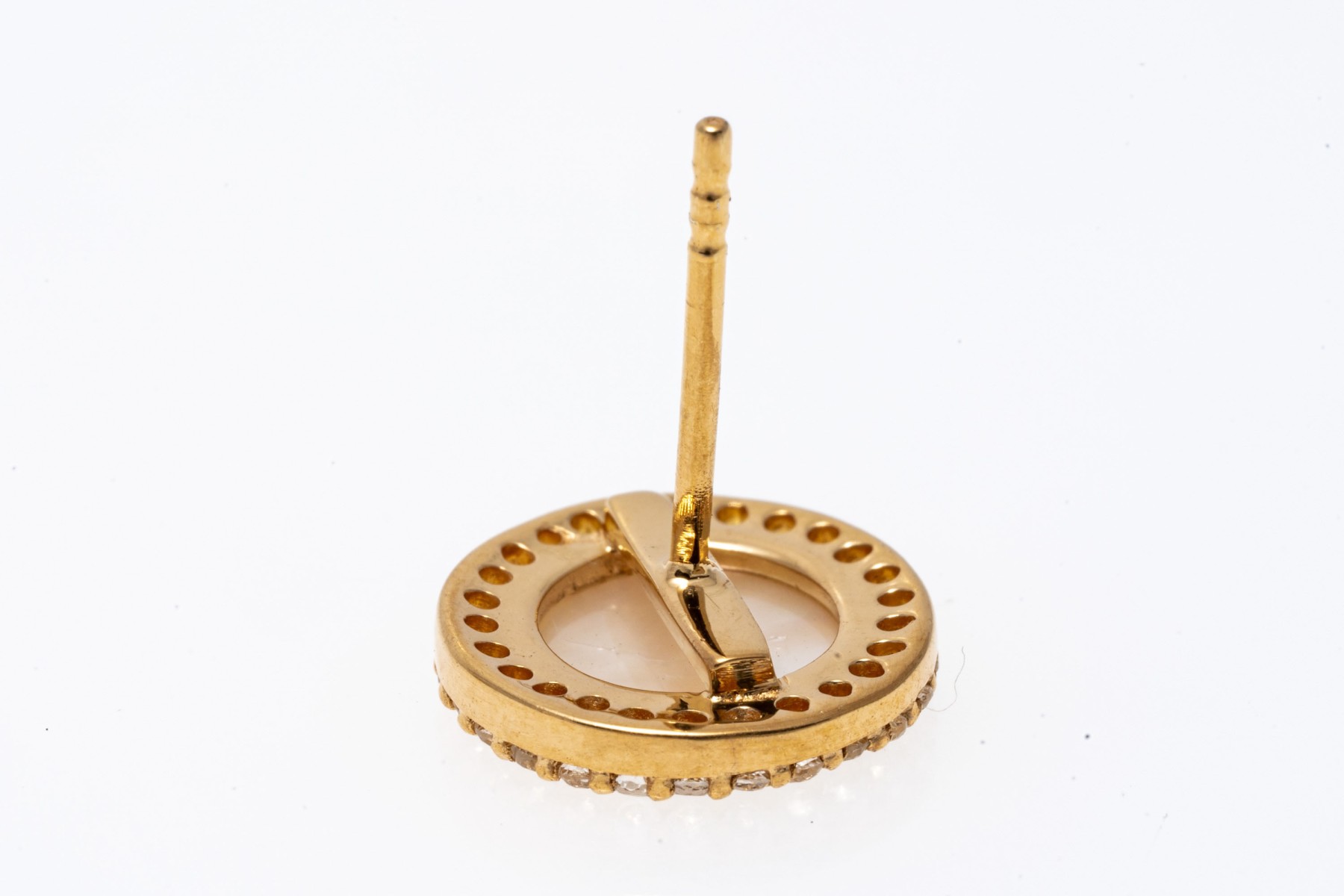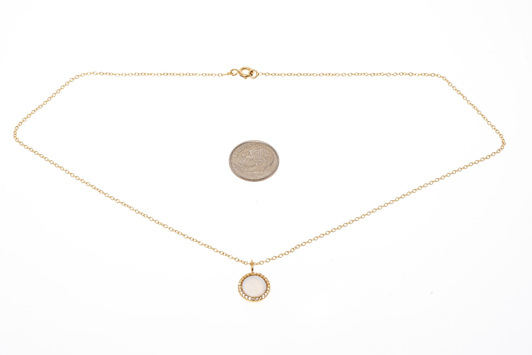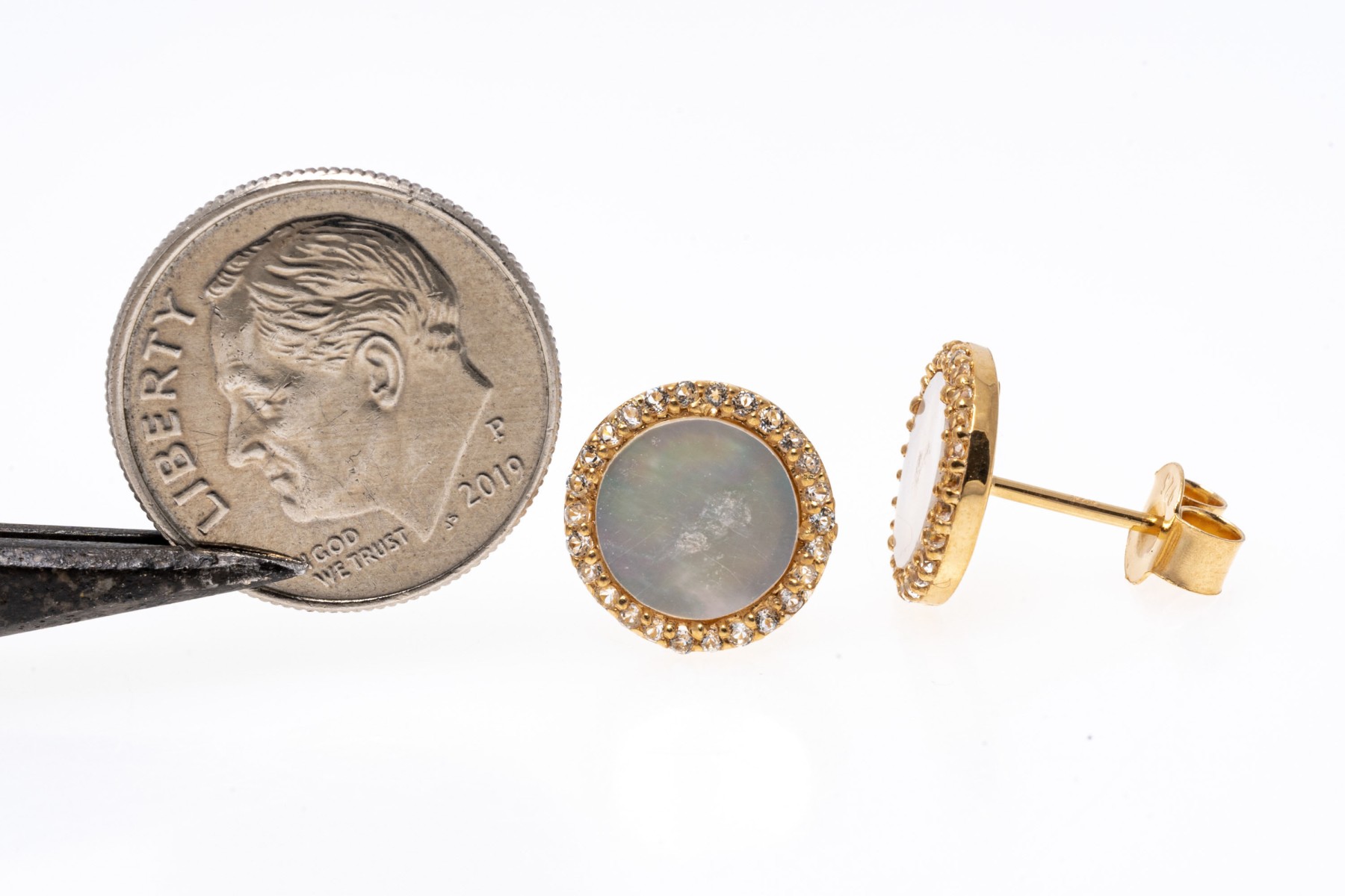 Sterling silver vermeil pendant necklace and earrings set. The necklace displays a pendant disk with mother of pearl surrounded in white topaz, spring ring clasp. The matching earrings also display mother of pearl with in