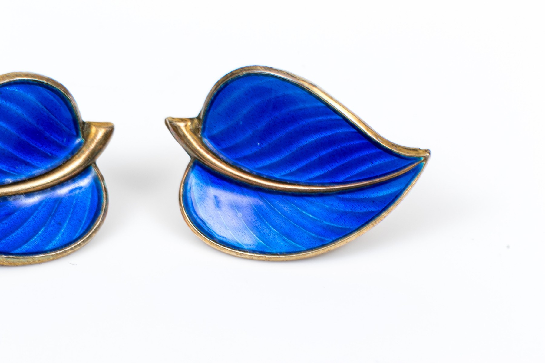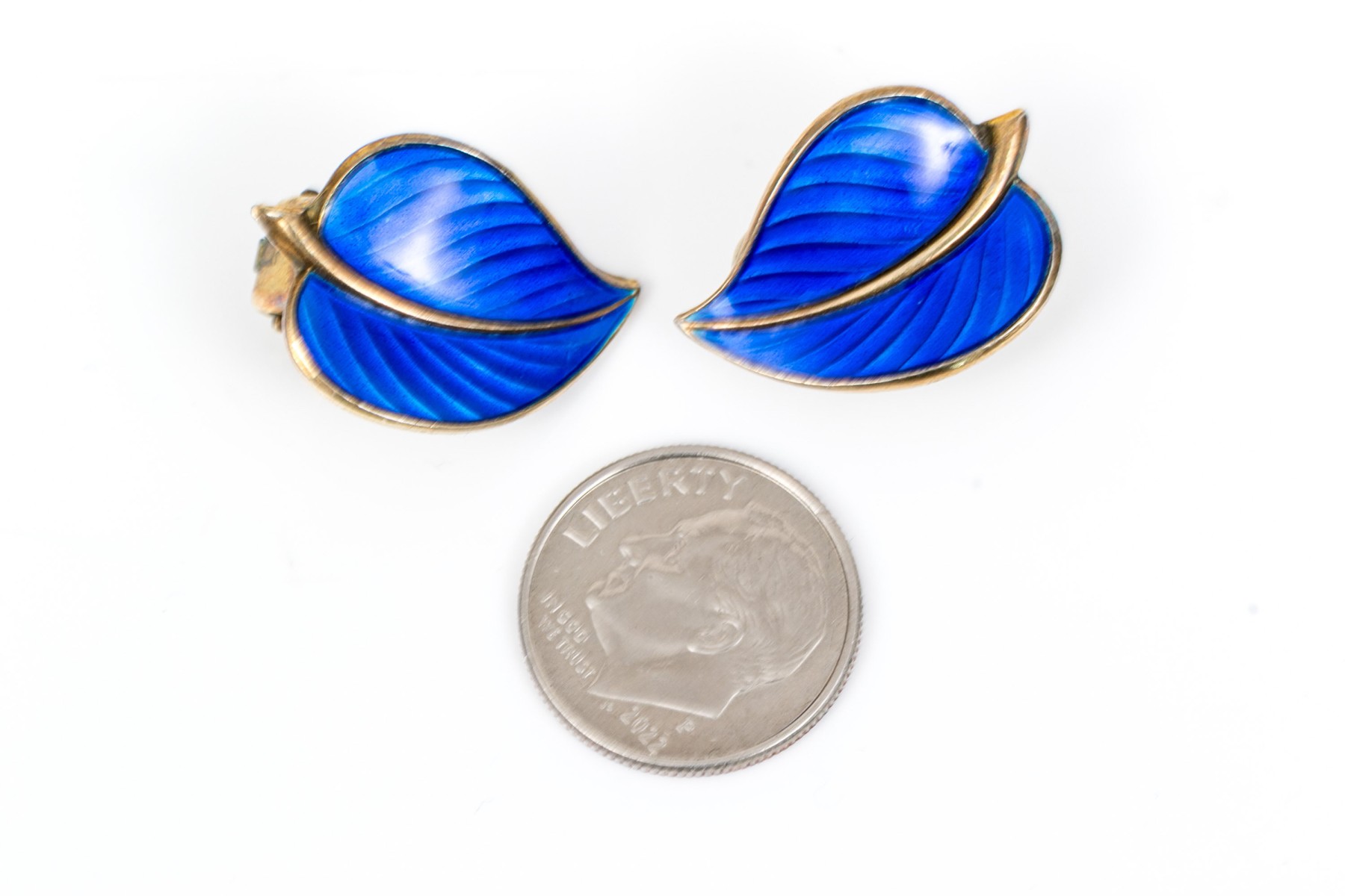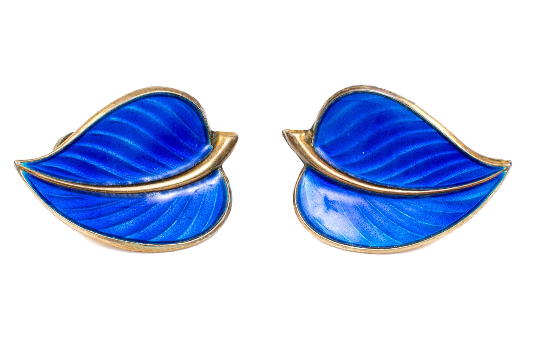 Sterling silver clip back earrings. These opposing leaf form earrings are accented with a deep blue enamel. Clip style backings.