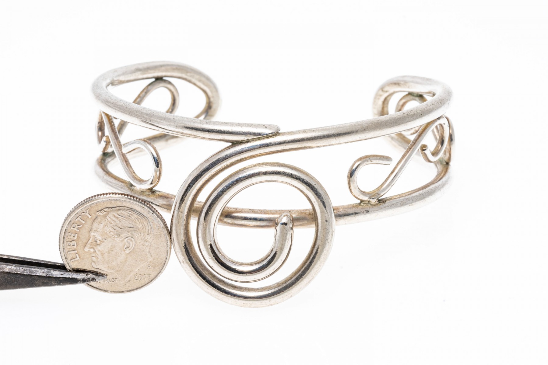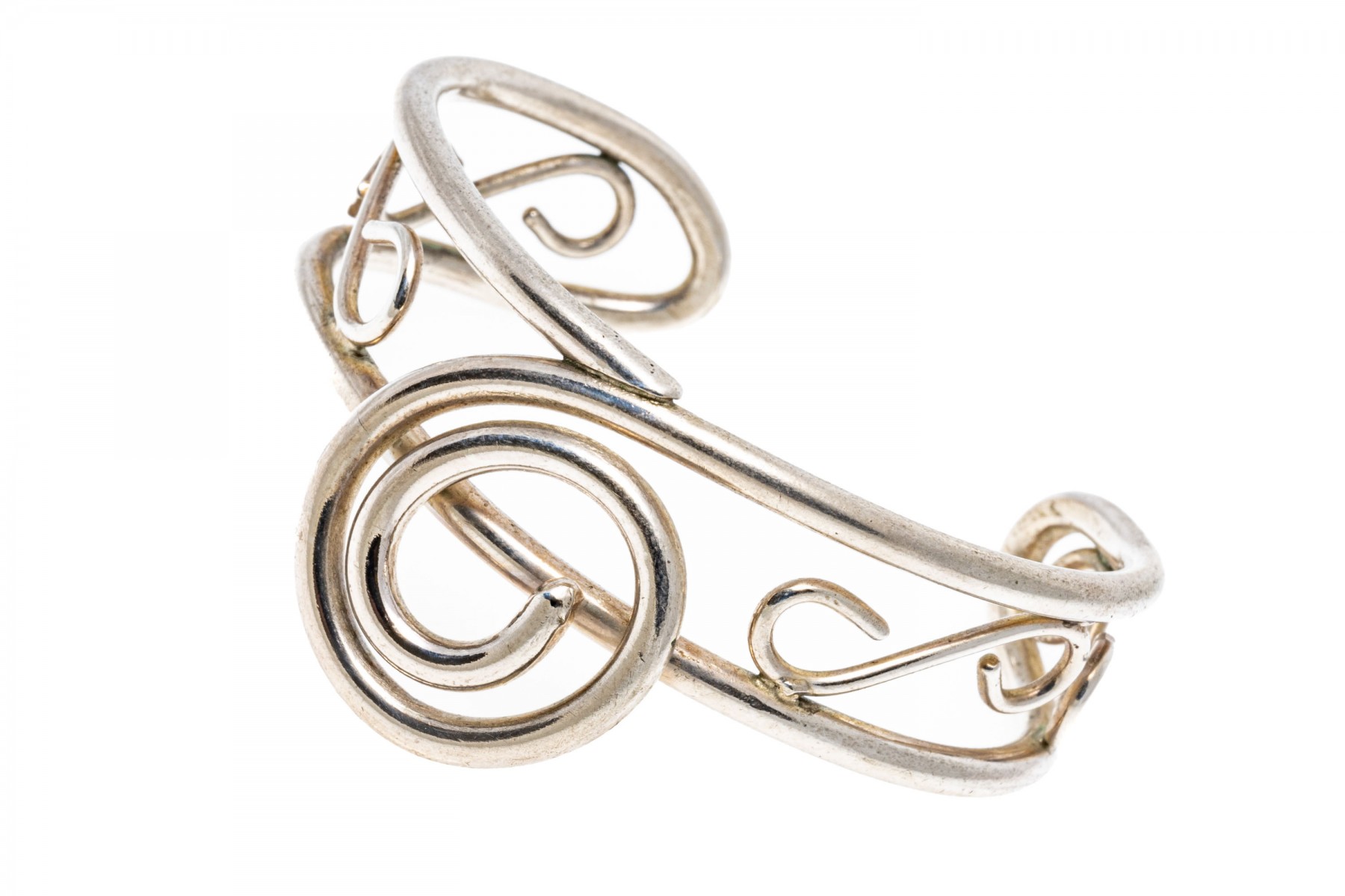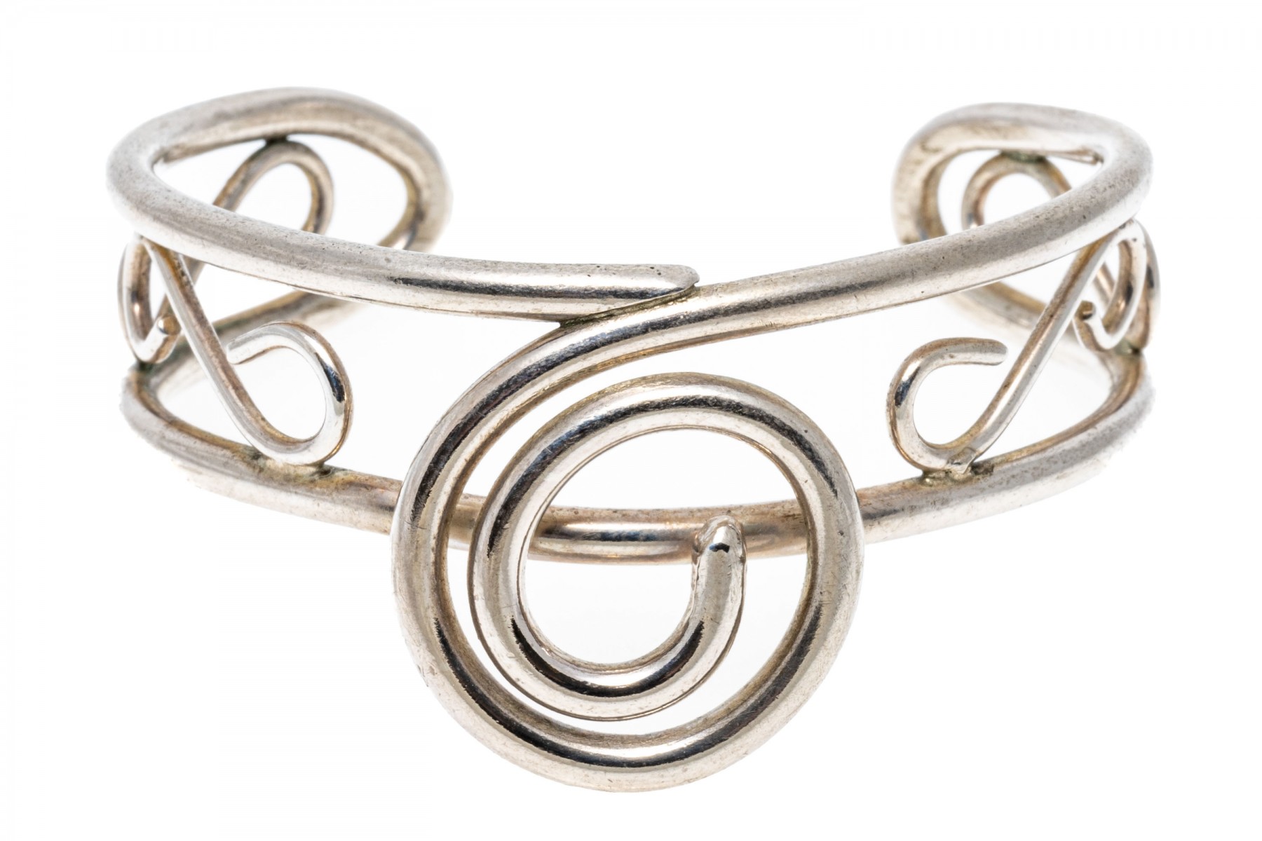 Sterling silver cuff bracelet. The bracelet has an open style band with scrollwork accents and large spiral at the center.
