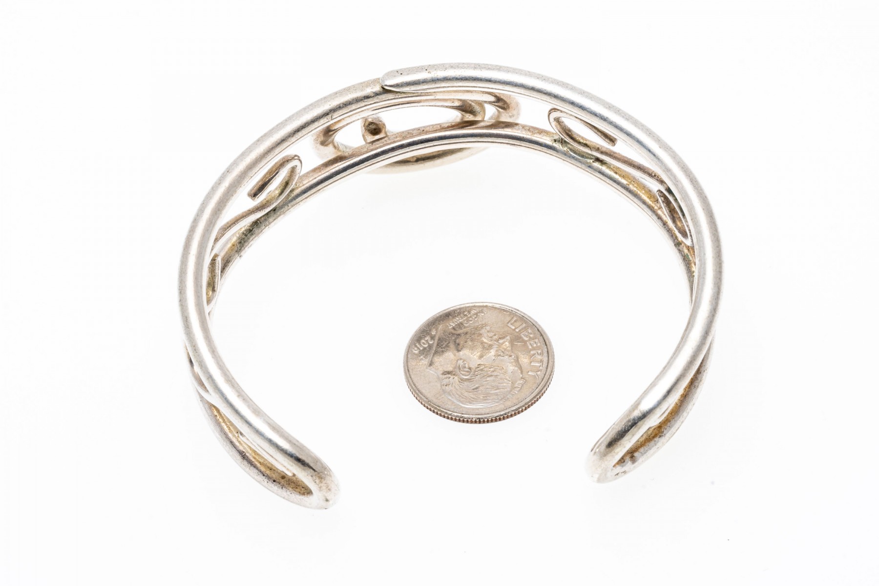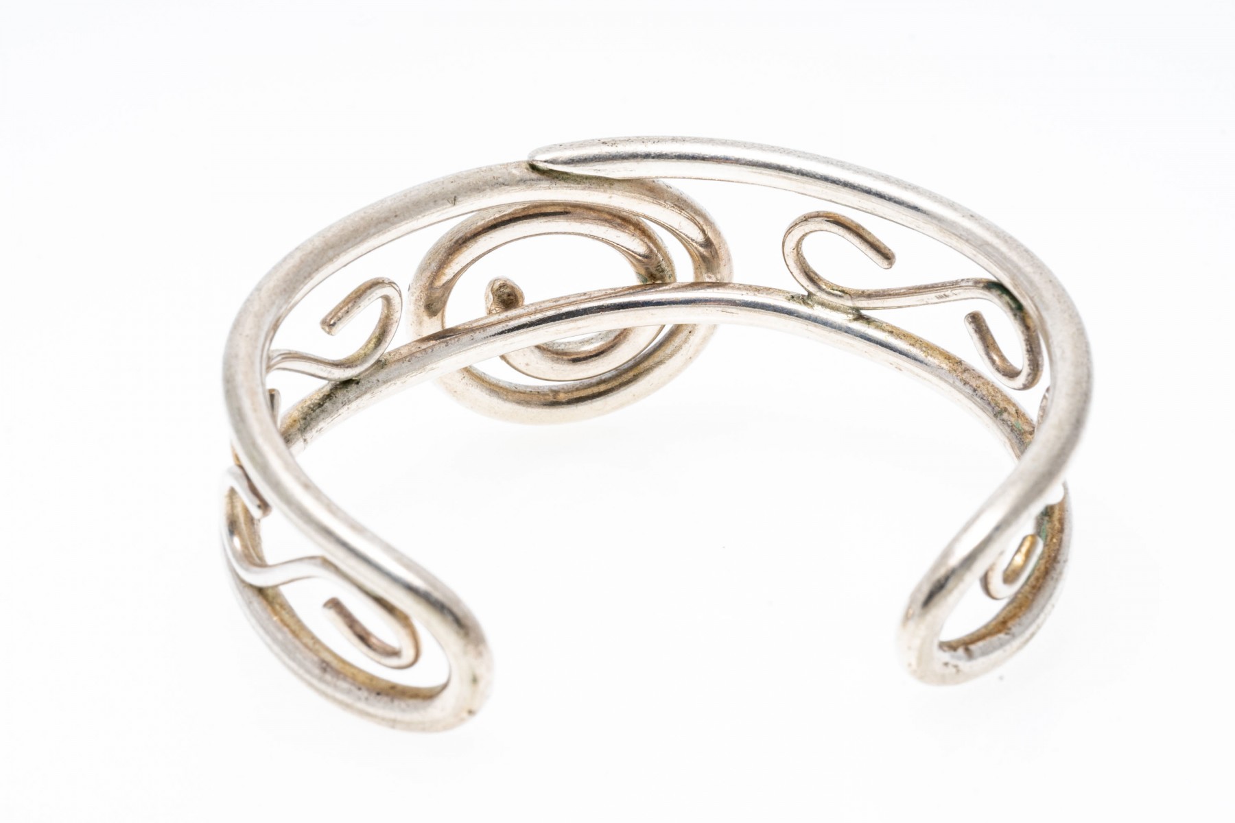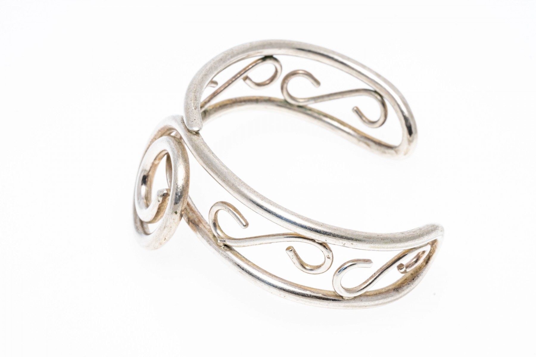 Sterling silver cuff bracelet. The bracelet has an open style band with scrollwork accents and large spiral at the center.