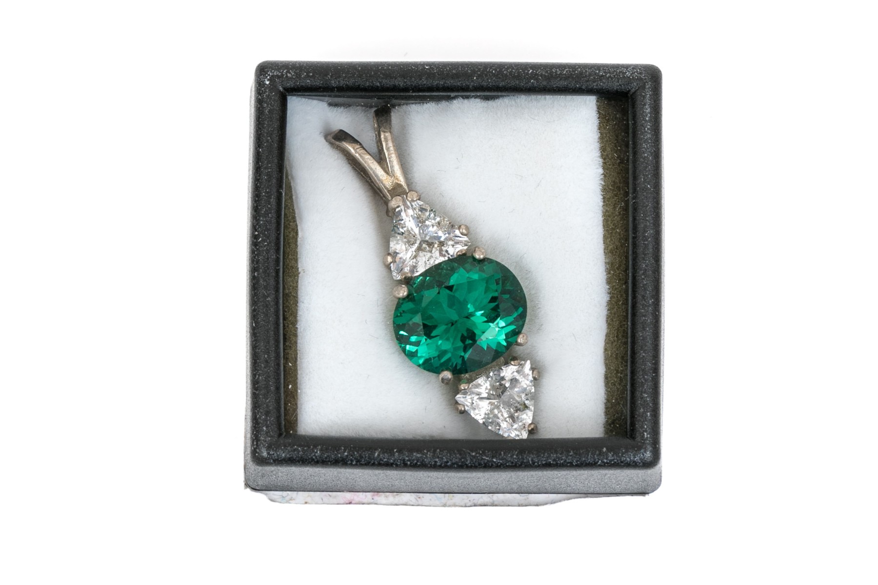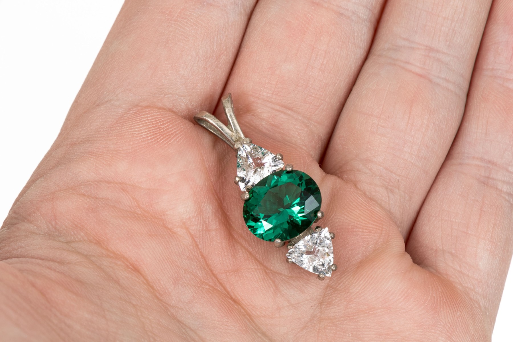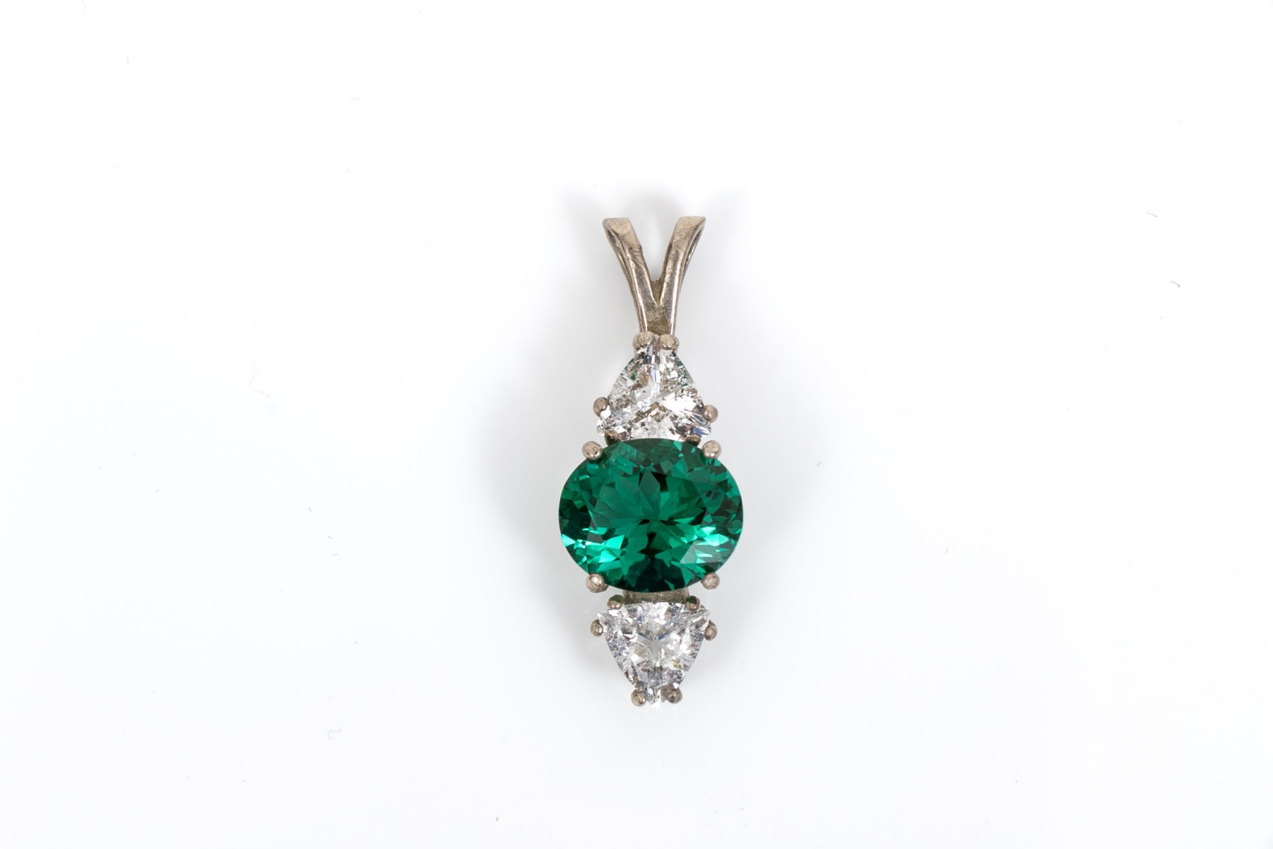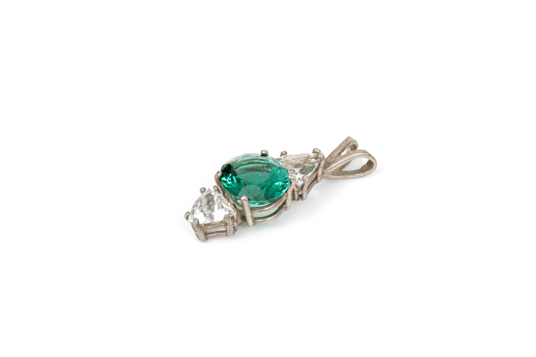 A sterling silver pendant set with an oval faceted green Siberian quartz. Above and below the green quartz are opposing stones of white triangular cut Danburite. Split style bale.