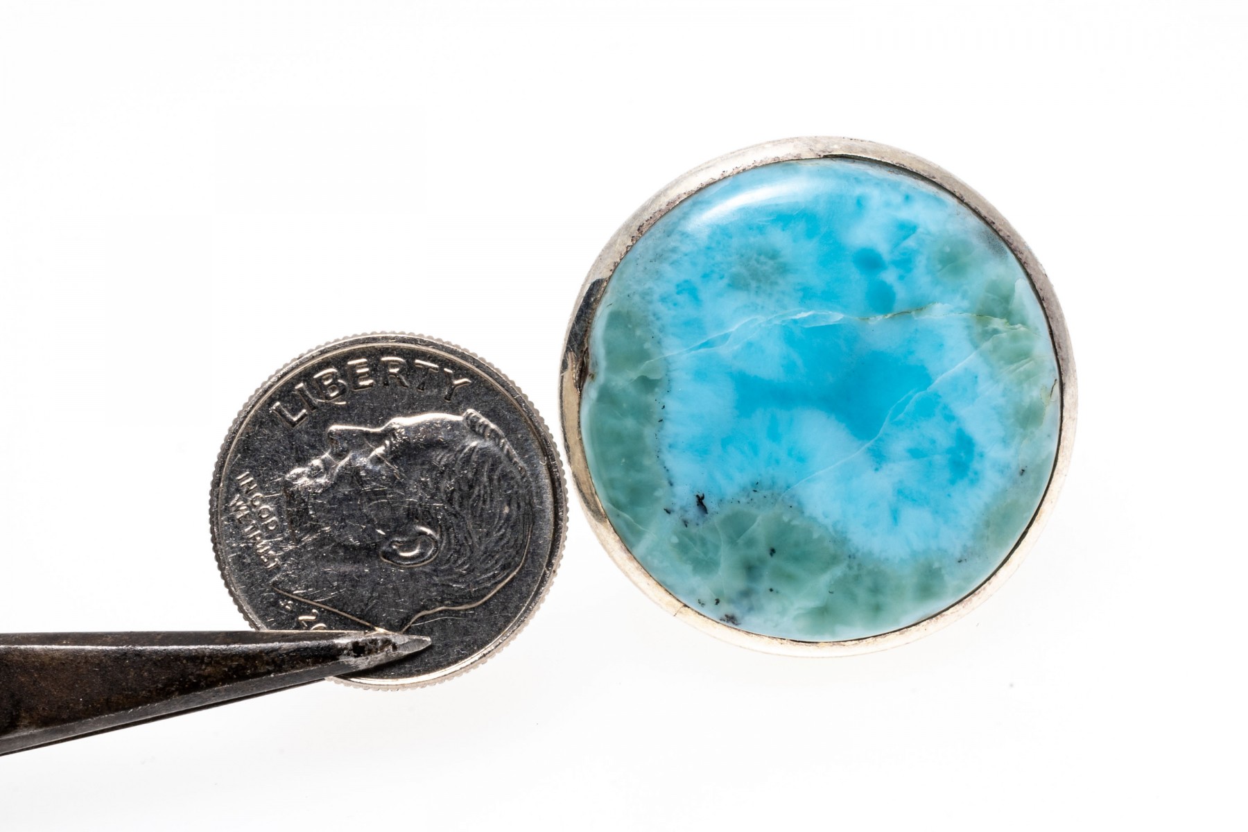 A bold Larimar stone with a bright blue coloring has a round cabochon cut and is set into a sterling silver ring. Ring size 8.5.