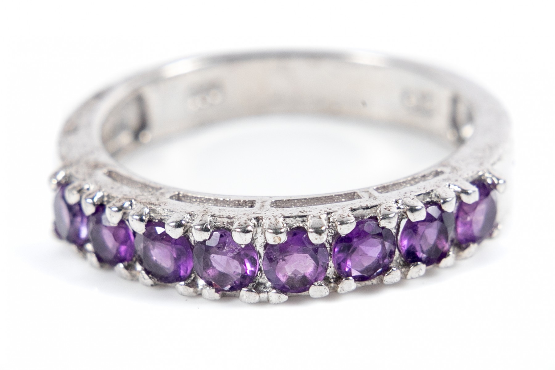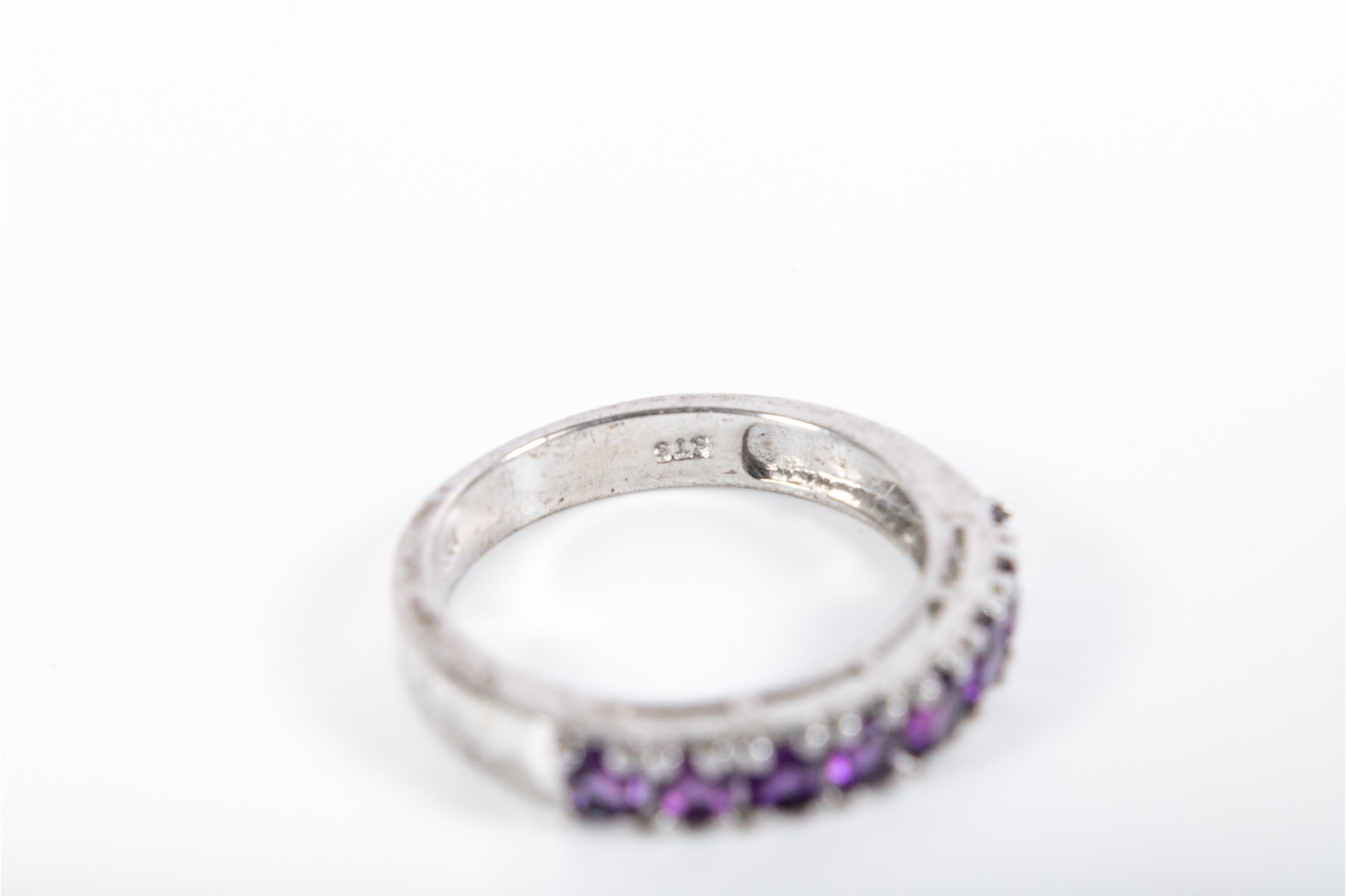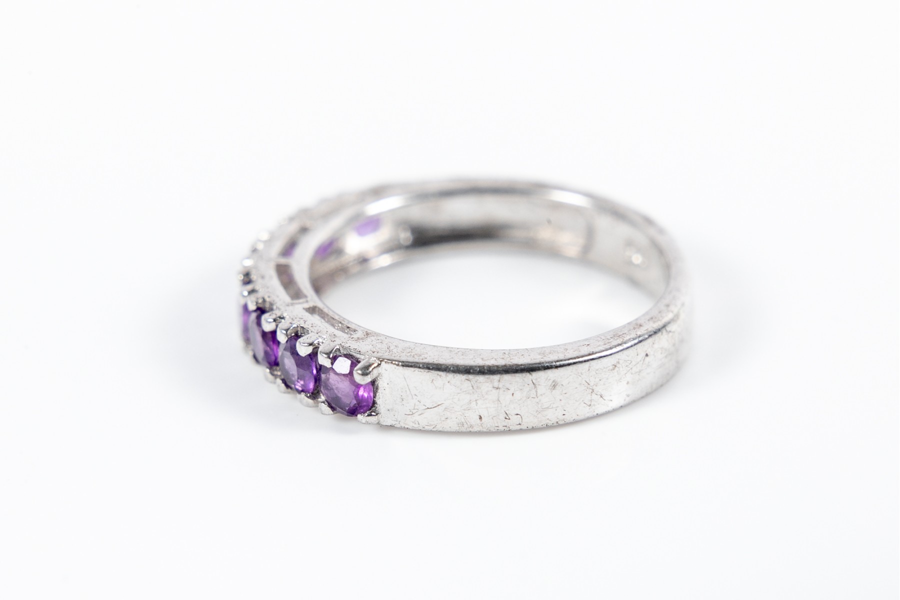 A simple and pretty sterling silver ring displaying round, vibrant purple amethysts.