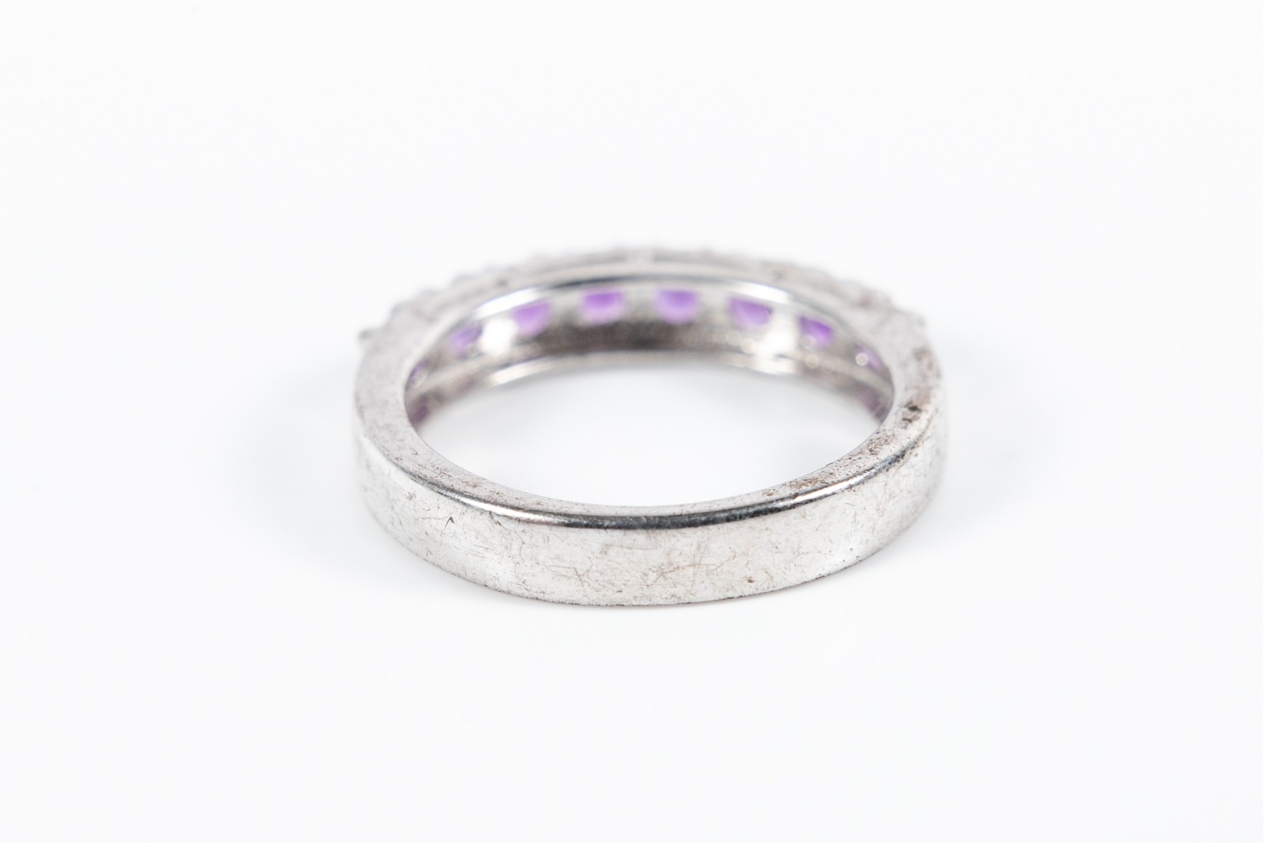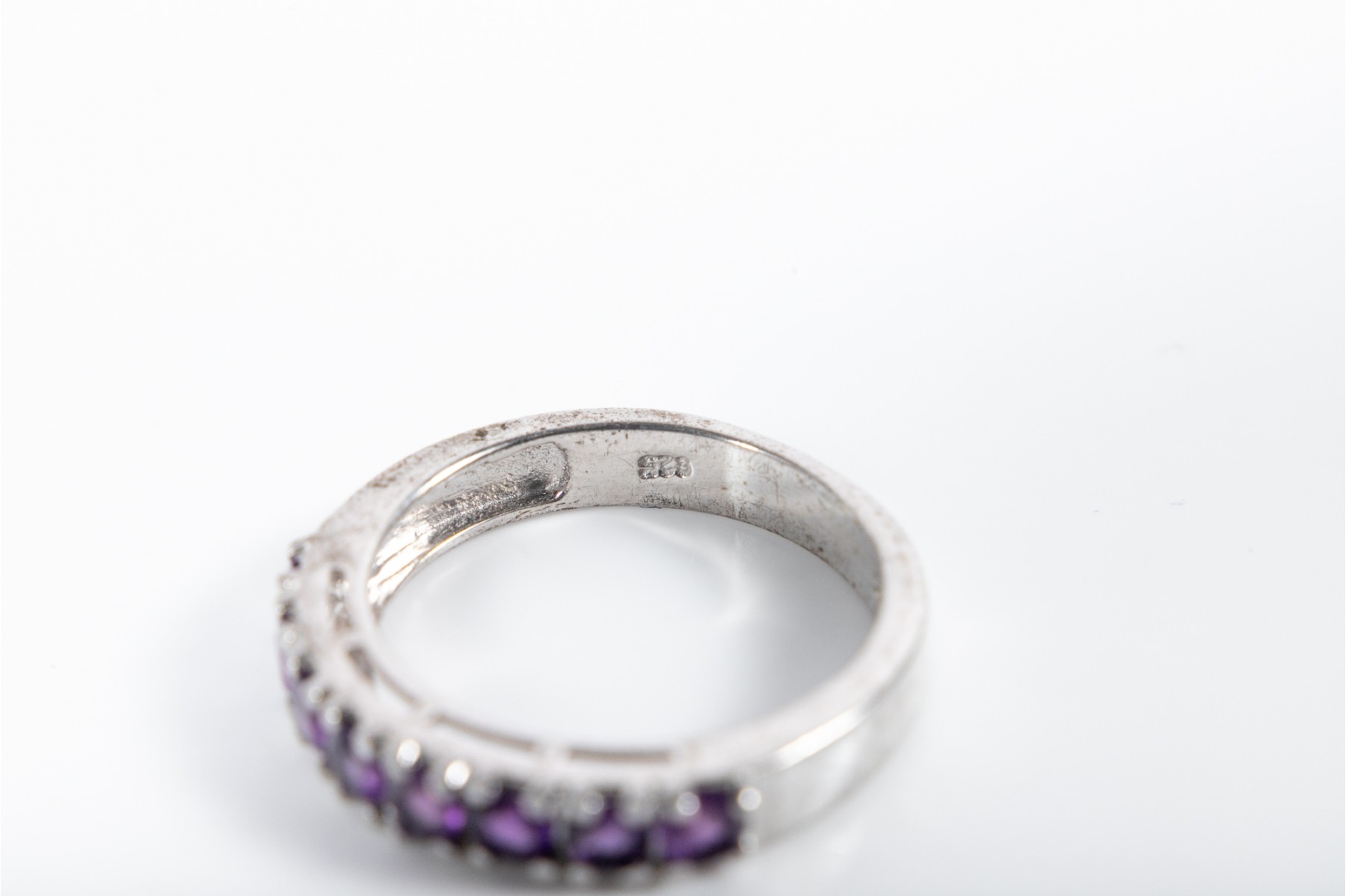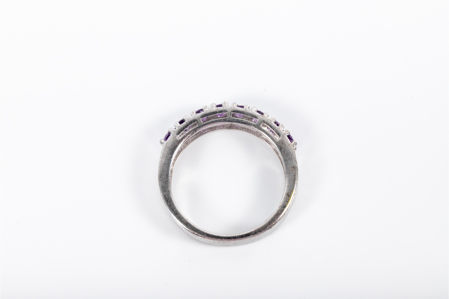 A simple and pretty sterling silver ring displaying round, vibrant purple amethysts.