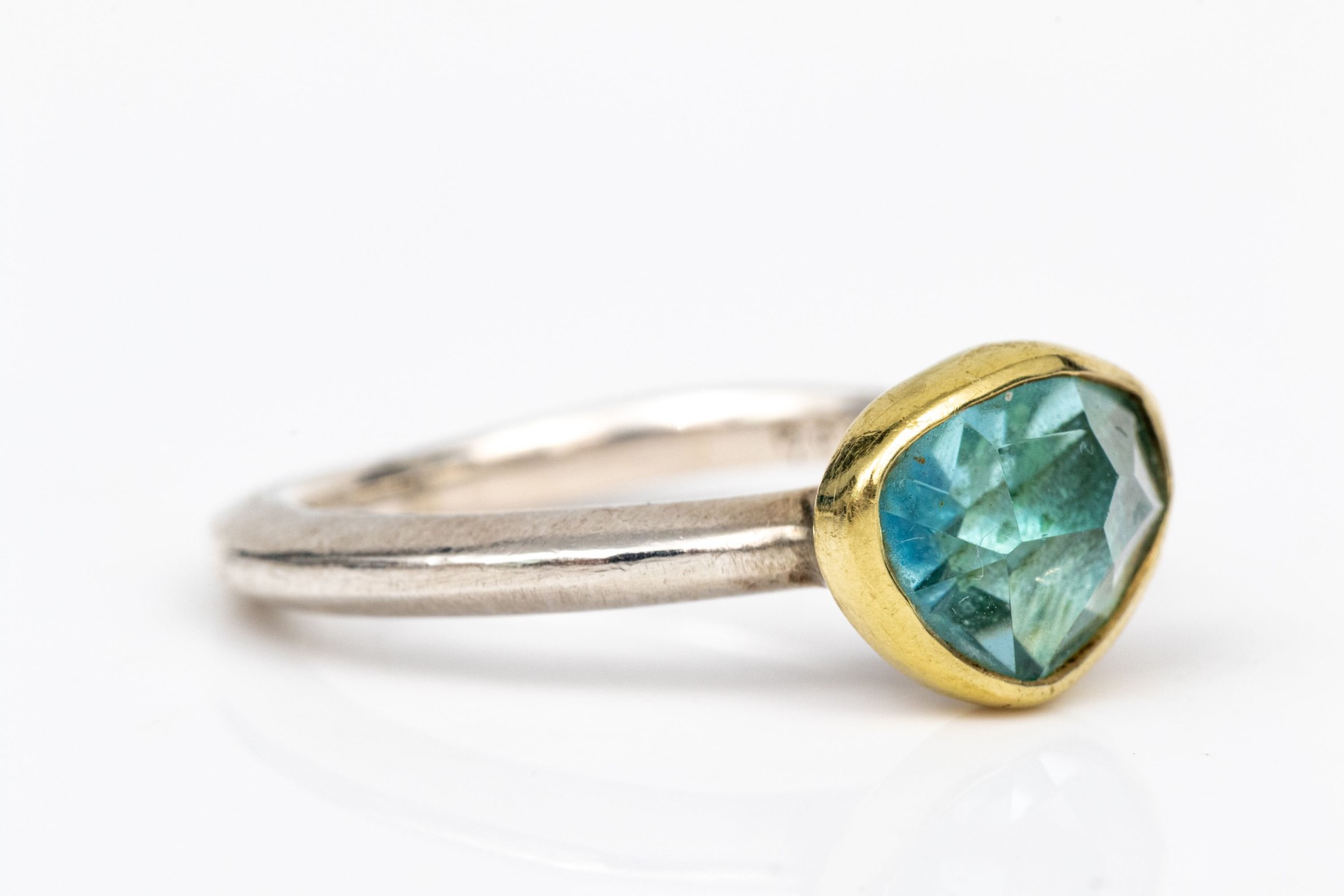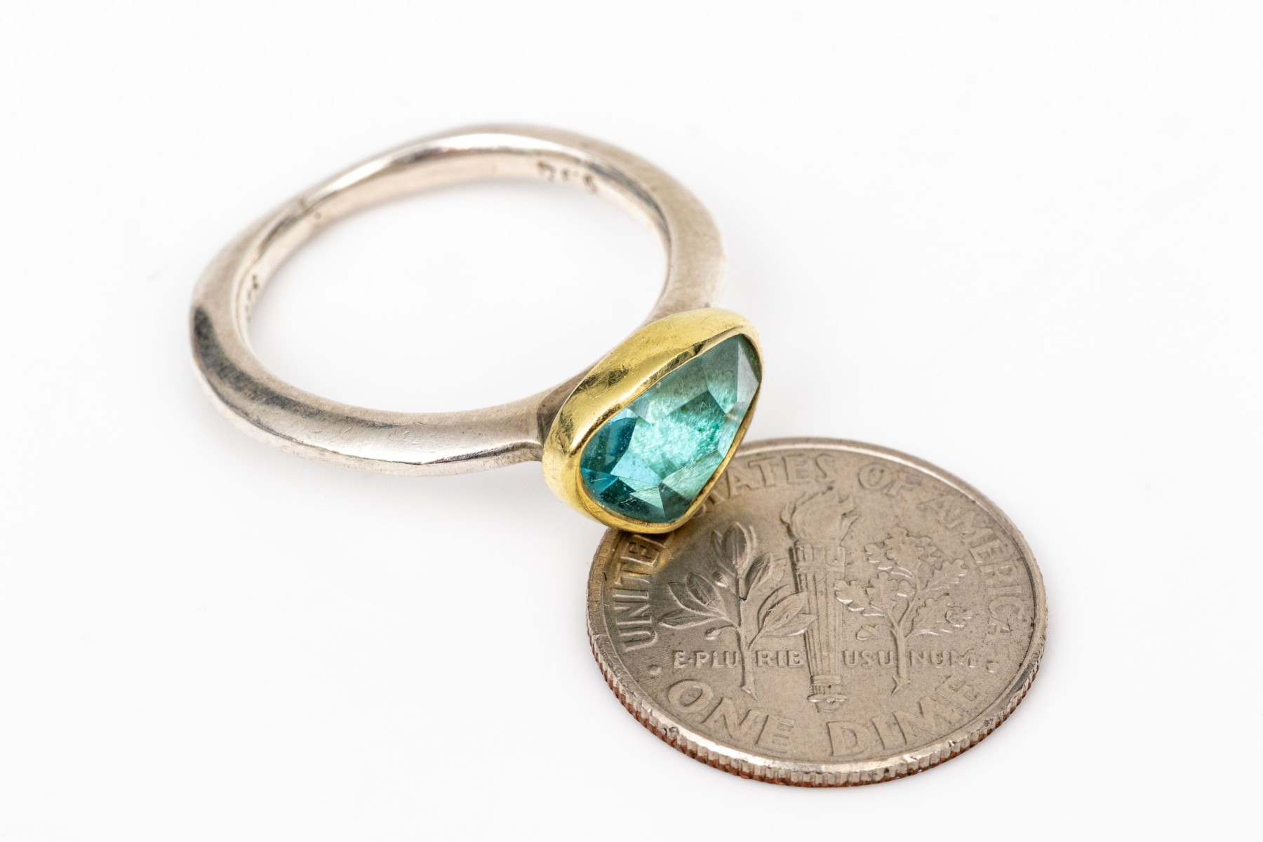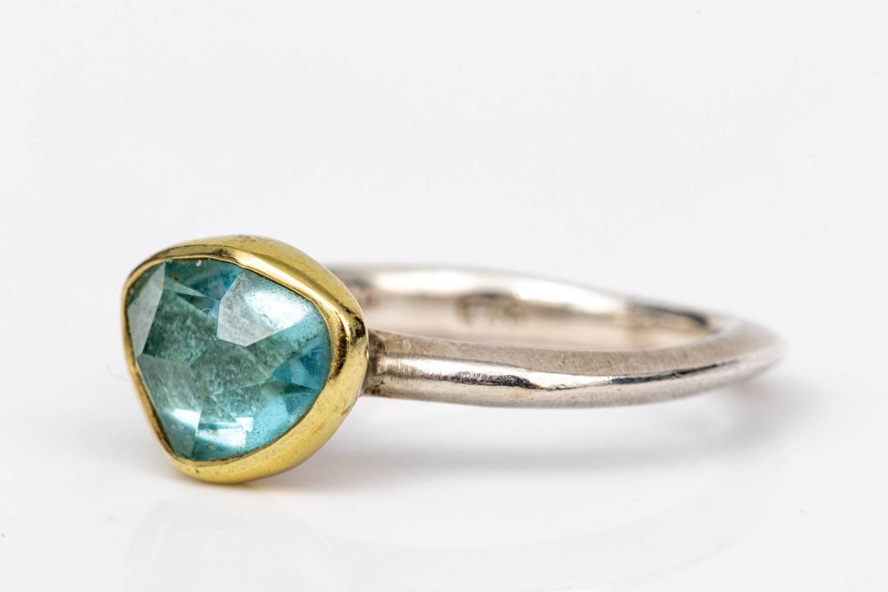 Sterling silver and 18k striking bezel set blue topaz ring, size 6.25-