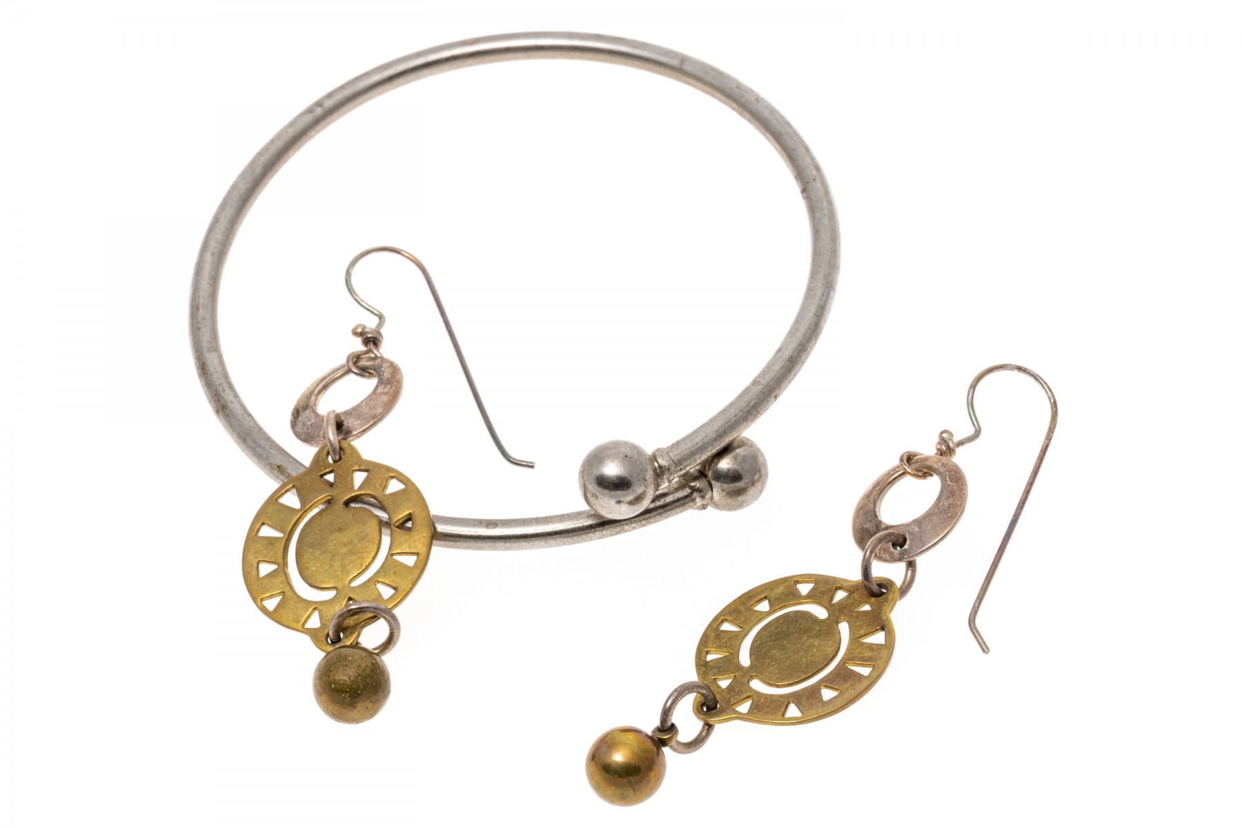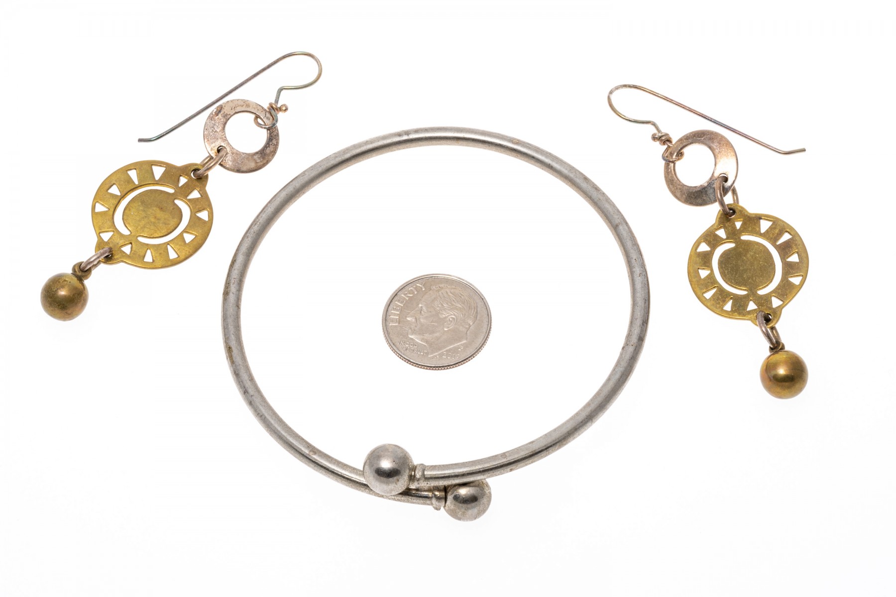 Earrings and bracelet set. This unique set features a sterling silver and brass contemporary set of long drop stacked circle earrings, with a shepherds hooks, paired with a silver colored metal cross over bracelet.
