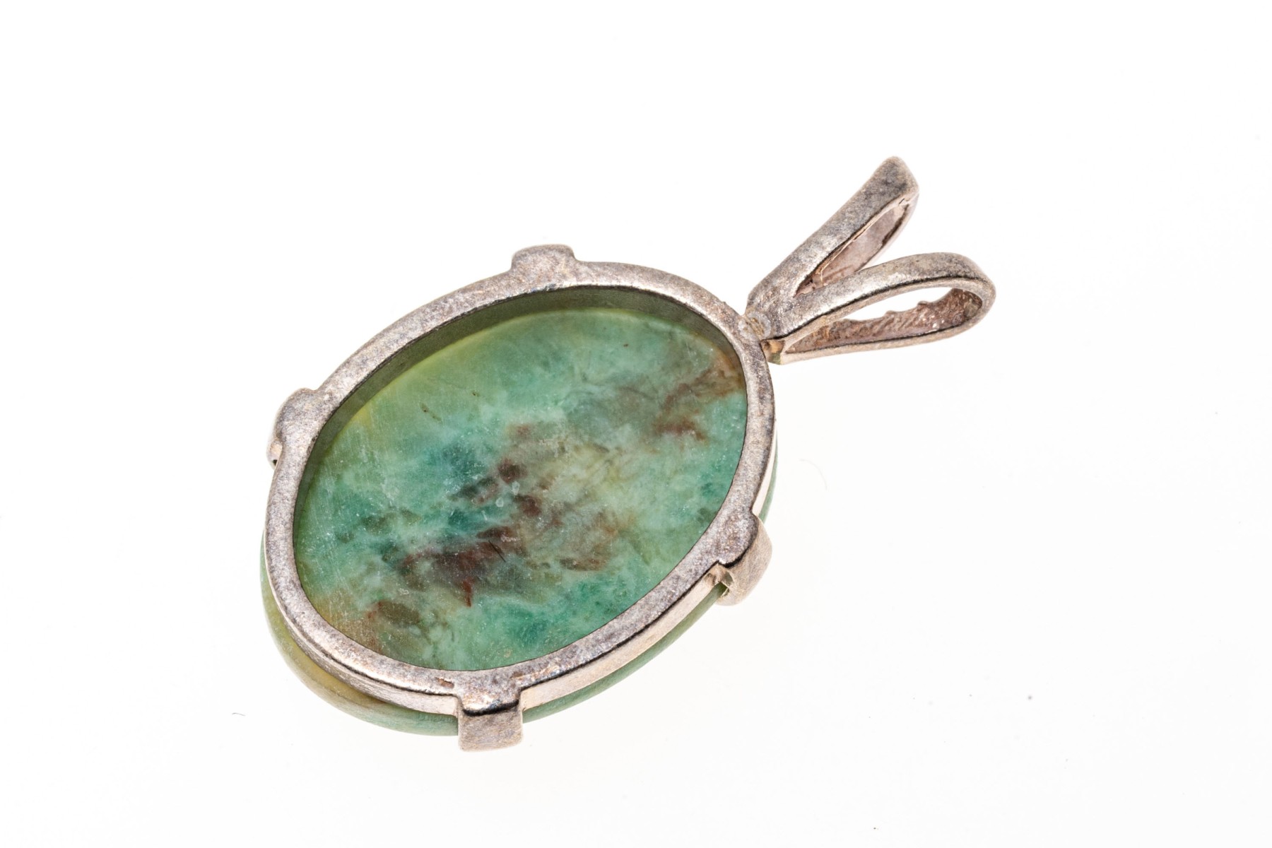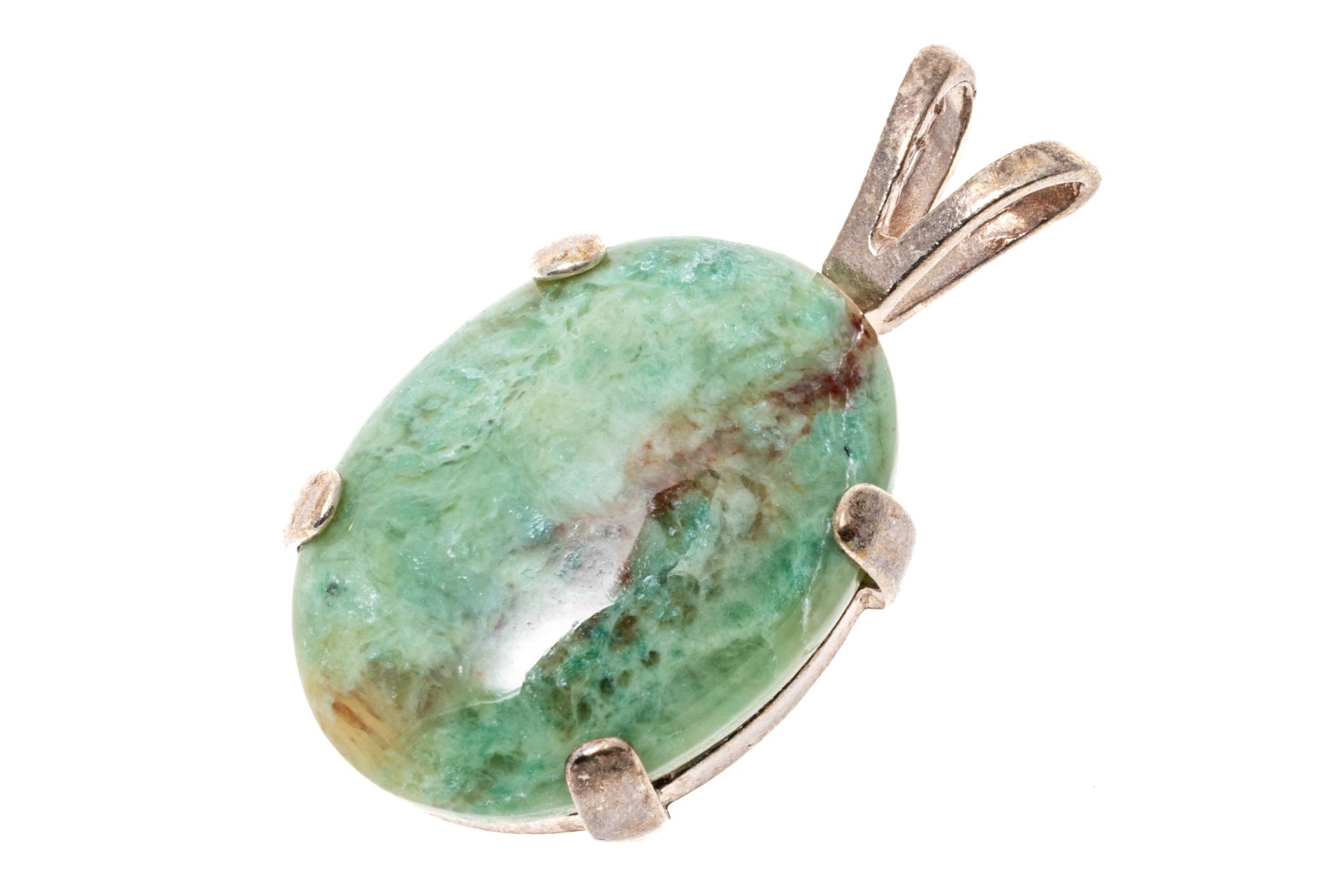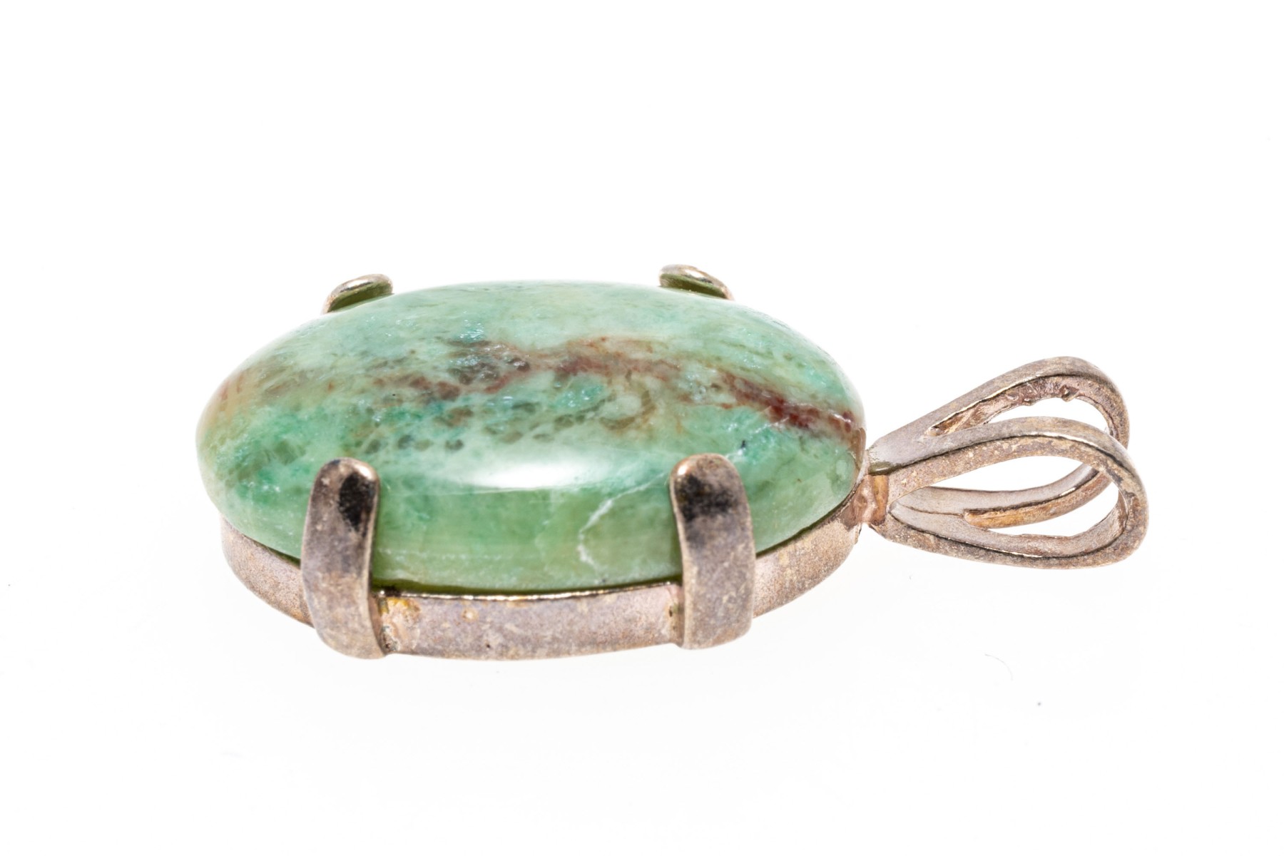 A sterling silver pendant. Set into this pendant is an oval cabochon cut is a red and green, oval cabochon cut dragon blood stone, 17.5mm x 13.0mm. Dragon blood stones have been used to increase focus and creativity.