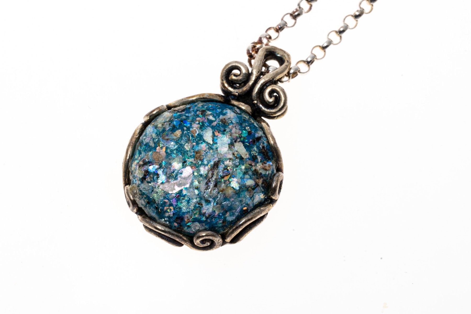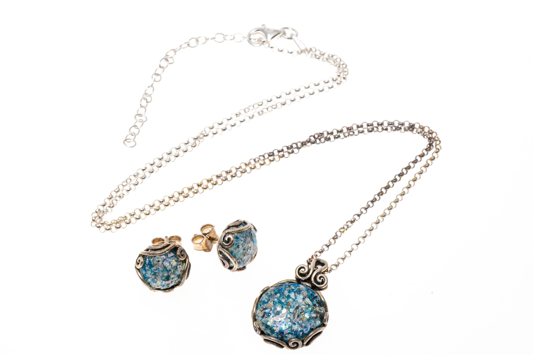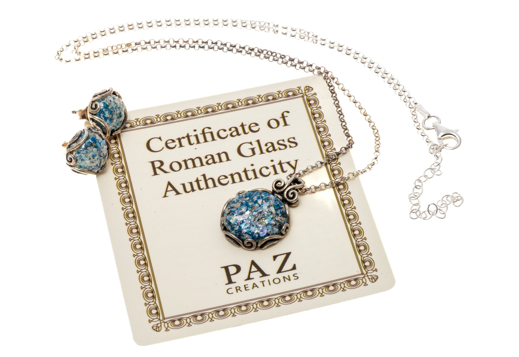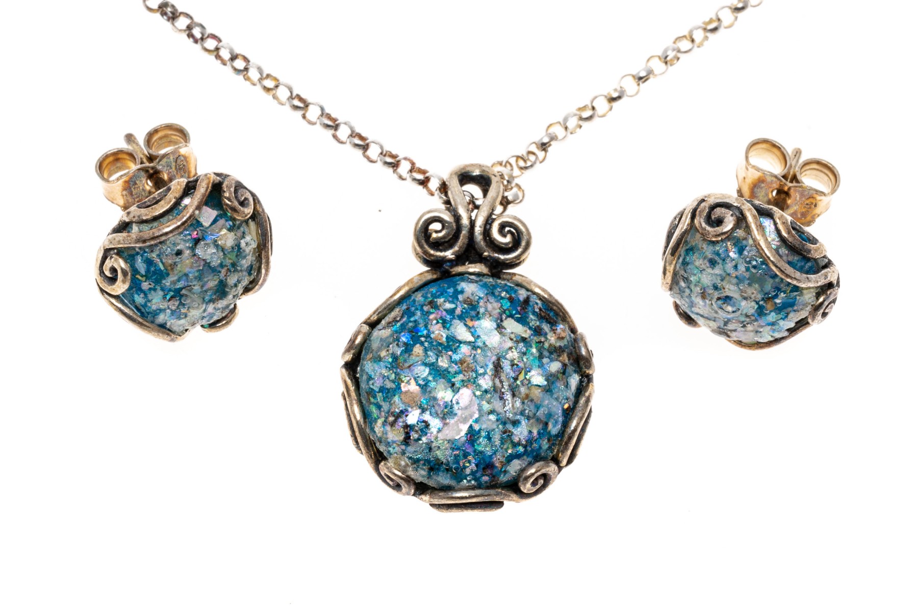 A beautiful vintage set of sterling silver jewelry including a necklace and a pair of earrings, sporting stunning blue glass cabochons with excellent texture and visual interest within scrolled openwork settings. Includes a certificate of authenticity from PAZ Creations.