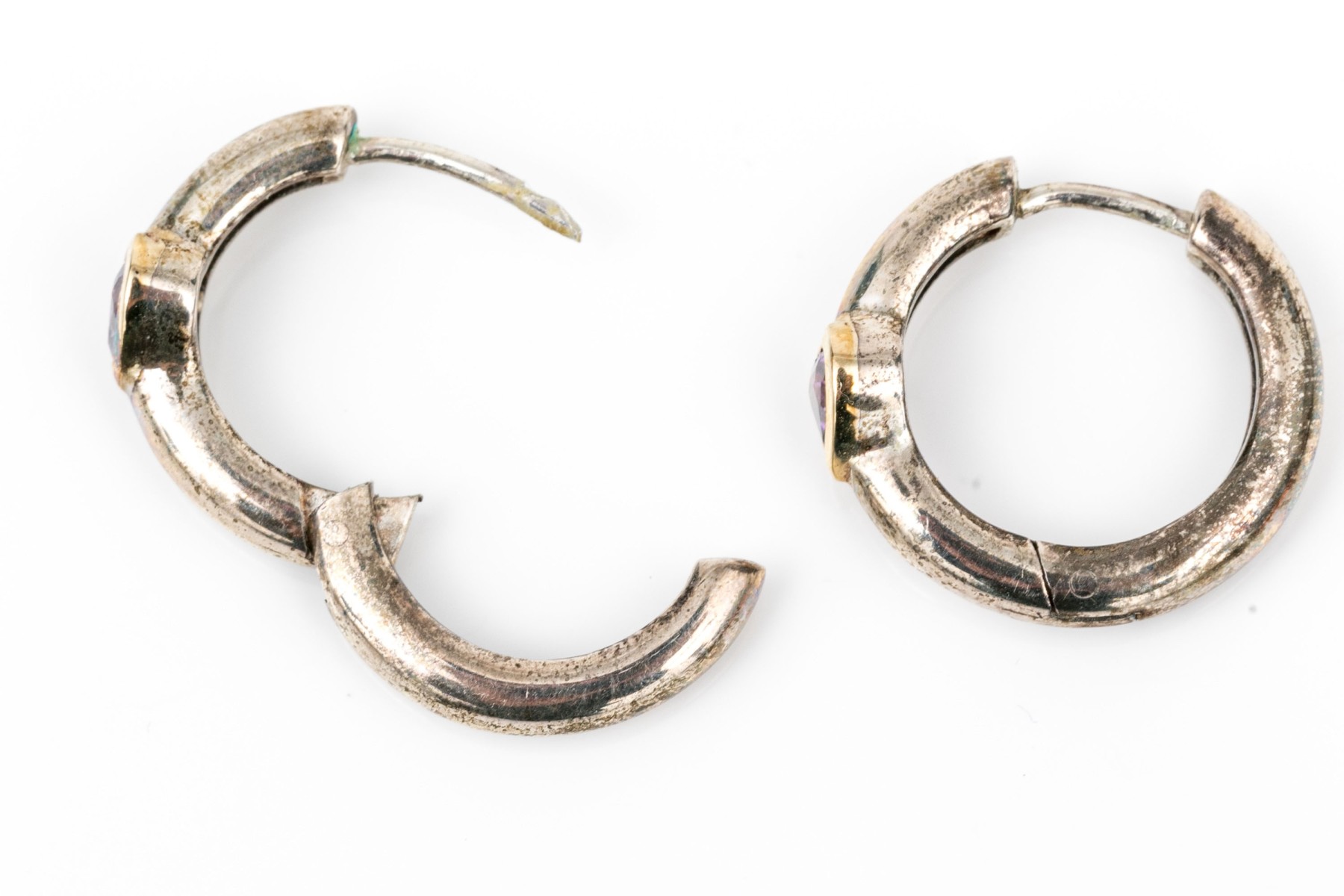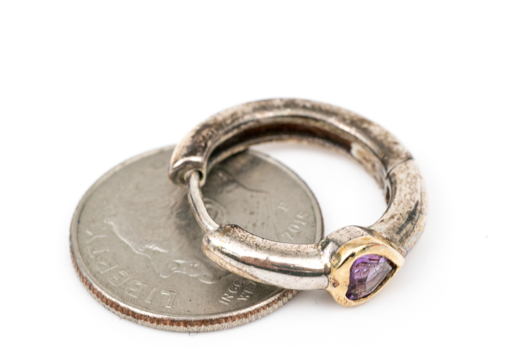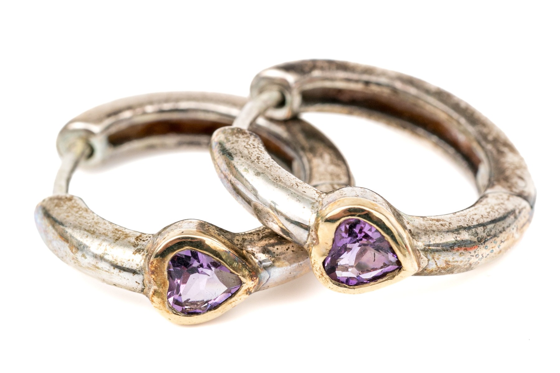 Sterling silver and vermeil amethyst heart set hoop earrings. The earrings are finished by posts and hinged style backs