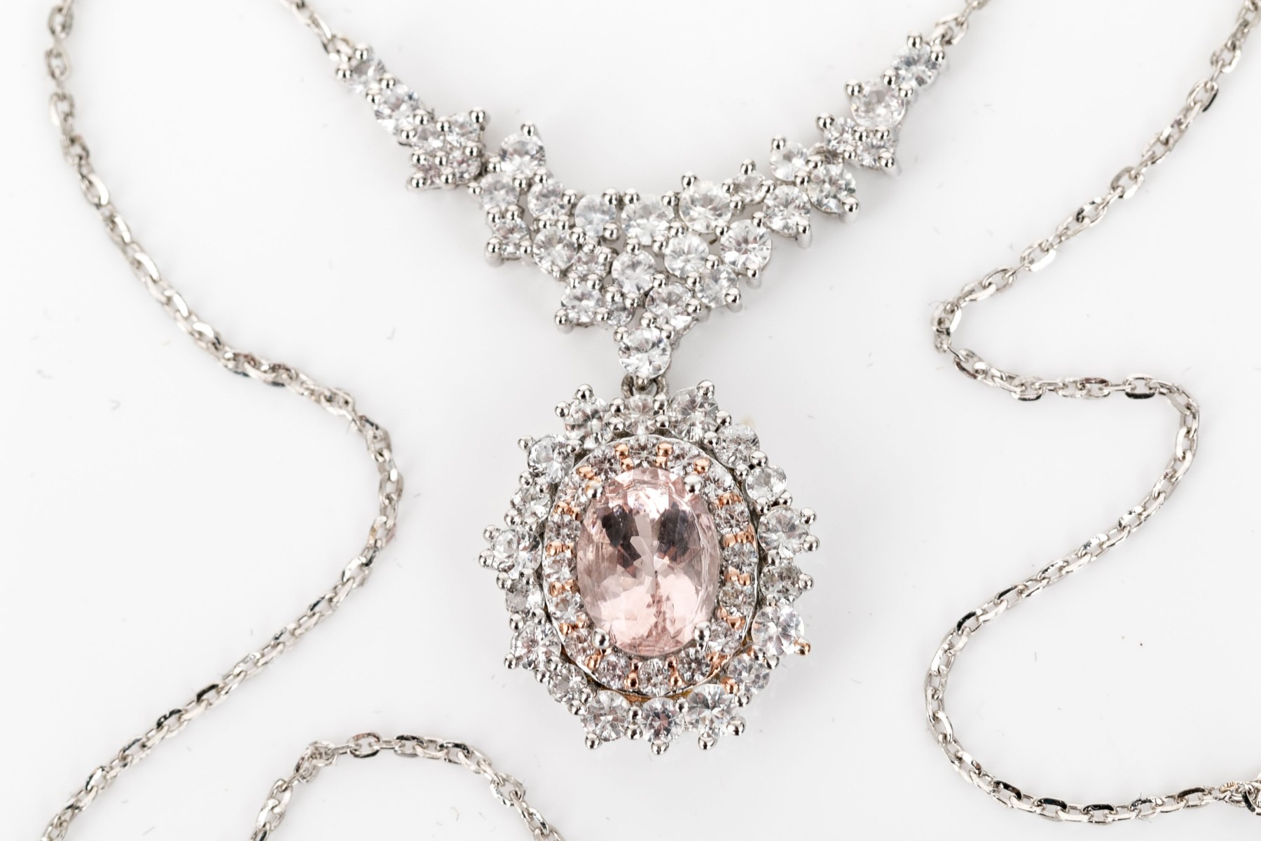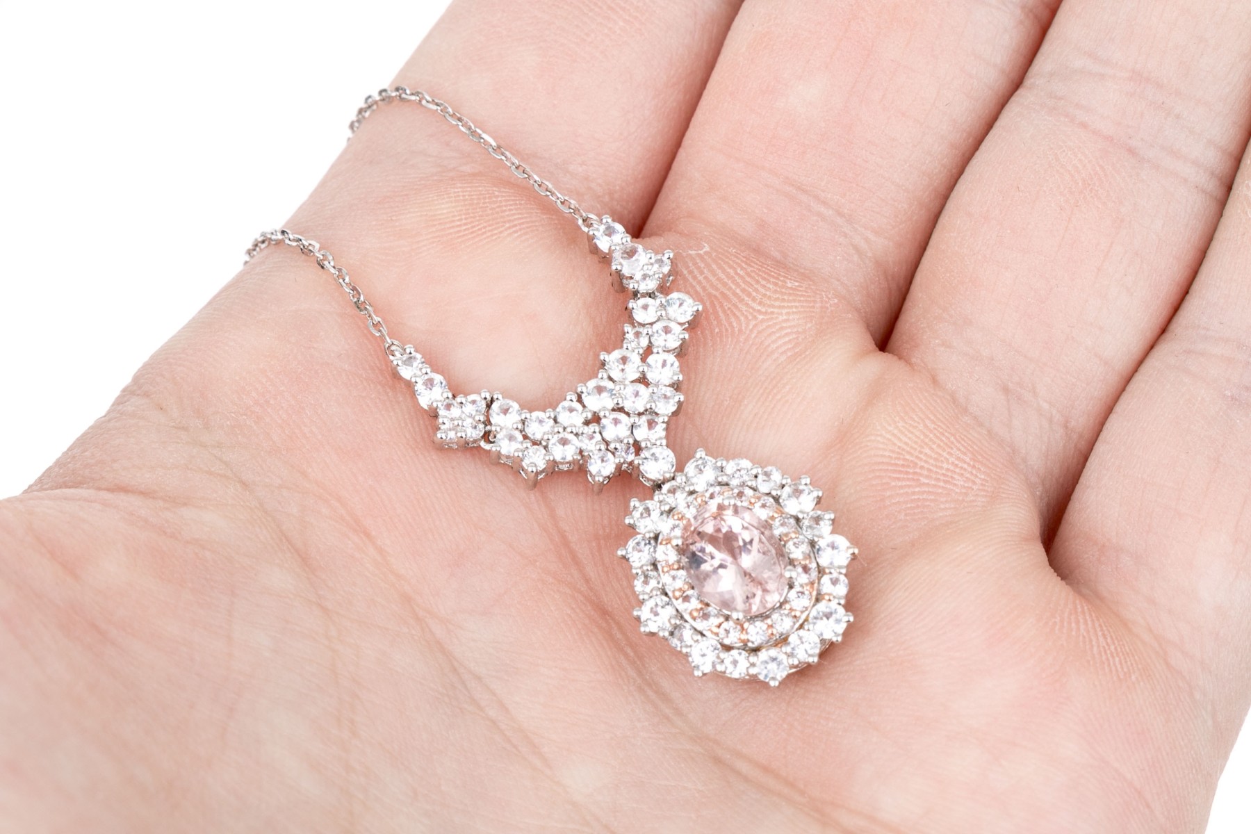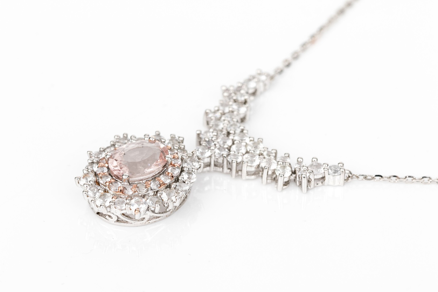 Sterling silver and vermeil pretty pink morganite and white topaz halo cluster necklace, finished with a cable chain and lobster claw style clasp
