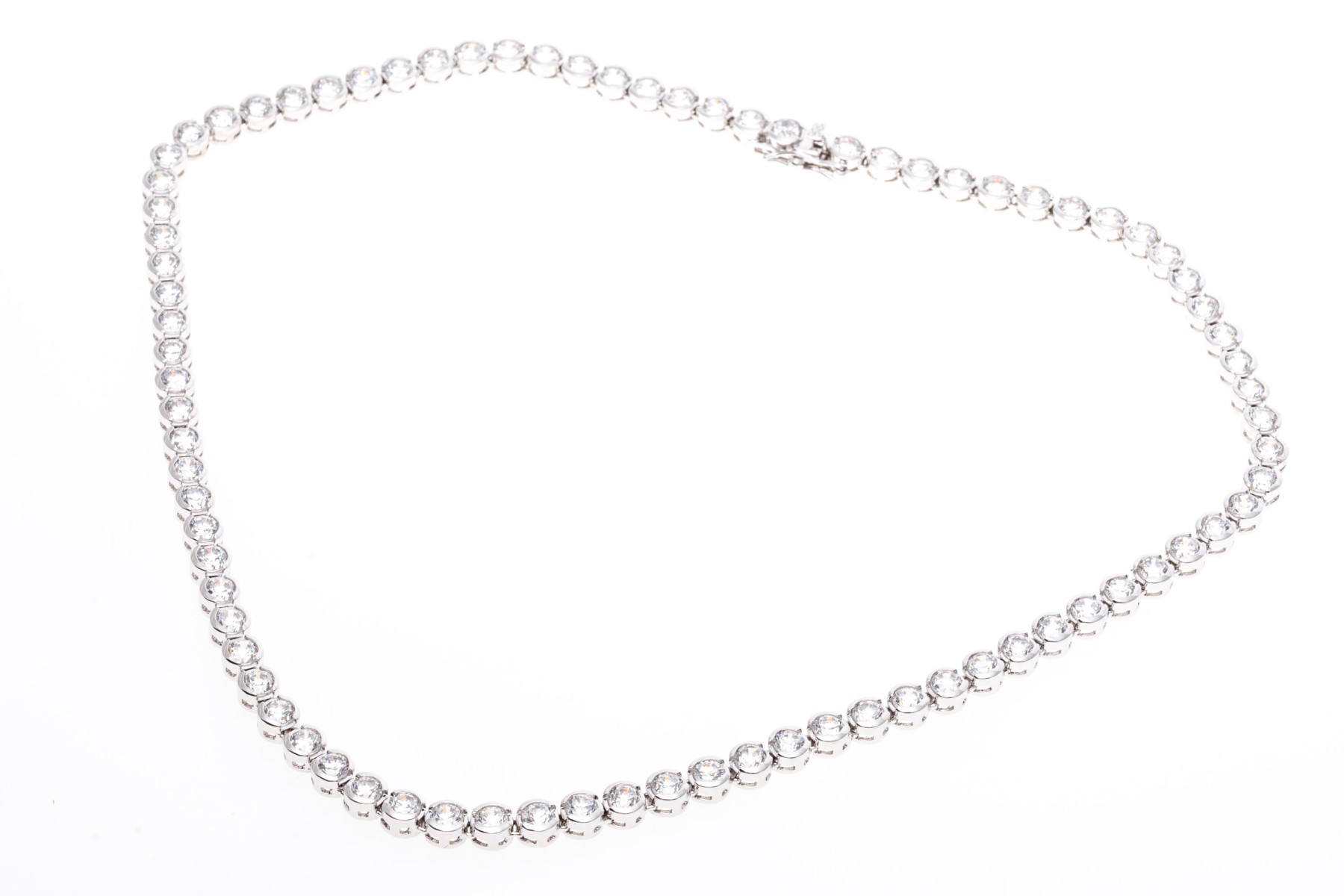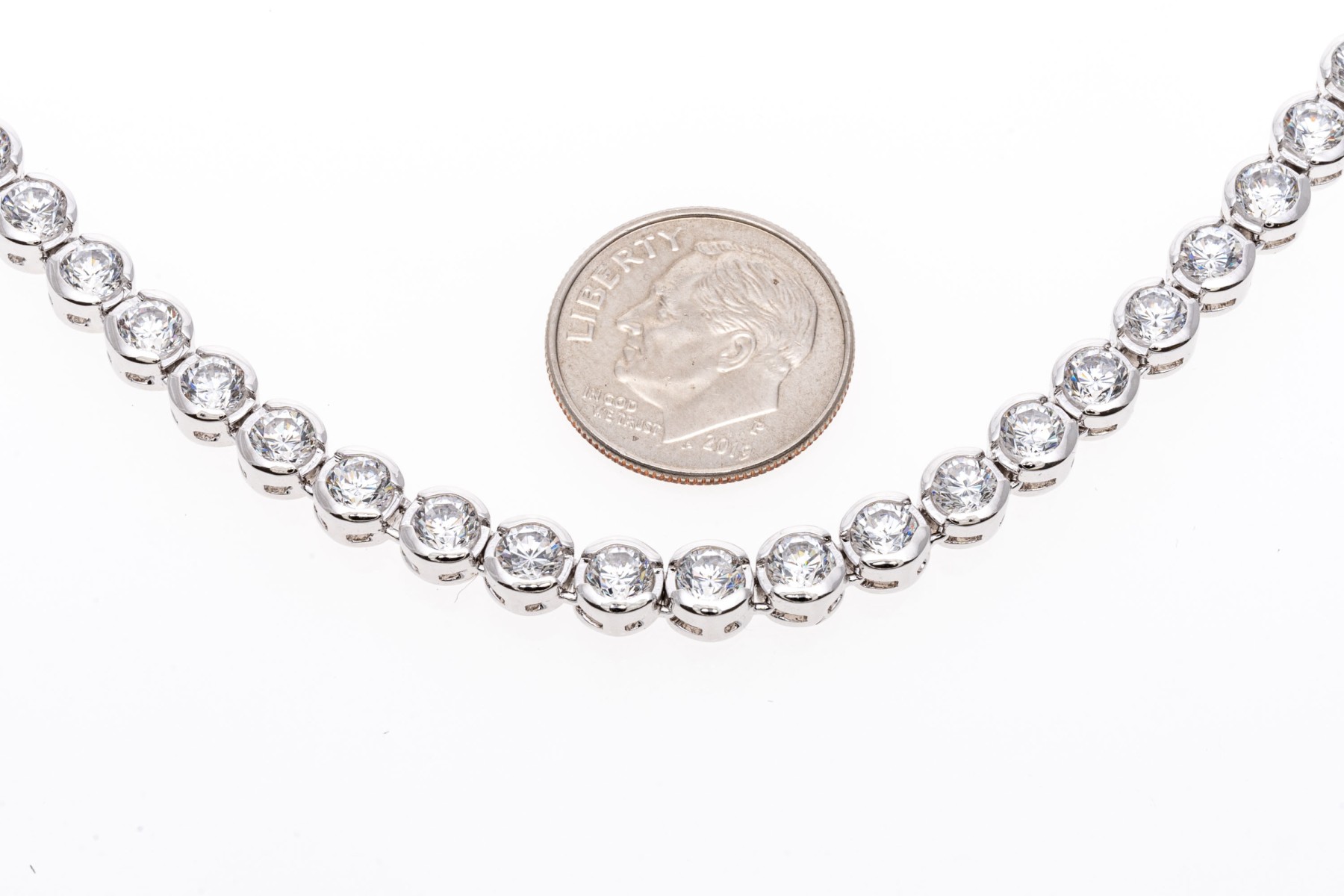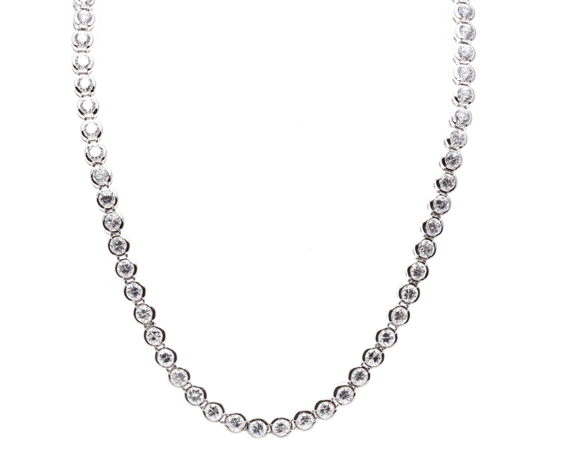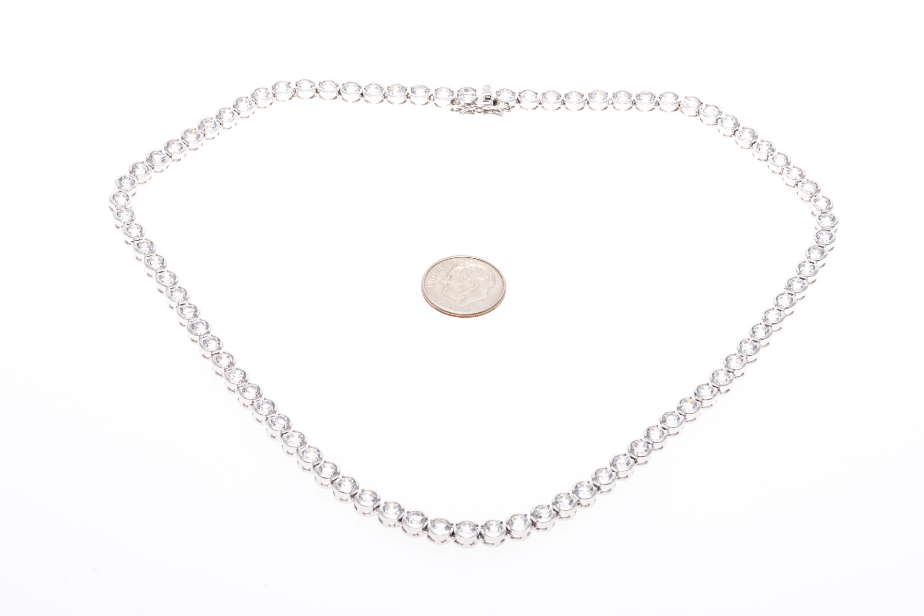This brilliant necklace is constructed of sterling silver and presents a trail of round cut and bezel set white cubic zirconia. The hidden box style clasp has a single safety latch for added security.