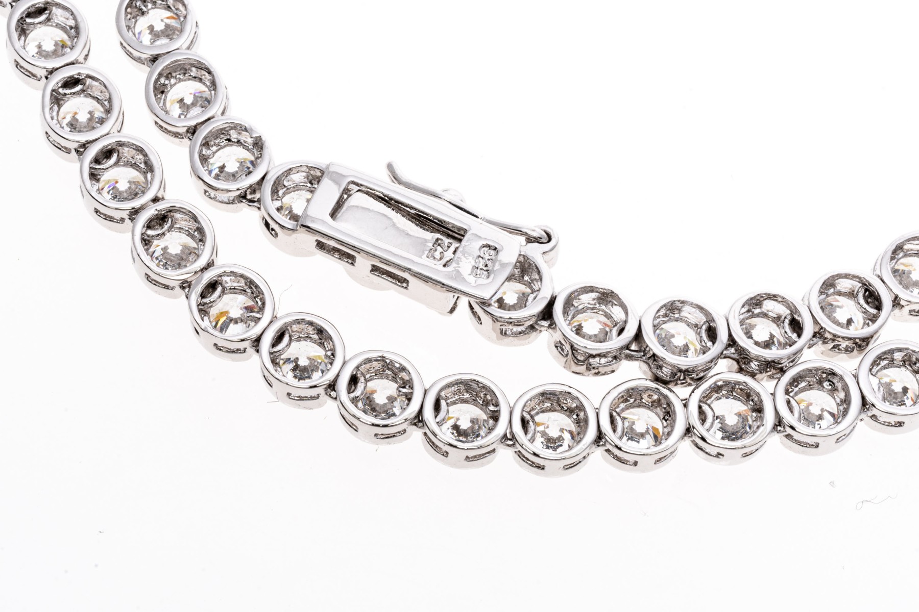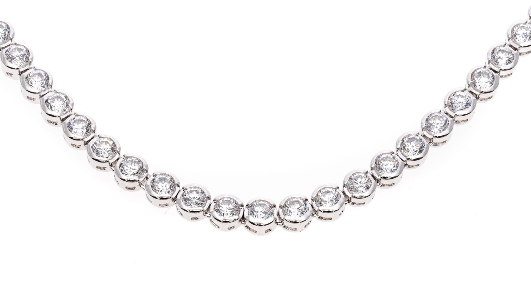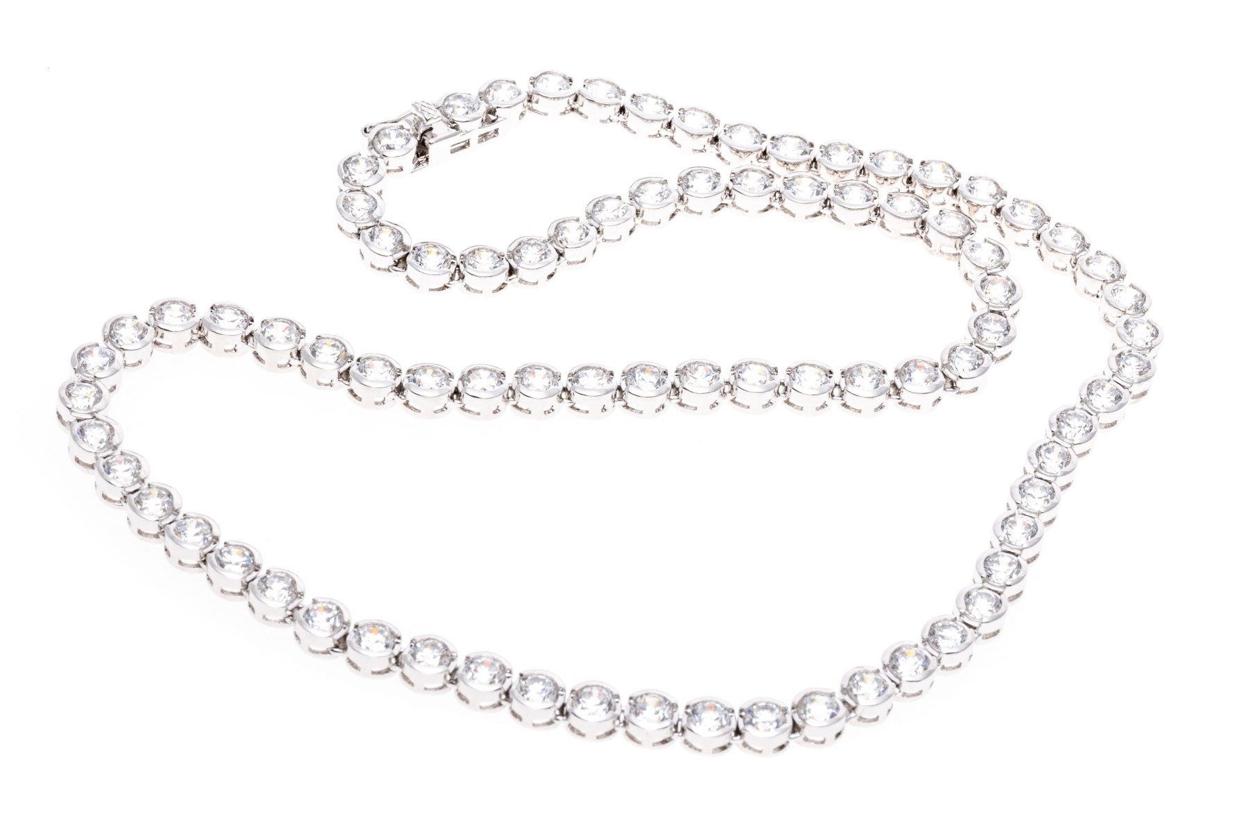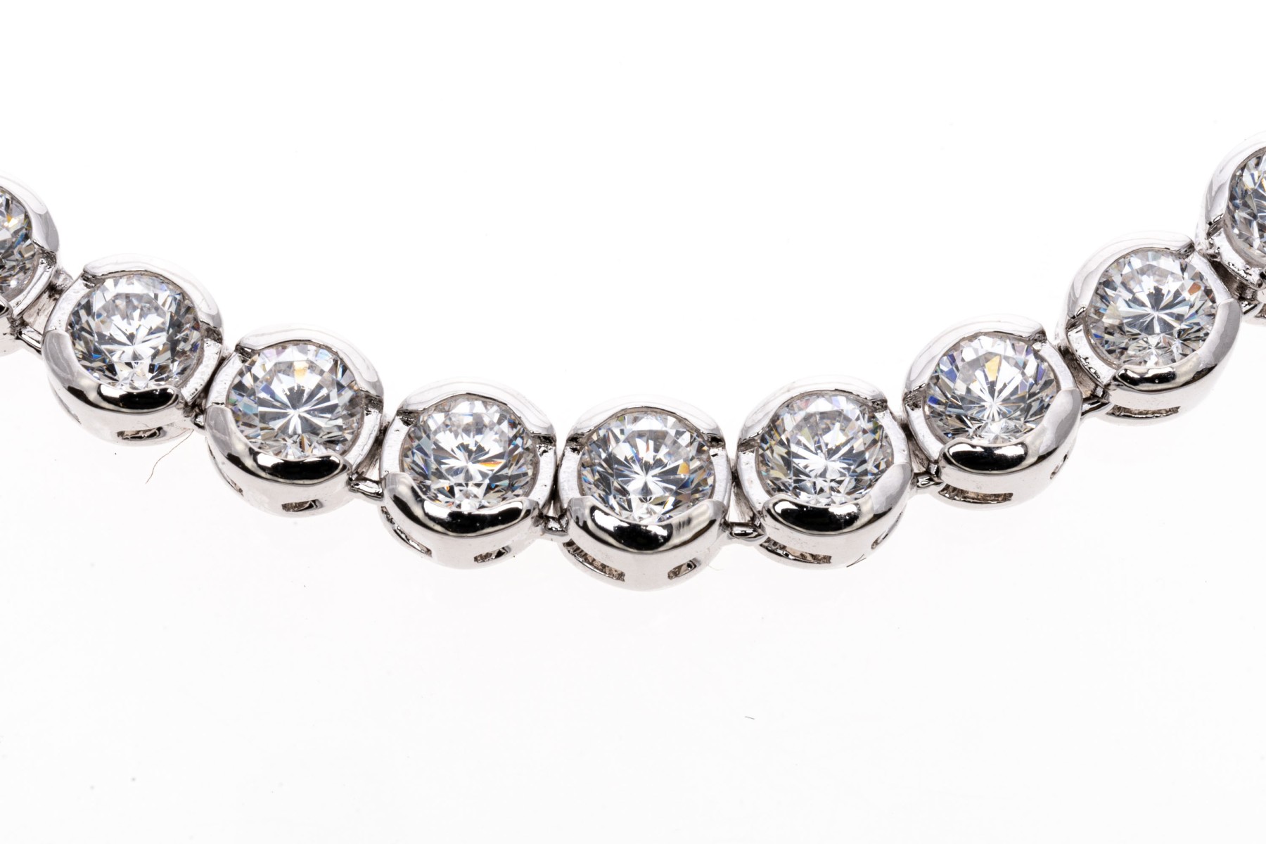 This brilliant necklace is constructed of sterling silver and presents a trail of round cut and bezel set white cubic zirconia. The hidden box style clasp has a single safety latch for added security.