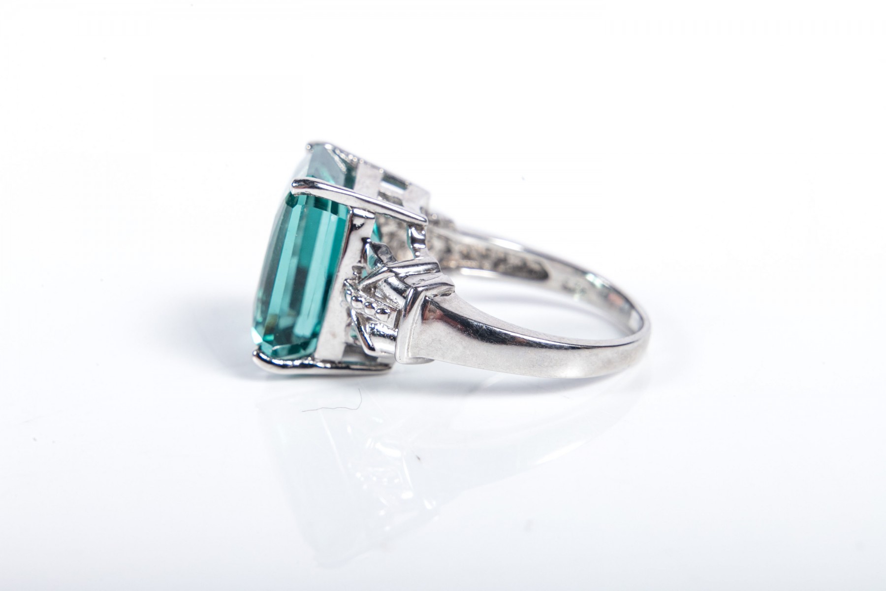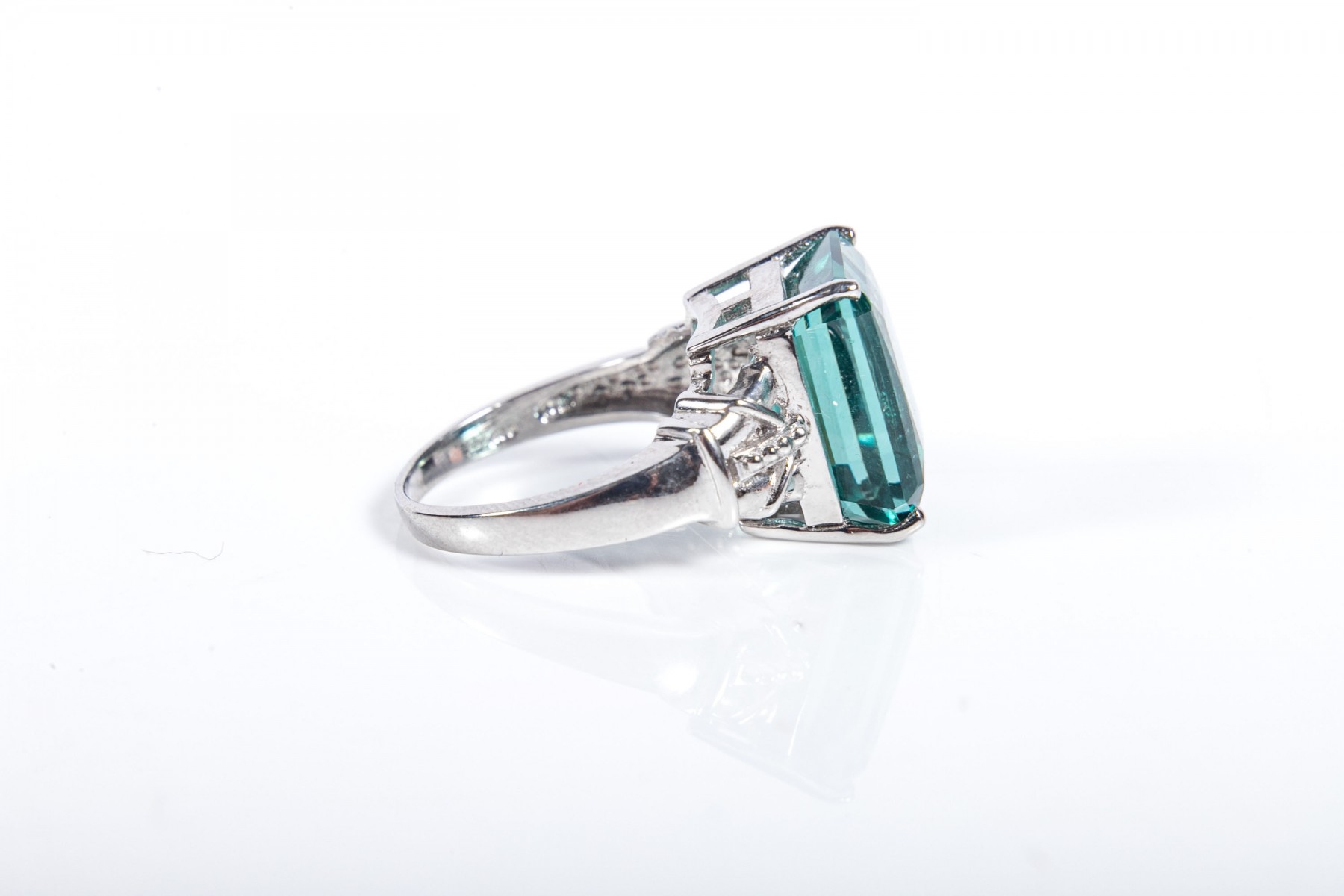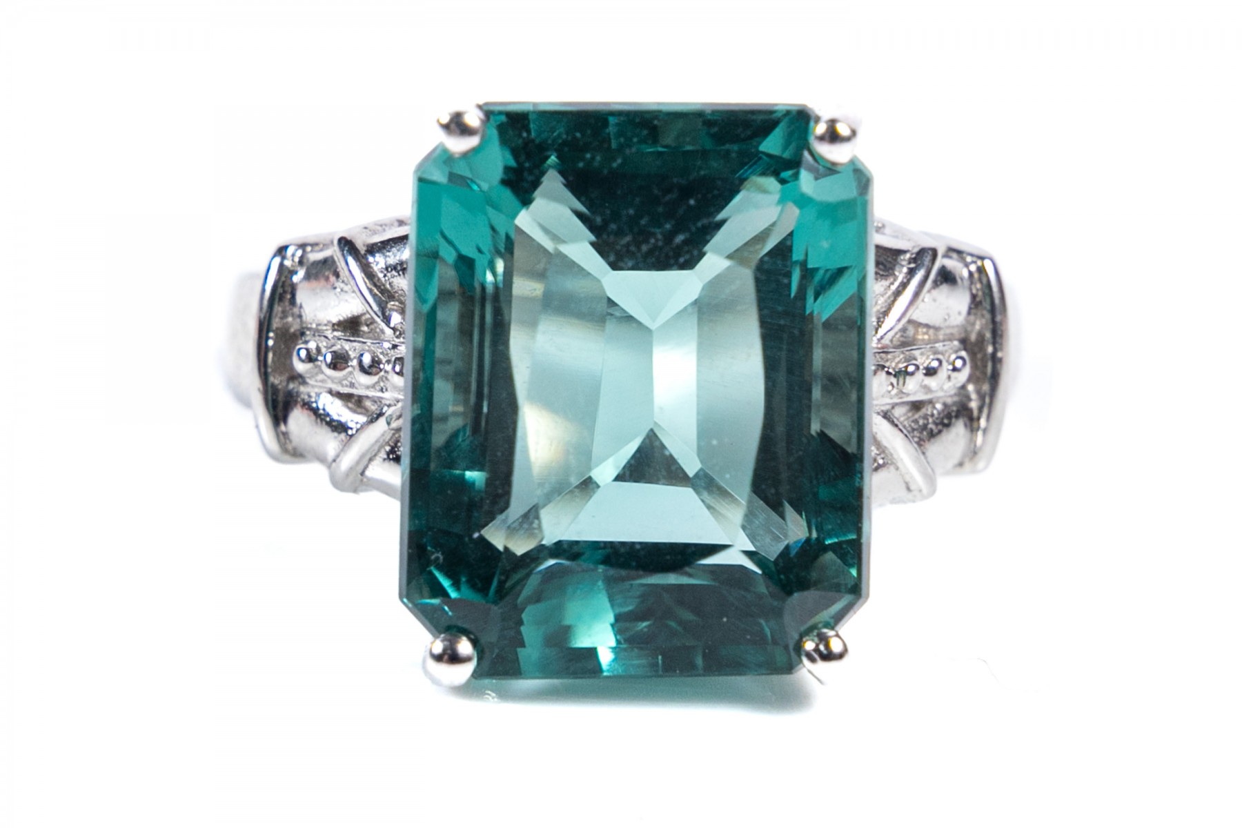 A beautiful sterling silver ring displaying a rectangular teal aquamarine on elegantly detailed, high shoulders with stippled and ribbed relief.