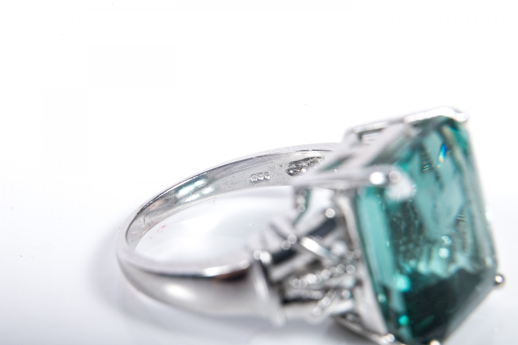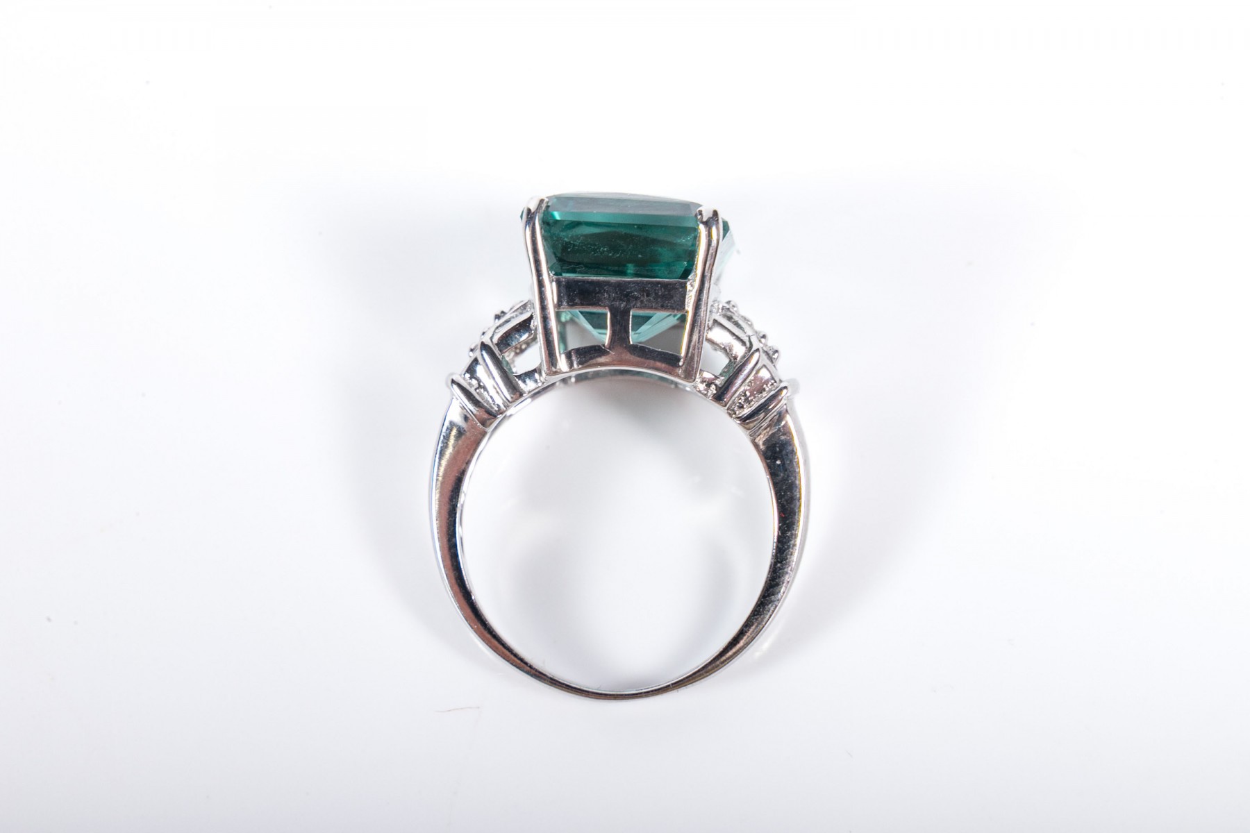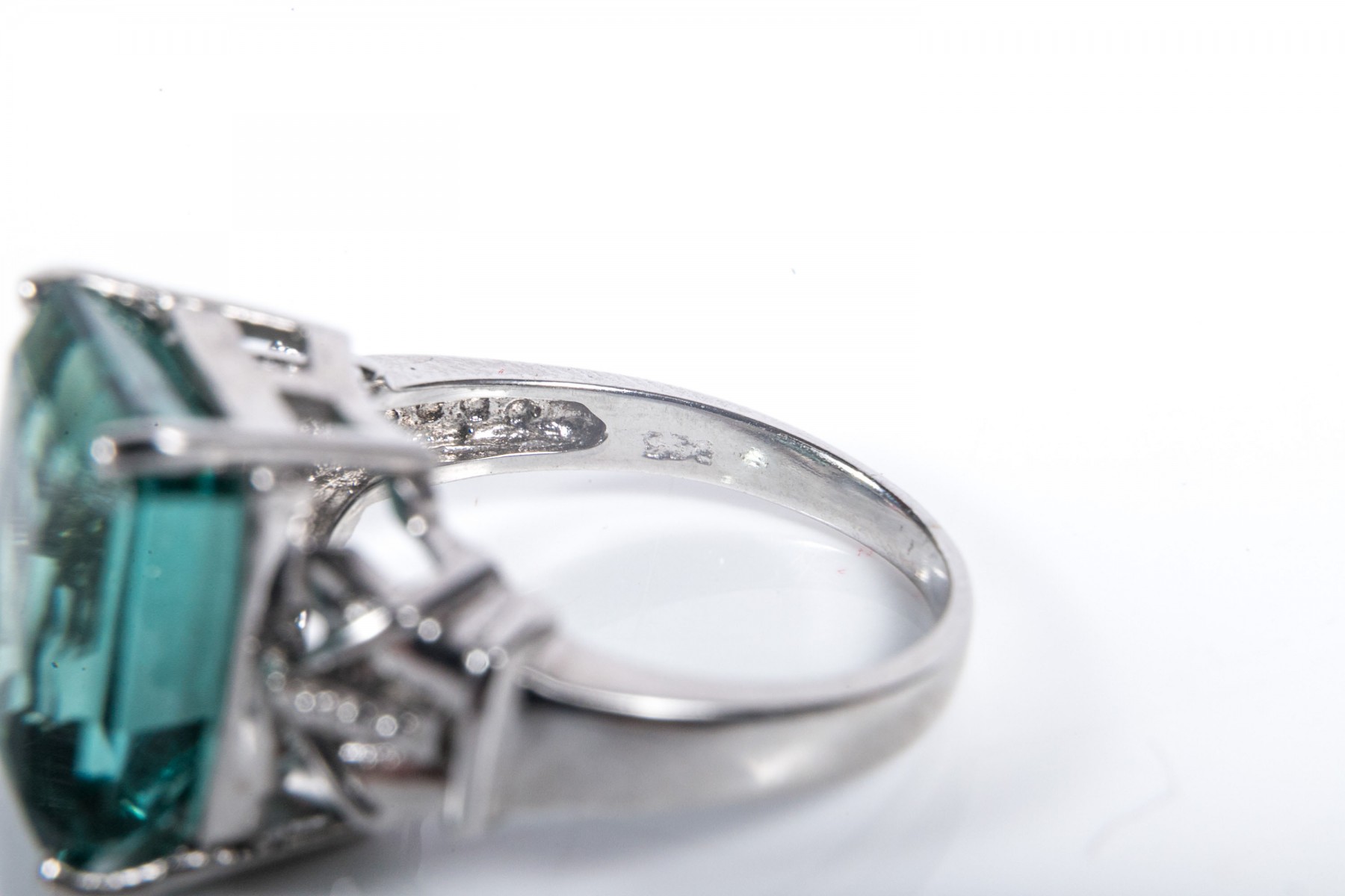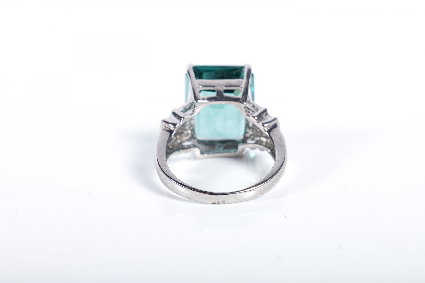 A beautiful sterling silver ring displaying a rectangular teal aquamarine on elegantly detailed, high shoulders with stippled and ribbed relief.