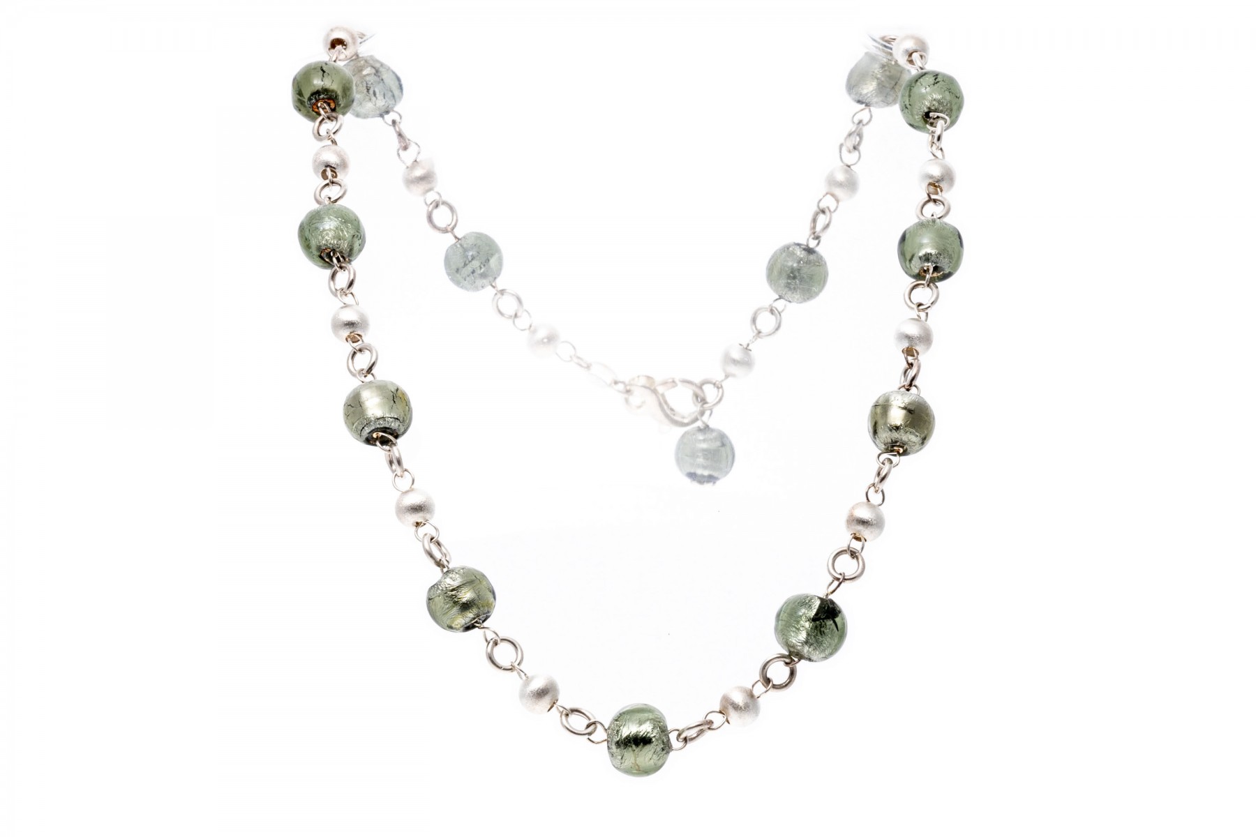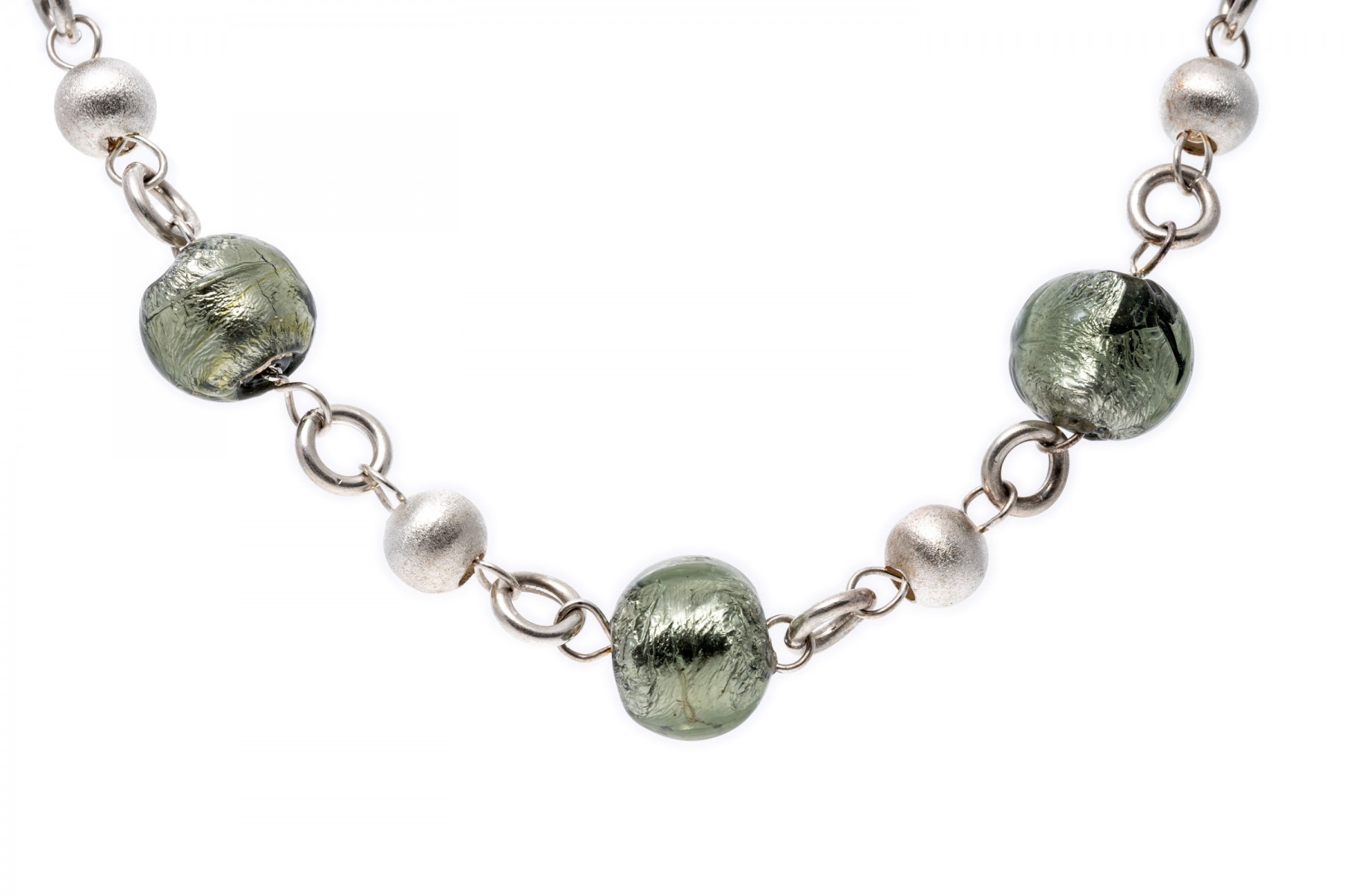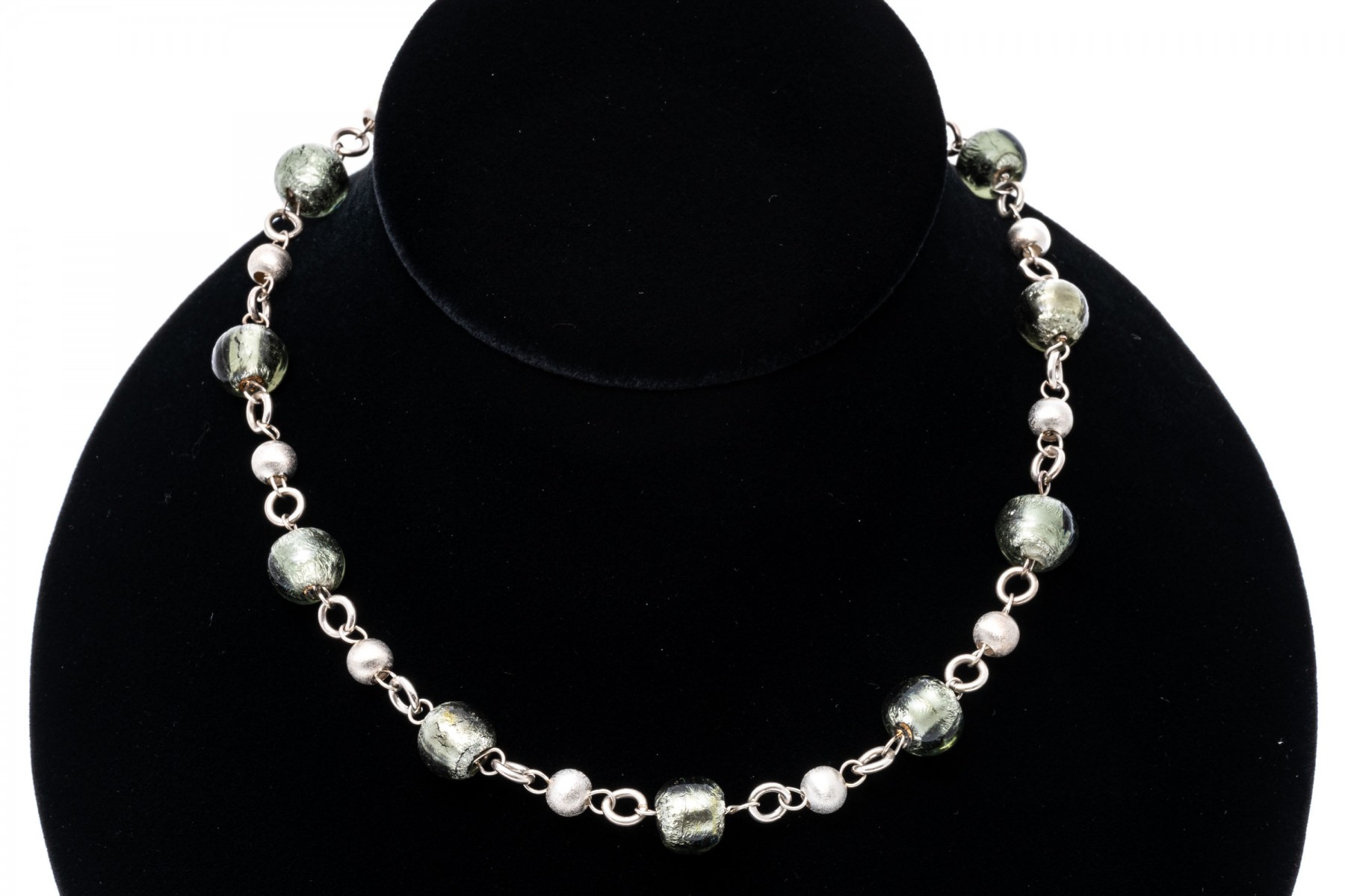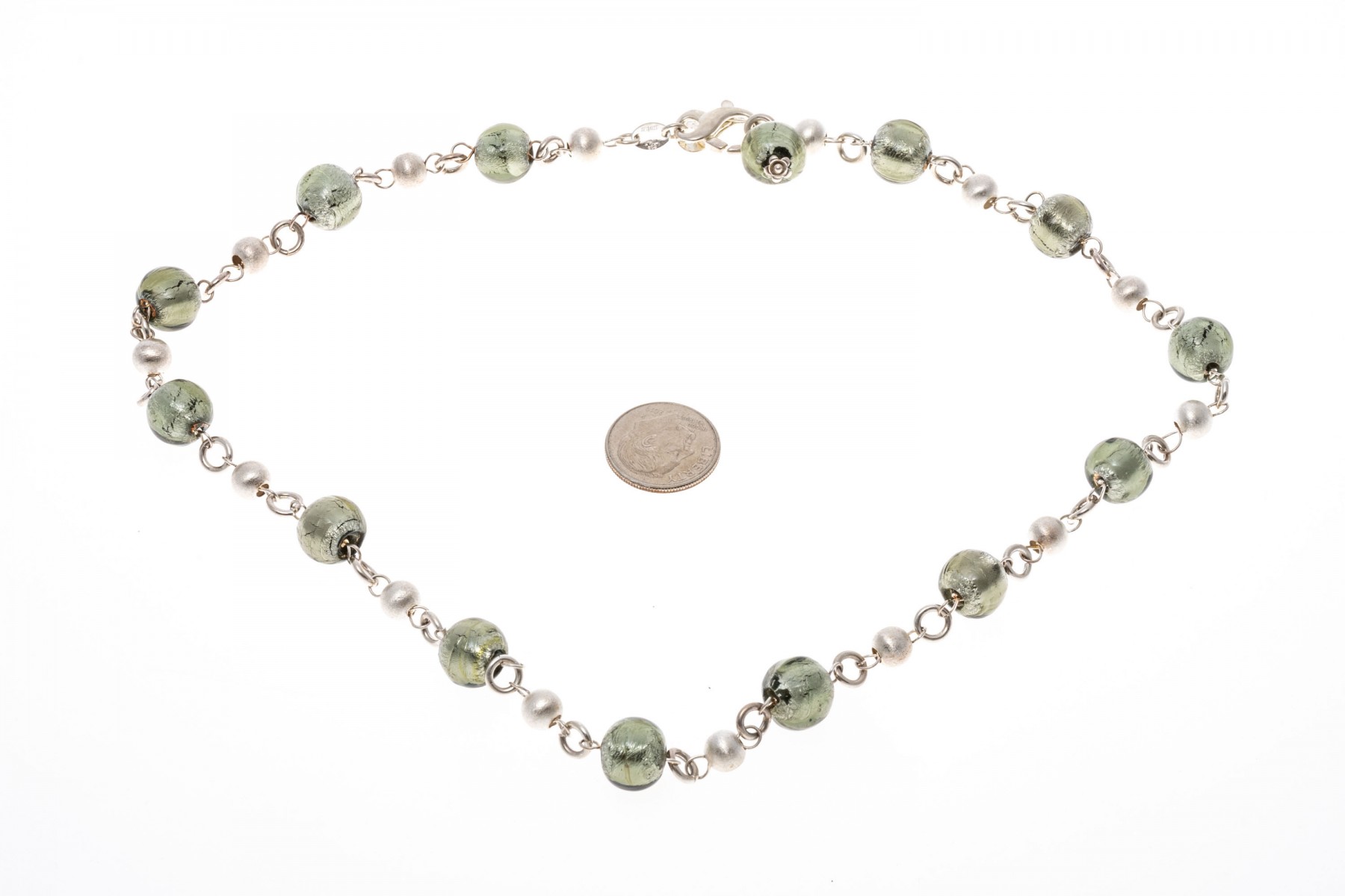 Sterling silver necklace. This beautiful necklace is a tin cup style, decorated with 11 mm iridescent silver green glass beads, alternating with 6 mm brushed silver beads and round open links. The necklace is finished by a lobster claw clasp.