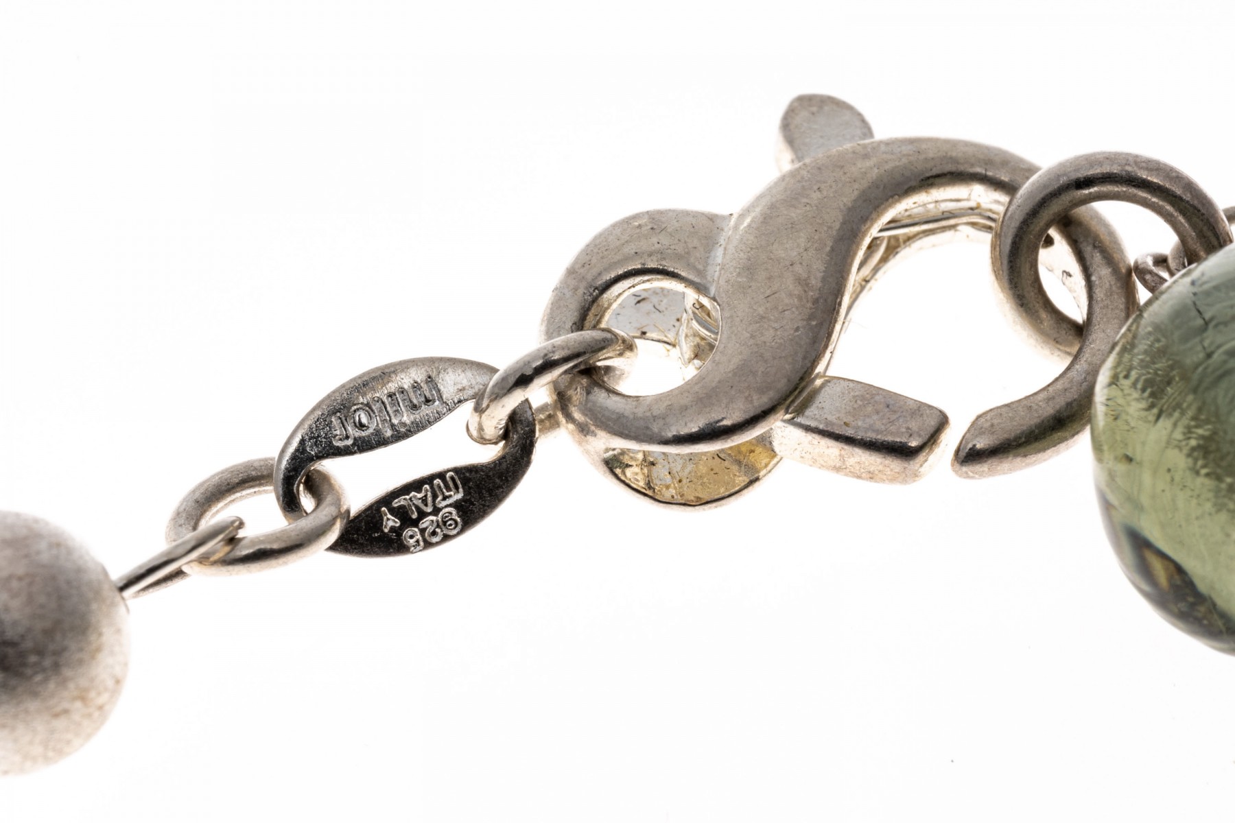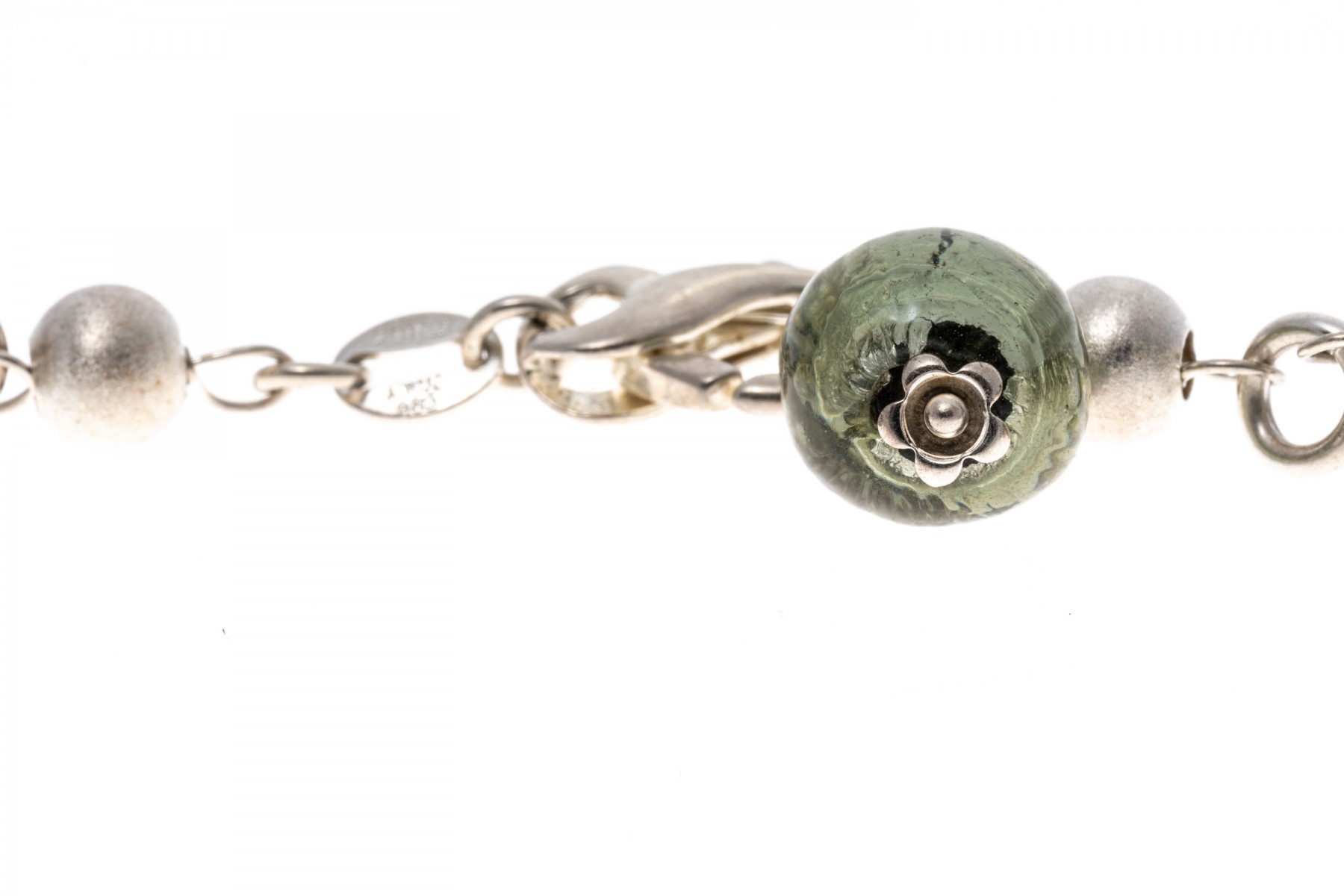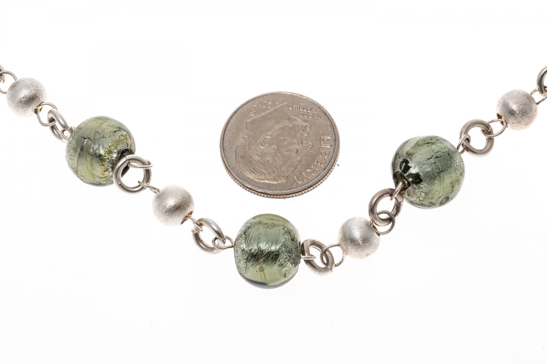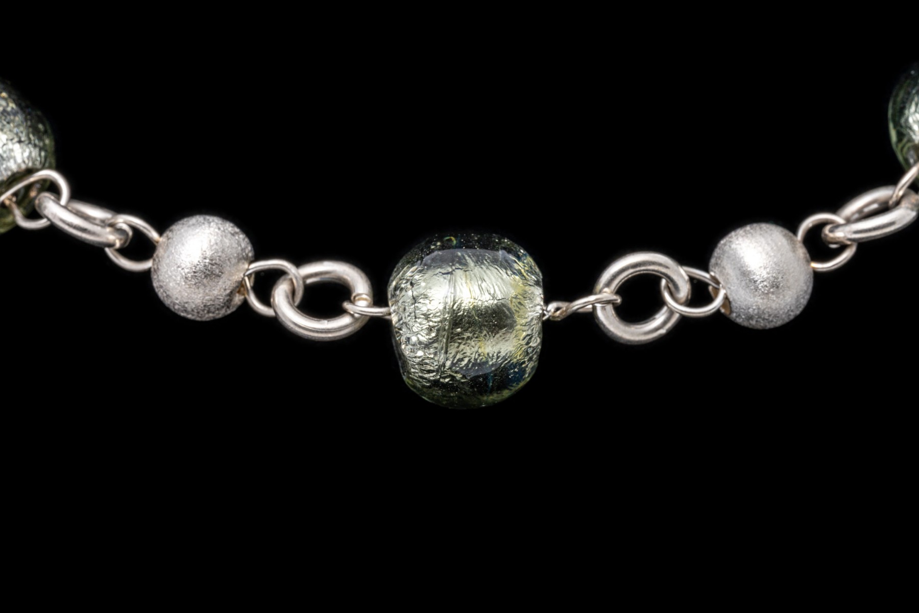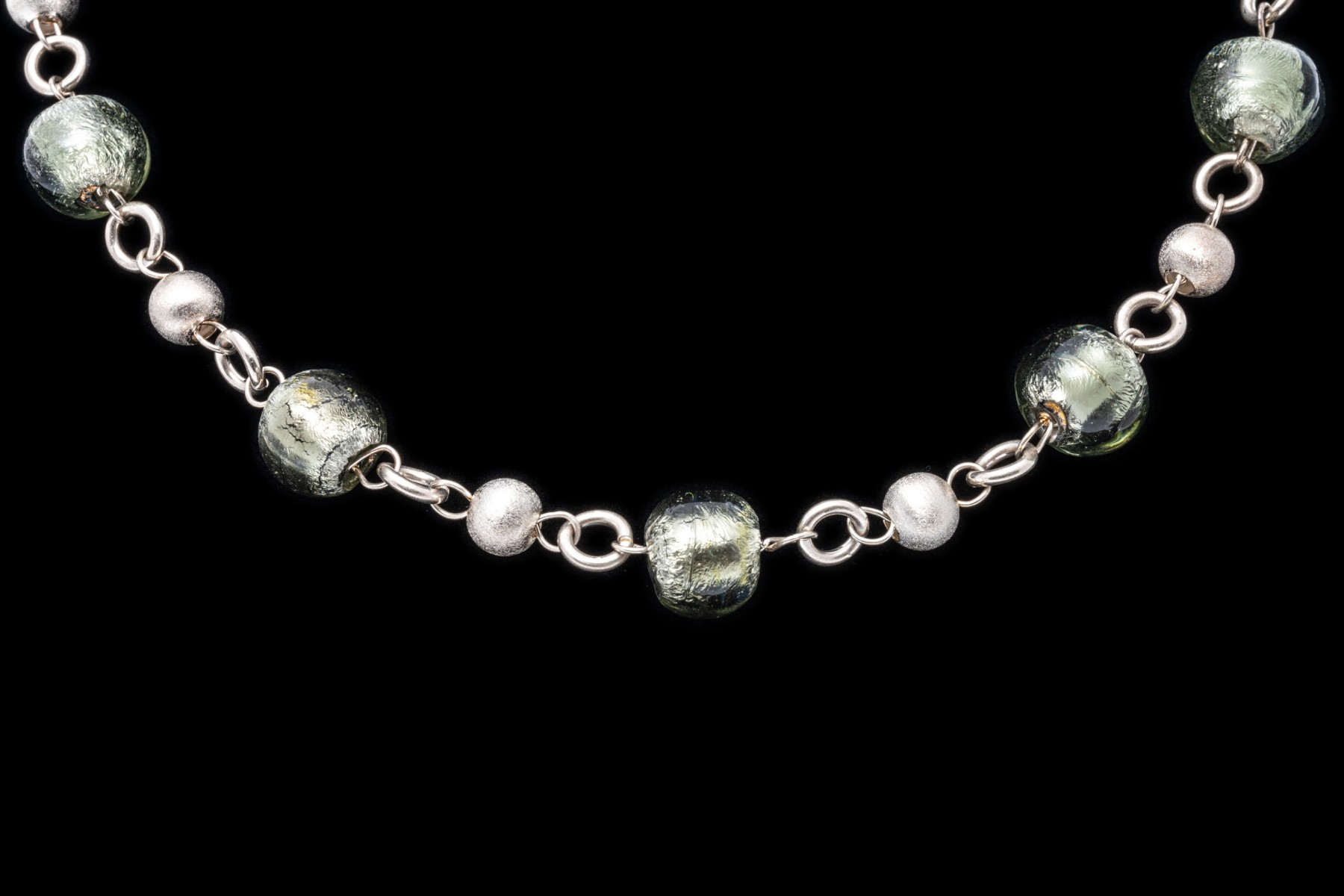 Sterling silver necklace. This beautiful necklace is a tin cup style, decorated with 11 mm iridescent silver green glass beads, alternating with 6 mm brushed silver beads and round open links. The necklace is finished by a lobster claw clasp.