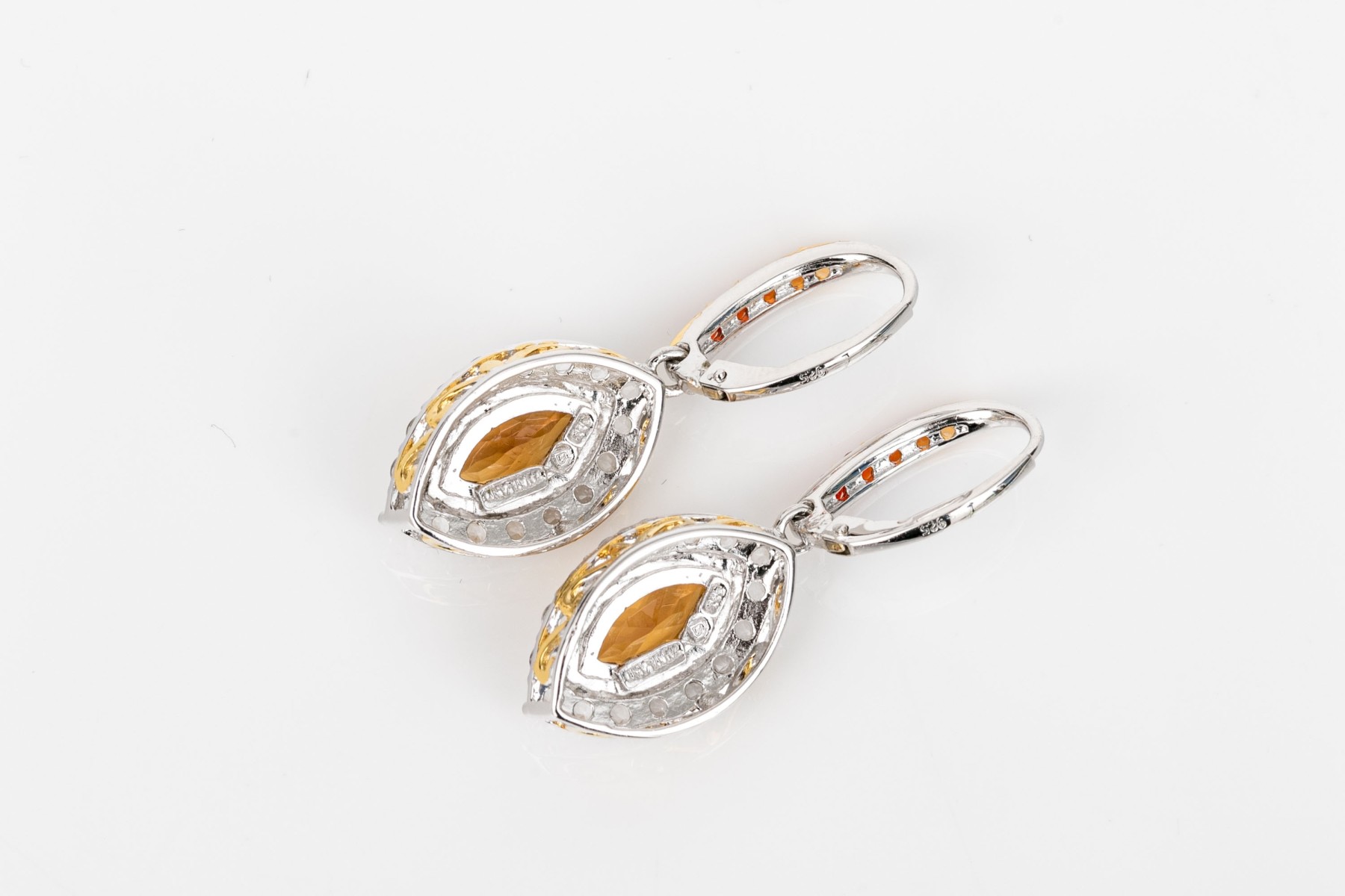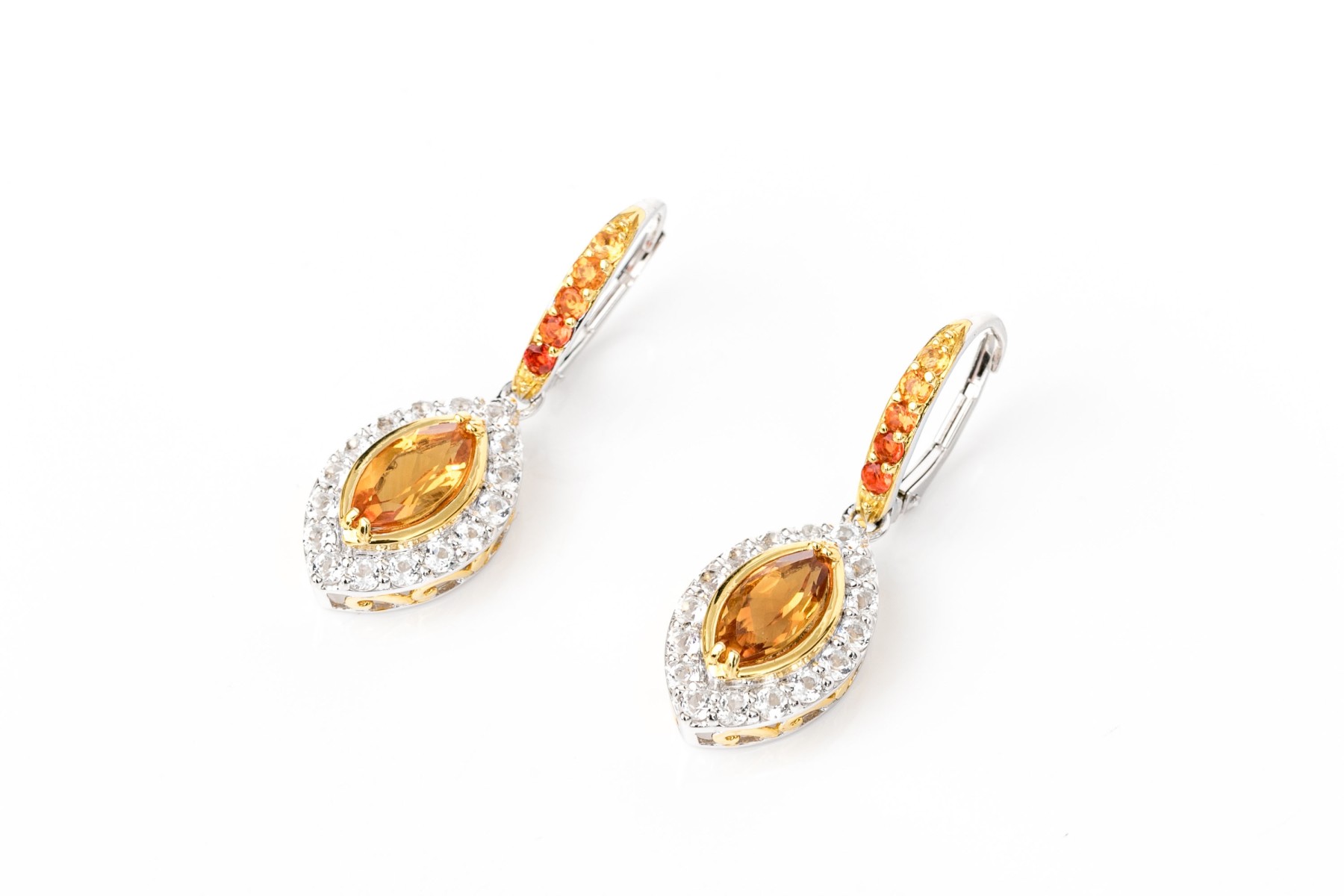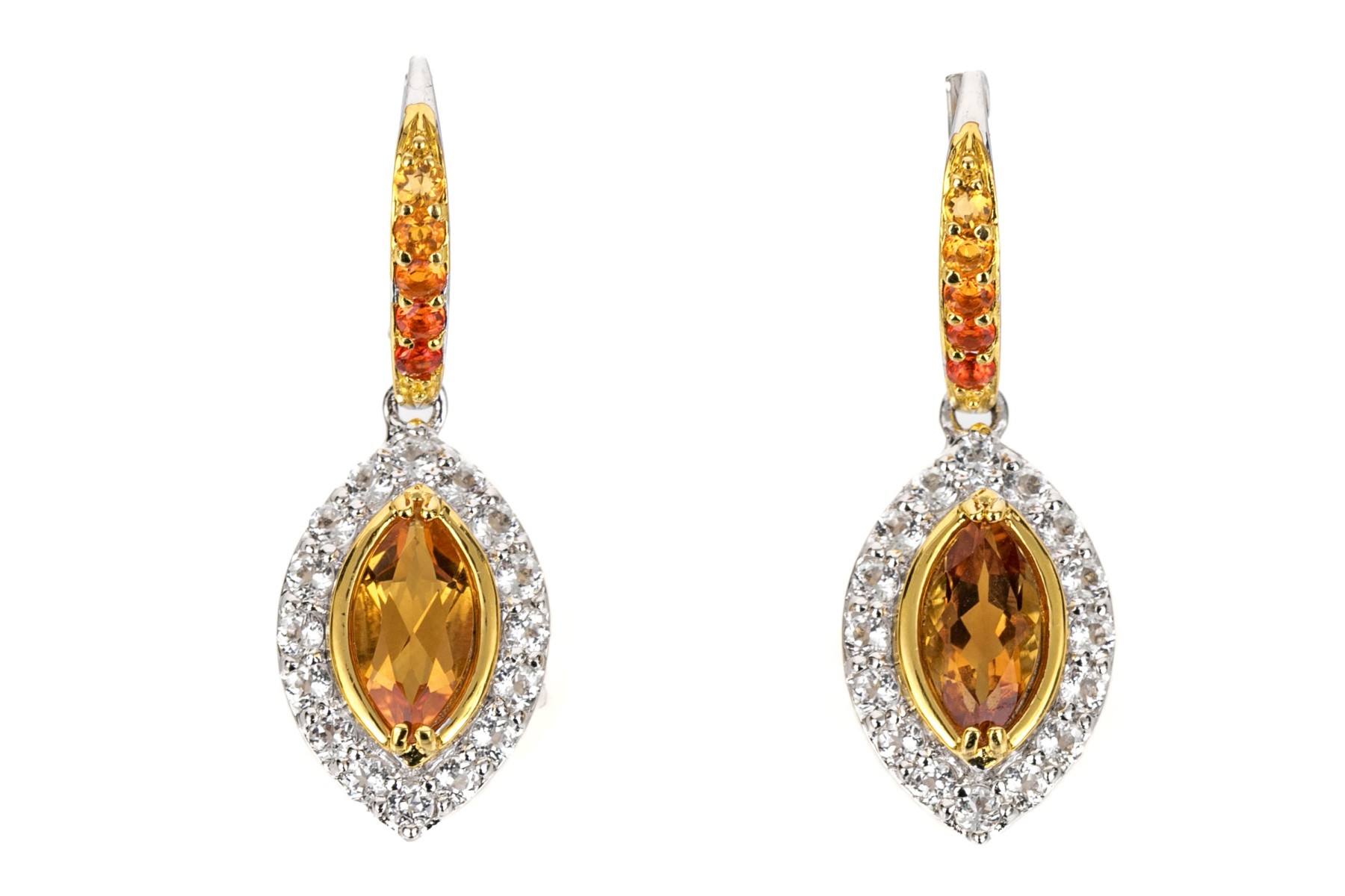 Sterling silver beautiful navette profile yellow and white CZ halo drop pendant earrings, finished with ombre cz set wires and lever style backs
