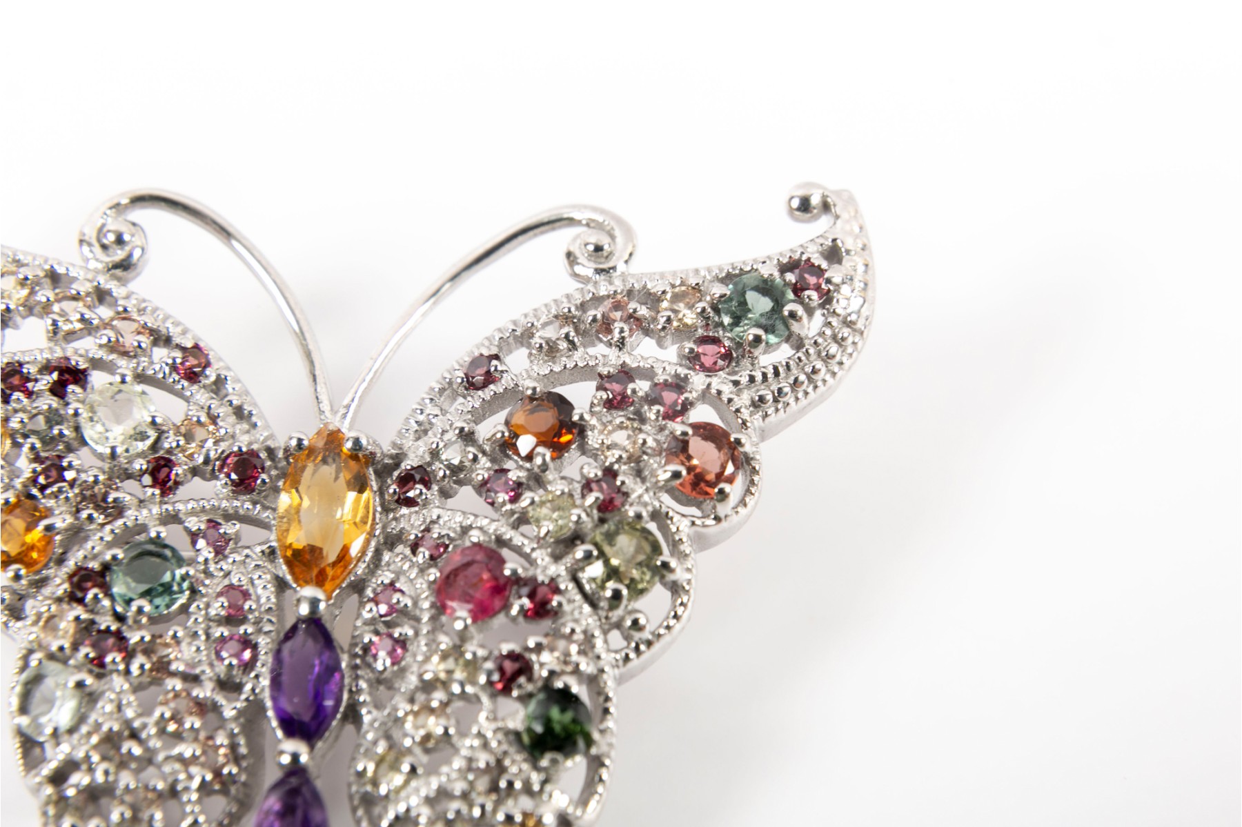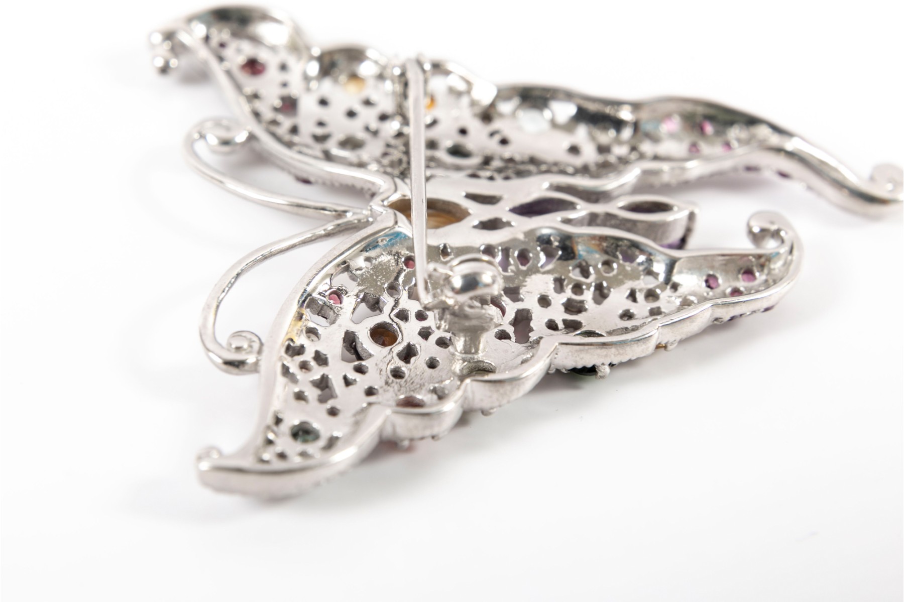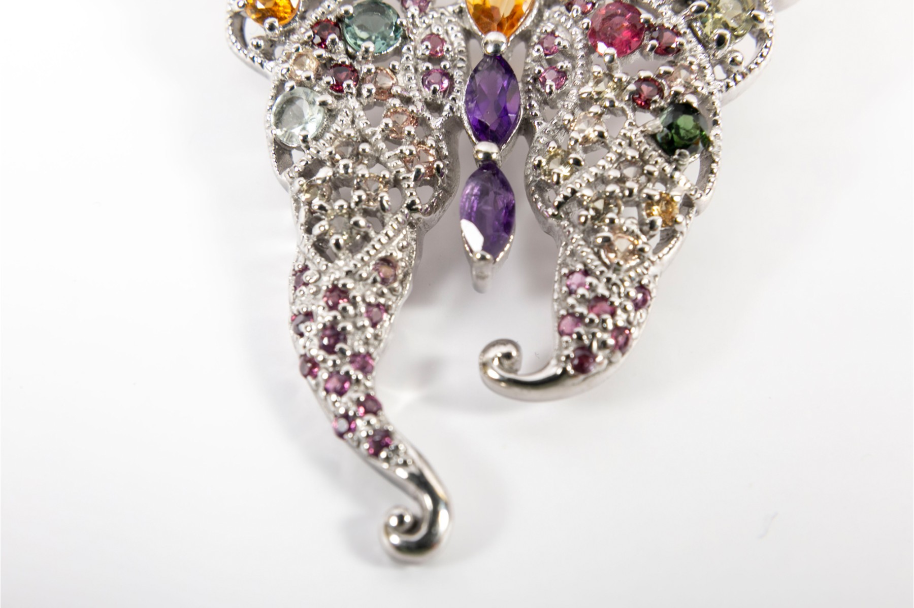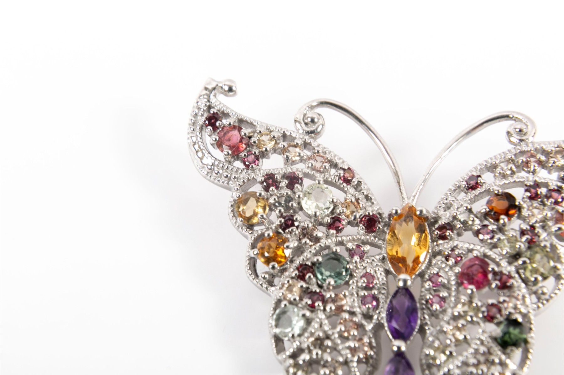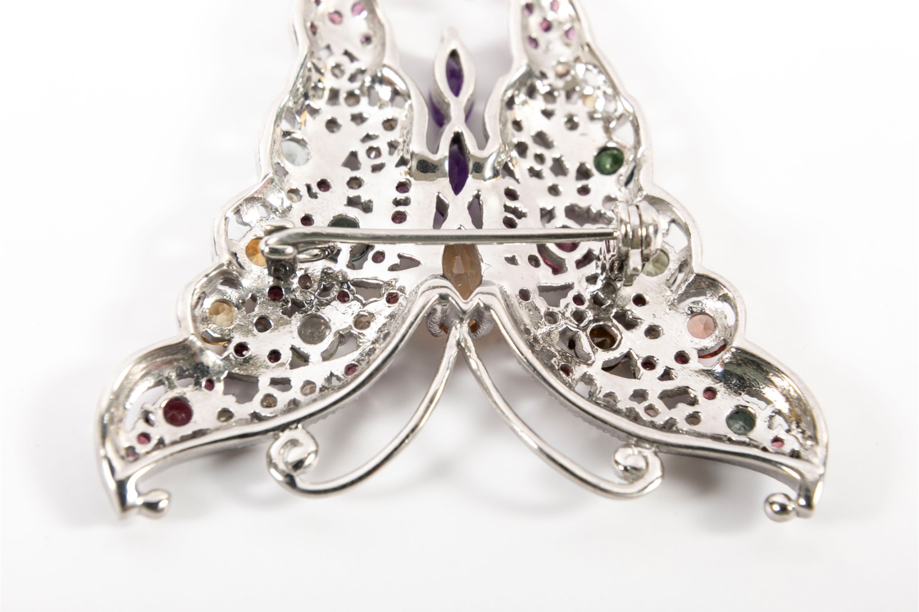 A sterling silver butterfly brooch heavily ornamented multi-colored Amethyst and citrines — creating a beautiful, eye catching ensemble.