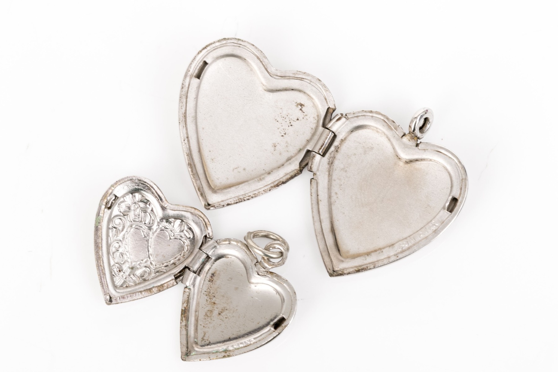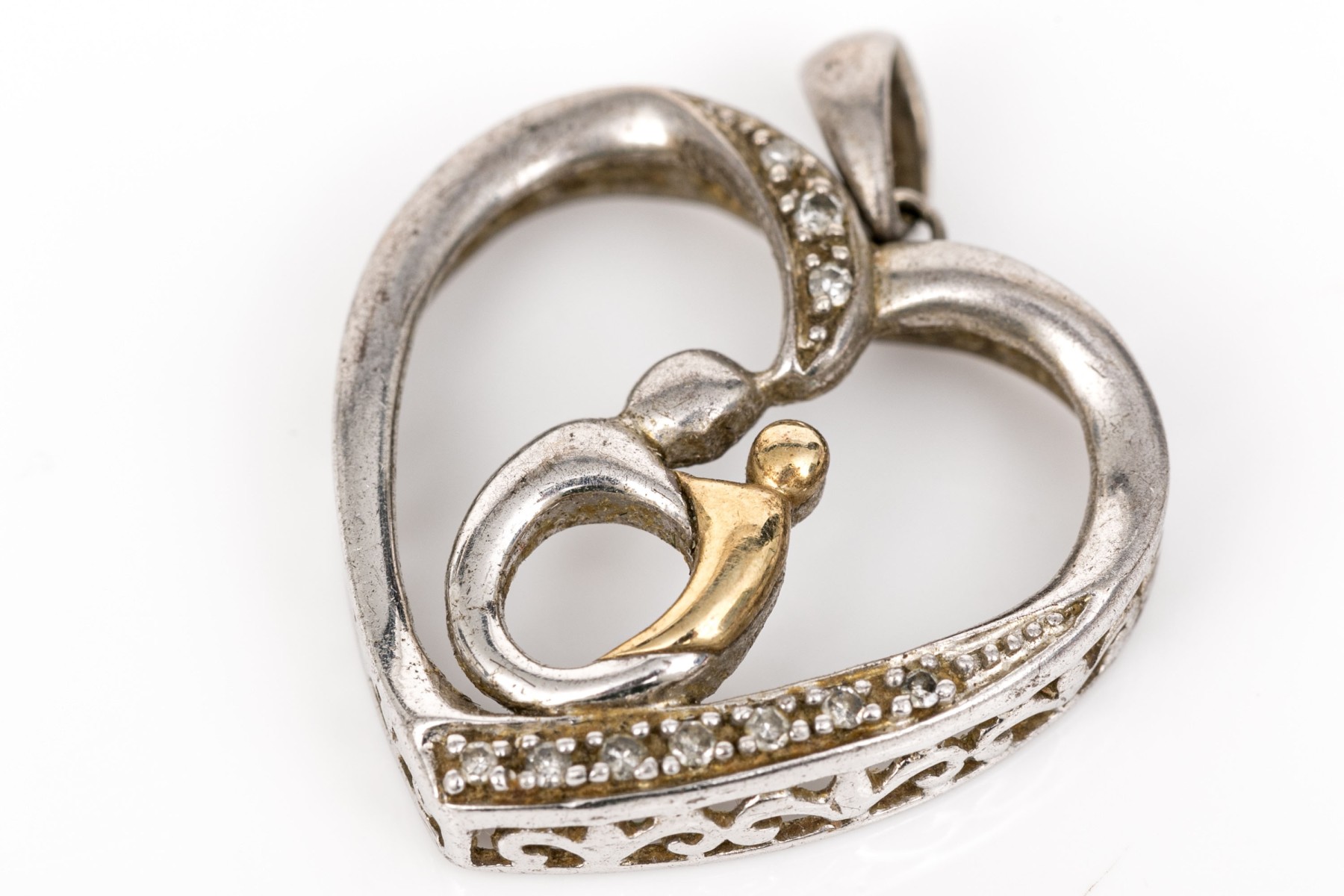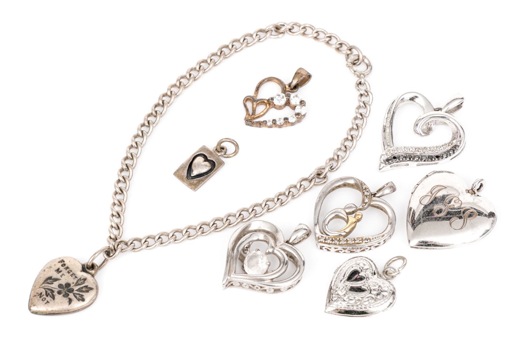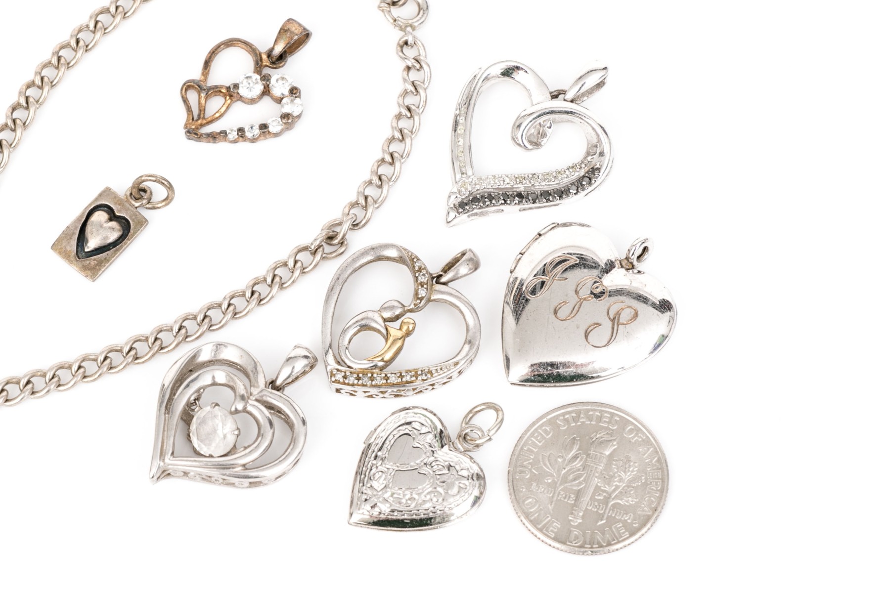 Sterling silver charm bracelet and heart themed loose sterling and silverplate charms and pendants, finished with a spring ring style clasp