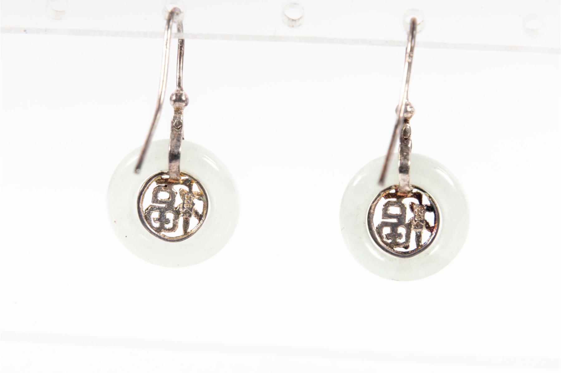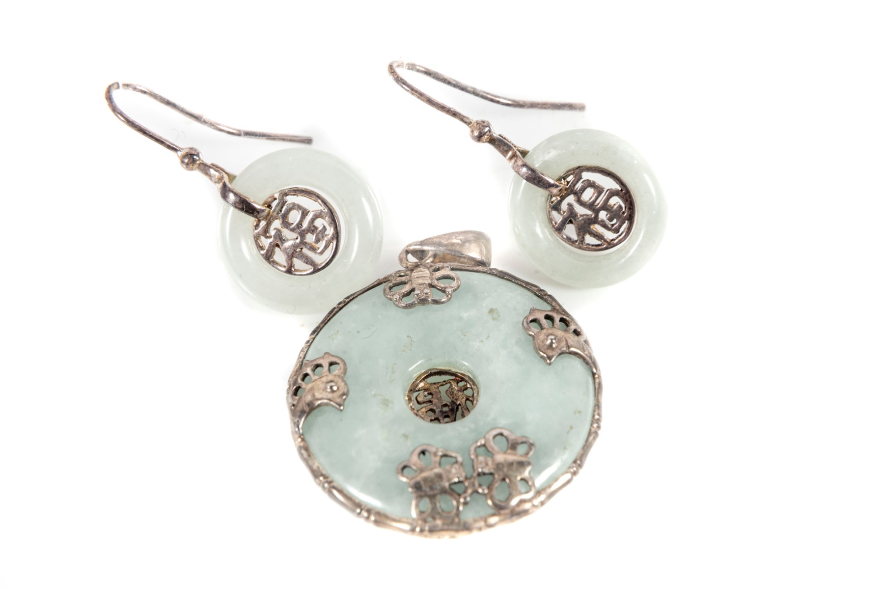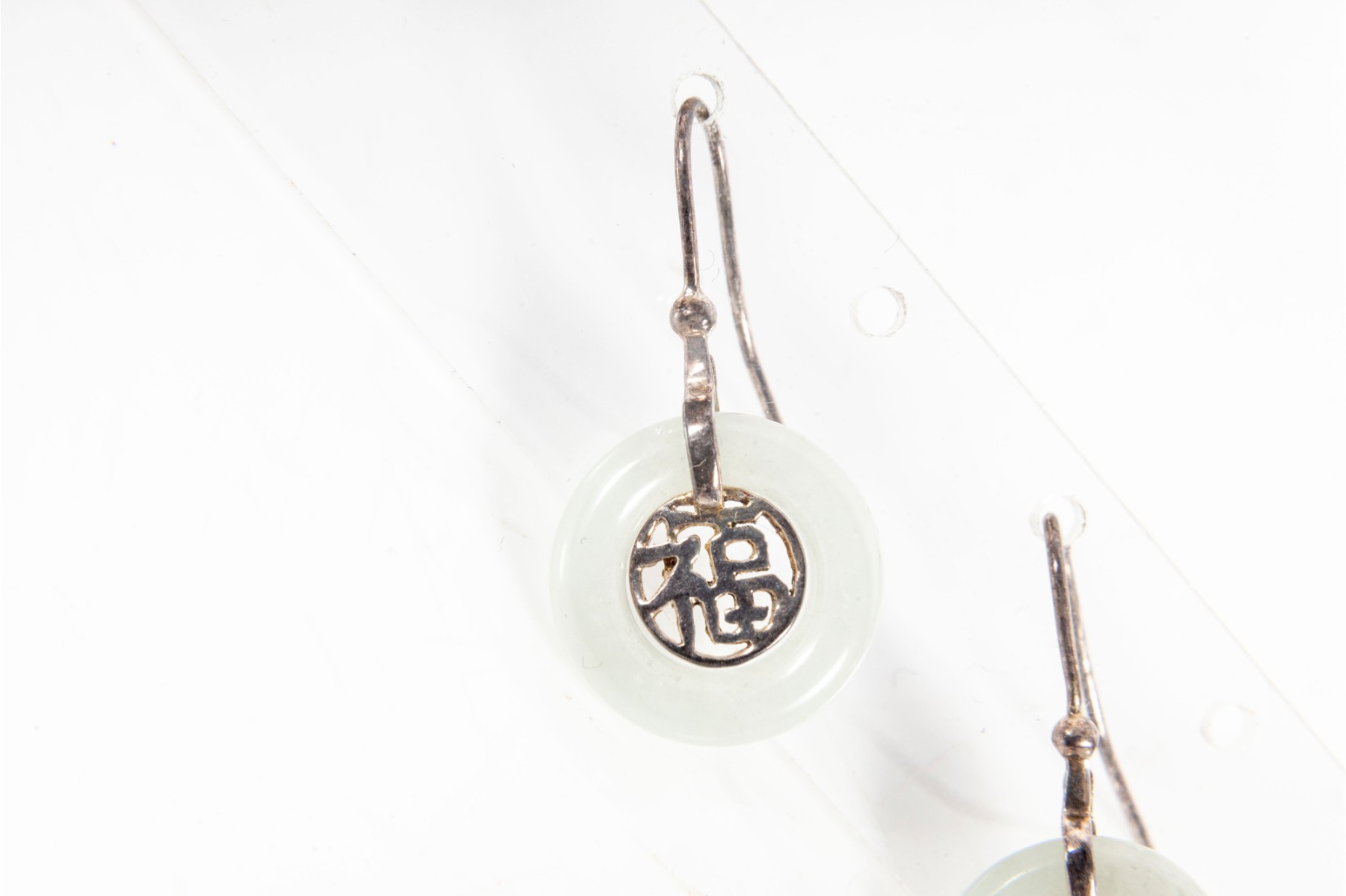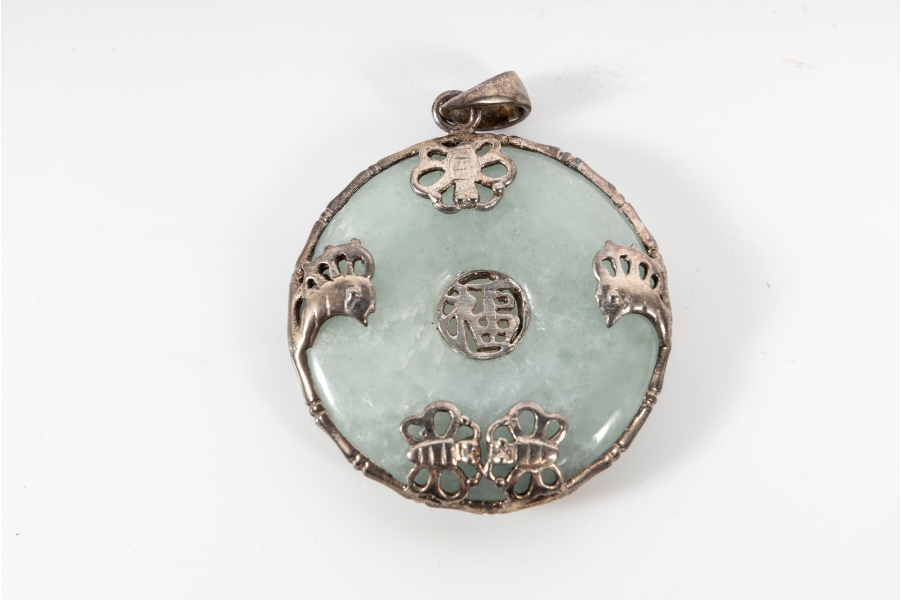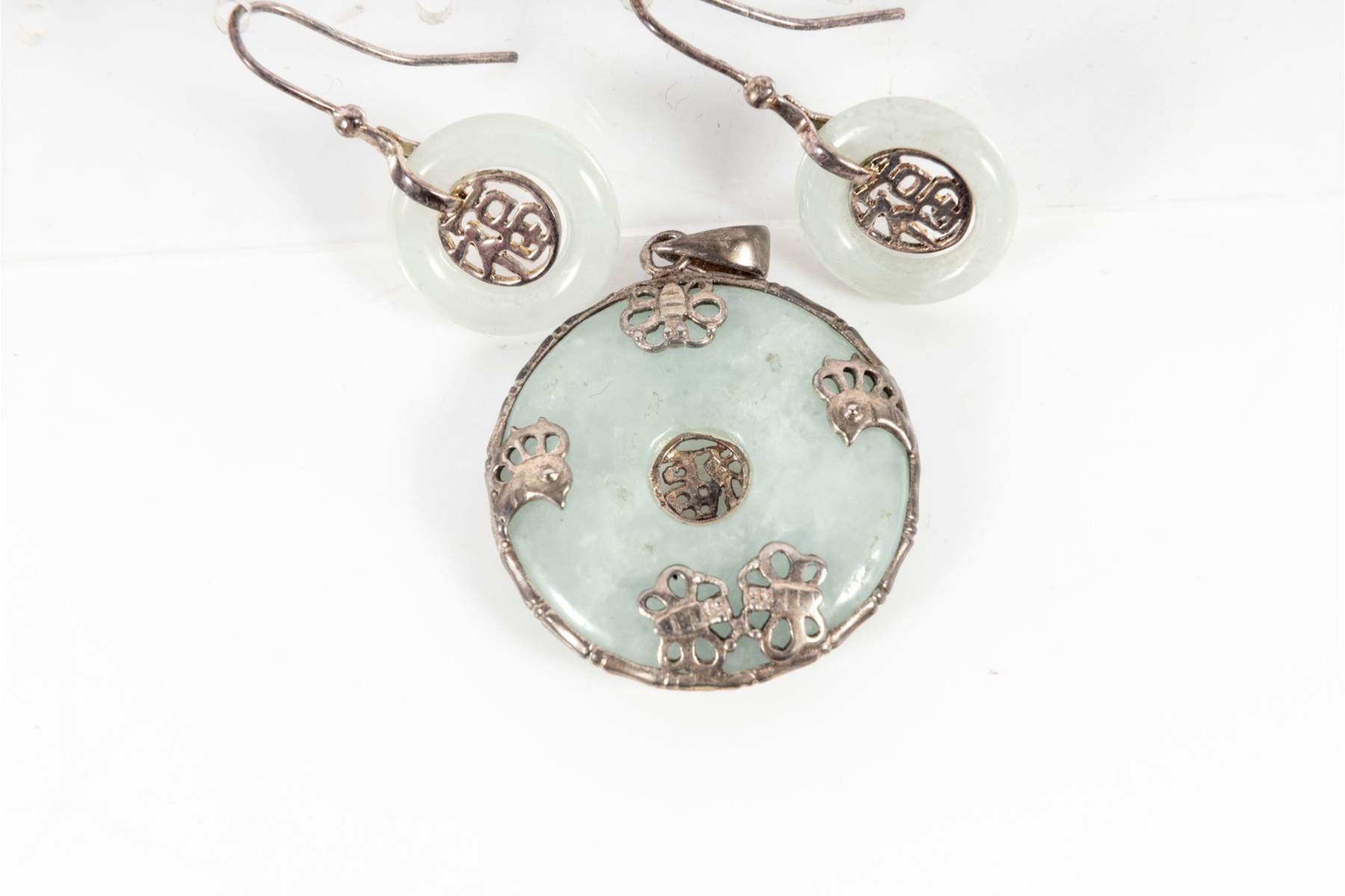 A lovely set of sterling silver and icy green jade jewelry including a pendant and a pair of earrings. The pendant features a bamboo-themed bezel setting with pierced moth motifs and a center fortune symbol, while the earrings feature stationary fortune symbols at the centers of dangling jade loops.