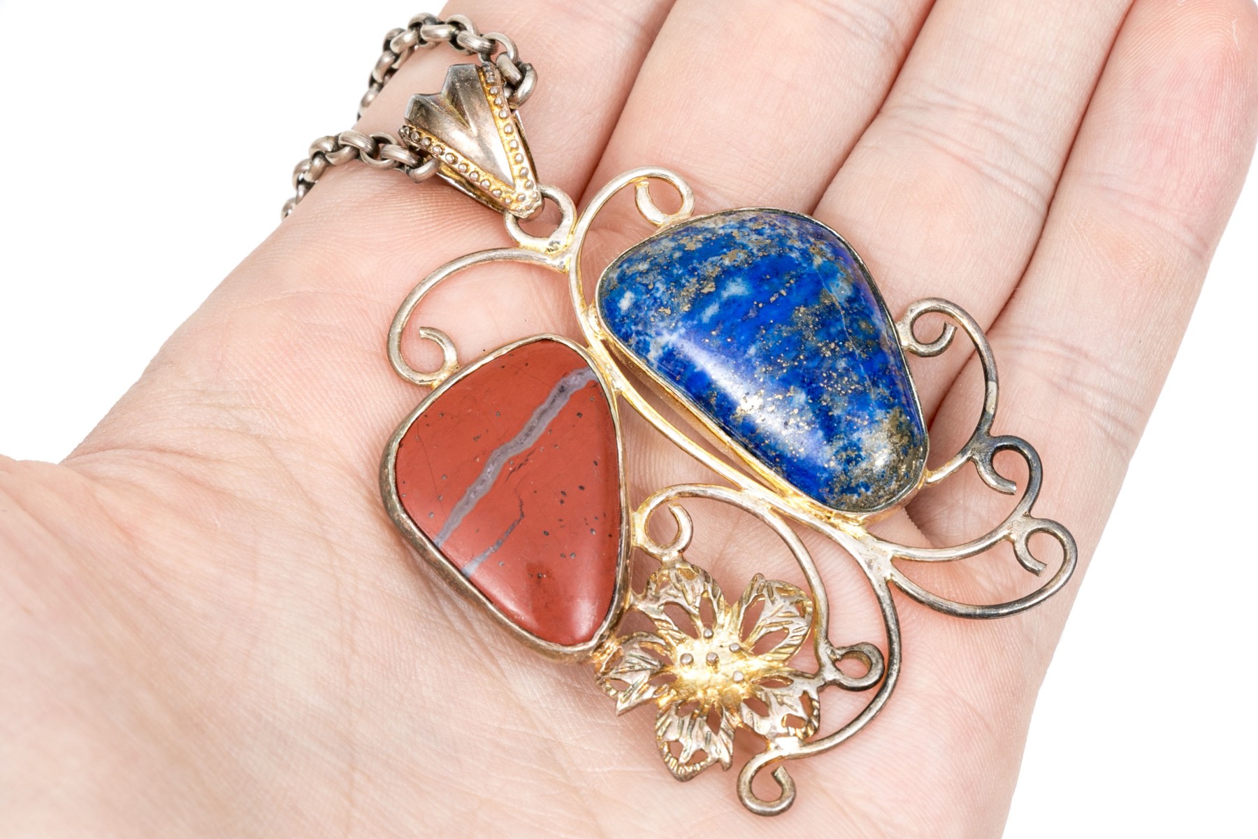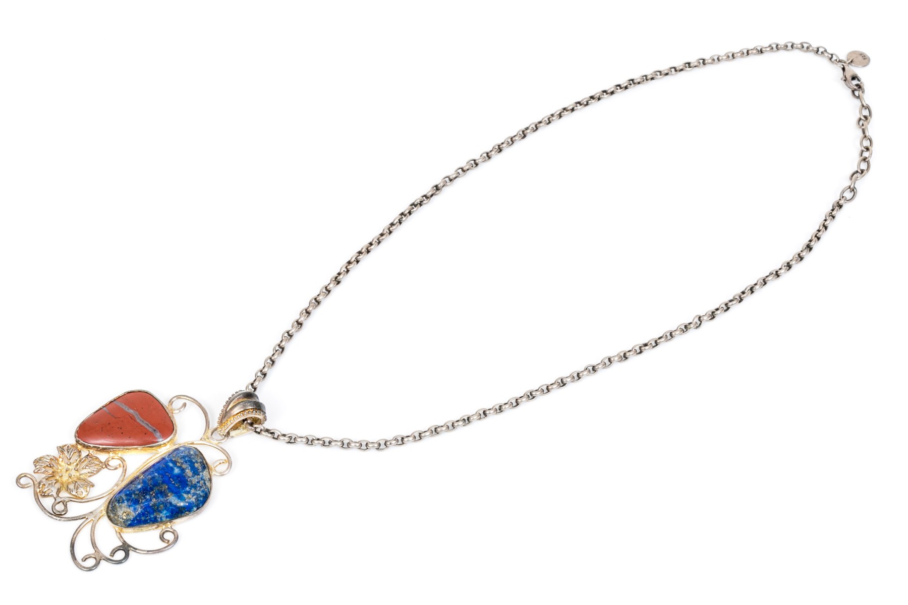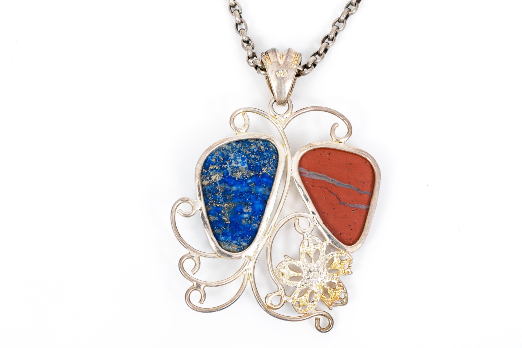 Sterling silver chunky curb chain with an impactul lapis and jasper pendant, finished with a lobster claw style clasp